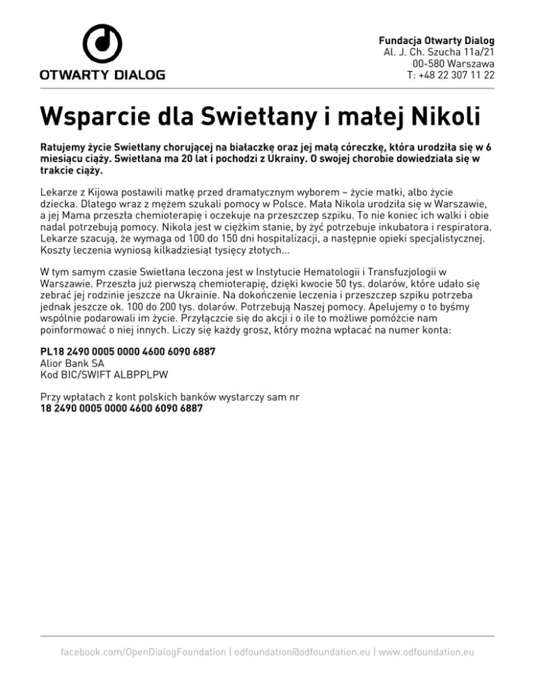 Fundacja Otwarty Dialog Al. J. Ch. Szucha 11a/21 00-580 Warszawa T: +48 22 307 11 22 Wsparcie dla Swietłany i małej Nikoli Ratujemy życie Swietłany chorującej na białaczkę oraz jej małą córeczkę, która urodziła się w 6 miesiącu ciąży. Swietłana ma 20 lat i pochodzi z Ukrainy. O swojej chorobie dowiedziała się w trakcie ciąży. Lekarze z Kijowa postawili matkę przed dramatycznym wyborem – życie matki, albo życie dziecka. Dlatego wraz z mężem szukali pomocy w Polsce. Mała Nikola urodziła się w Warszawie, a jej Mama przeszła chemioterapię i oczekuje na przeszczep szpiku. To nie koniec ich walki i obie nadal potrzebują pomocy. Nikola jest w ciężkim stanie, by żyć potrzebuje inkubatora i respiratora. Lekarze szacują, że wymaga od 100 do 150 dni hospitalizacji, a następnie opieki specjalistycznej. Koszty leczenia wyniosą kilkadziesiąt tysięcy złotych... W tym samym czasie Swietłana leczona jest w Instytucie Hematologii i Transfuzjologii w Warszawie. Przeszła już pierwszą chemioterapię, dzięki kwocie 50 tys. dolarów, które udało się zebrać jej rodzinie jeszcze na Ukrainie. Na dokończenie leczenia i przeszczep szpiku potrzeba jednak jeszcze ok. 100 do 200 tys. dolarów. Potrzebują Naszej pomocy. Apelujemy o to byśmy wspólnie podarowali im życie. Przyłączcie się do akcji i o ile to możliwe pomóżcie nam poinformować o niej innych. Liczy się każdy grosz, który można wpłacać na numer konta: PL18 2490 0005 0000 4600 6090 6887 Alior Bank SA Kod BIC/SWIFT ALBPPLPW Przy wpłatach z kont polskich banków wystarczy sam nr 18 2490 0005 0000 4600 6090 6887 facebook.com/OpenDialogFoundation | [email protected] | www.odfoundation.eu