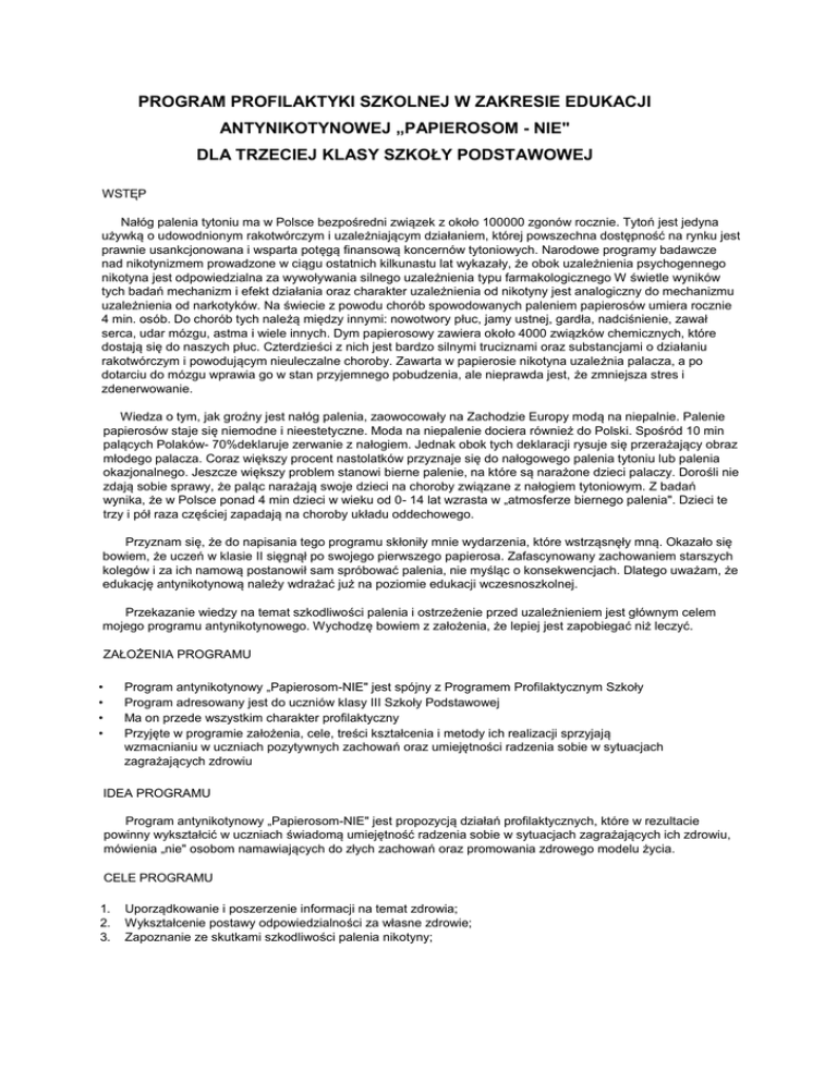 PROGRAM PROFILAKTYKI SZKOLNEJ W ZAKRESIE EDUKACJI ANTYNIKOTYNOWEJ „PAPIEROSOM - NIE" DLA TRZECIEJ KLASY SZKOŁY PODSTAWOWEJ WSTĘP Nałóg palenia tytoniu ma w Polsce bezpośredni związek z około 100000 zgonów rocznie. Tytoń jest jedyna używką o udowodnionym rakotwórczym i uzależniającym działaniem, której powszechna dostępność na rynku jest prawnie usankcjonowana i wsparta potęgą finansową koncernów tytoniowych. Narodowe programy badawcze nad nikotynizmem prowadzone w ciągu ostatnich kilkunastu lat wykazały, że obok uzależnienia psychogennego nikotyna jest odpowiedzialna za wywoływania silnego uzależnienia typu farmakologicznego W świetle wyników tych badań mechanizm i efekt działania oraz charakter uzależnienia od nikotyny jest analogiczny do mechanizmu uzależnienia od narkotyków. Na świecie z powodu chorób spowodowanych paleniem papierosów umiera rocznie 4 min. osób. Do chorób tych należą między innymi: nowotwory płuc, jamy ustnej, gardła, nadciśnienie, zawał serca, udar mózgu, astma i wiele innych. Dym papierosowy zawiera około 4000 związków chemicznych, które dostają się do naszych płuc. Czterdzieści z nich jest bardzo silnymi truciznami oraz substancjami o działaniu rakotwórczym i powodującym nieuleczalne choroby. Zawarta w papierosie nikotyna uzależnia palacza, a po dotarciu do mózgu wprawia go w stan przyjemnego pobudzenia, ale nieprawda jest, że zmniejsza stres i zdenerwowanie. Wiedza o tym, jak groźny jest nałóg palenia, zaowocowały na Zachodzie Europy modą na niepalnie. Palenie papierosów staje się niemodne i nieestetyczne. Moda na niepalenie dociera również do Polski. Spośród 10 min palących Polaków- 70%deklaruje zerwanie z nałogiem. Jednak obok tych deklaracji rysuje się przerażający obraz młodego palacza. Coraz większy procent nastolatków przyznaje się do nałogowego palenia tytoniu lub palenia okazjonalnego. Jeszcze większy problem stanowi bierne palenie, na które są narażone dzieci palaczy. Dorośli nie zdają sobie sprawy, że paląc narażają swoje dzieci na choroby związane z nałogiem tytoniowym. Z badań wynika, że w Polsce ponad 4 min dzieci w wieku od 0- 14 lat wzrasta w „atmosferze biernego palenia". Dzieci te trzy i pół raza częściej zapadają na choroby układu oddechowego. Przyznam się, że do napisania tego programu skłoniły mnie wydarzenia, które wstrząsnęły mną. Okazało się bowiem, że uczeń w klasie II sięgnął po swojego pierwszego papierosa. Zafascynowany zachowaniem starszych kolegów i za ich namową postanowił sam spróbować palenia, nie myśląc o konsekwencjach. Dlatego uważam, że edukację antynikotynową należy wdrażać już na poziomie edukacji wczesnoszkolnej. Przekazanie wiedzy na temat szkodliwości palenia i ostrzeżenie przed uzależnieniem jest głównym celem mojego programu antynikotynowego. Wychodzę bowiem z założenia, że lepiej jest zapobiegać niż leczyć. ZAŁOŻENIA PROGRAMU • • • • Program antynikotynowy „Papierosom-NIE" jest spójny z Programem Profilaktycznym Szkoły Program adresowany jest do uczniów klasy III Szkoły Podstawowej Ma on przede wszystkim charakter profilaktyczny Przyjęte w programie założenia, cele, treści kształcenia i metody ich realizacji sprzyjają wzmacnianiu w uczniach pozytywnych zachowań oraz umiejętności radzenia sobie w sytuacjach zagrażających zdrowiu IDEA PROGRAMU Program antynikotynowy „Papierosom-NIE" jest propozycją działań profilaktycznych, które w rezultacie powinny wykształcić w uczniach świadomą umiejętność radzenia sobie w sytuacjach zagrażających ich zdrowiu, mówienia „nie" osobom namawiających do złych zachowań oraz promowania zdrowego modelu życia. CELE PROGRAMU 1. 2. 3. Uporządkowanie i poszerzenie informacji na temat zdrowia; Wykształcenie postawy odpowiedzialności za własne zdrowie; Zapoznanie ze skutkami szkodliwości palenia nikotyny; 4. 5. 6. Radzenie sobie w sytuacjach , gdy inni palą i namawiają do palenia; Uwrażliwienie na szkodliwość dymu tytoniowego związanego z biernym paleniem; Wyrabianie nawyków zdrowego stylu życia; TREŚCI PROGRAMU Treści programu dobrane są w taki sposób, aby były ciekawe, rozwijały myślenie, pobudzały wyobraźnię i zachęcały uczniów do działania. Obejmują następującą tematykę: • • • Co szkodzi naszemu zdrowiu? Co się dzieje gdy ludzie palą papierosy? Nie pozwalam palić w mojej obecności. METODY I FORMY PRACY Młodszy wiek szkolny to okres, w którym dzieci poznają otaczający je świat poprzez działanie, to również okres wzmożonej aktywności twórczej. Dlatego bardzo ważnym elementem jest właściwy dobór metod i form pracy. Uwzględniając następujące aspekty proponuję stosowanie • • • • • metod aktywizujących ( metoda graffiti, burza mózgów, drama, piramida priorytetów) metod poglądowych metod ewaluacyjnych system zdobywania sprawności np. „Mały strażnik zdrowia" inne np. quiz „Czy potrafię dbać o swoje zdrowie" FORMY ORGANIZACYJNE Przewiduje się wykorzystanie wszystkich możliwych form pracy, w tym: • • • pracy indywidualnej pracy zbiorowej pracy w grupie i w zespole ŚRODKI DYDAKTYCZNE 1. 2. 3. 4. 5. 6. 7. 8. 9. 10 11. 12. . Wykreślanka, książki, encyklopedie, kaseta z nagraniem, kaseta z filmem. historyjka obrazkowa, karty pracy, puzzle, schemat ciała palacza, kartoniki z napisami, , ilustracje do zajęć, . przykładowy list do palacza . quiz. UWAGI O REALIZACJI PROGRAMU Na realizację programu składają się: • • spotkania z rodzicami trzy zajęcia zintegrowane Realizację programu założyłam na drugie półrocze trzeciej klasy. Terminy realizacji poszczególnych tematów nie są sztywne i pozostawiają swobodę ich stosowania w planie dydaktyczno-wychowawczym klasy. REALIZACJA ZADAŃ PROGRAMOWYCH PRZEWIDYWANE LPTREŚCI PROCEDURY OSIĄGANIA KSZTAŁCENIA CELÓW OSIĄGNIĘCIA 1, Co szkodzi Wykreślanka, kt