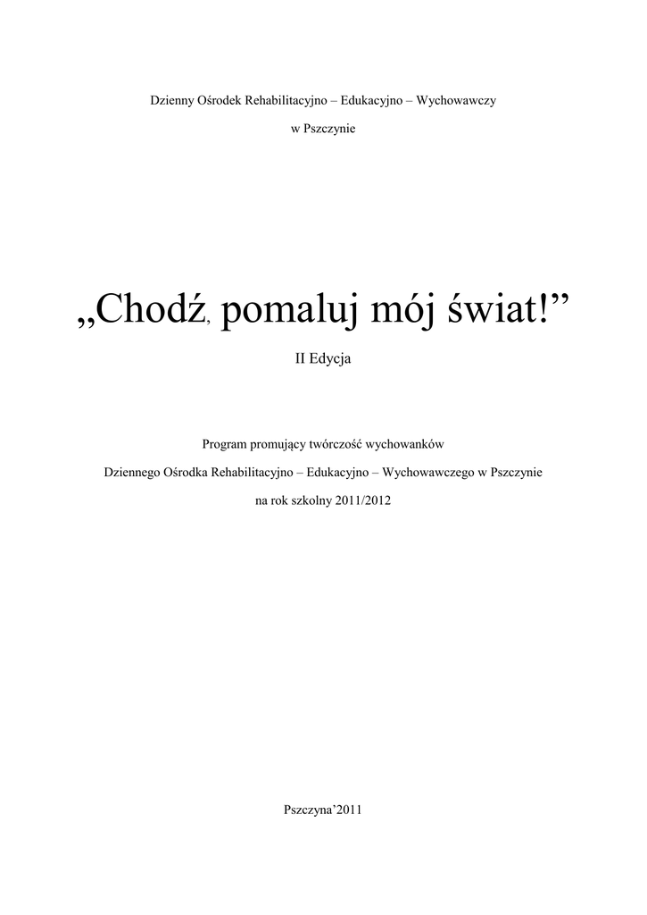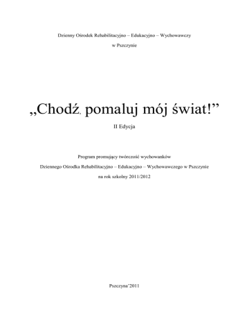 Dzienny Ośrodek Rehabilitacyjno – Edukacyjno – Wychowawczy w Pszczynie „Chodź, pomaluj mój świat!” II Edycja Program promujący twórczość wychowanków Dziennego Ośrodka Rehabilitacyjno – Edukacyjno – Wychowawczego w Pszczynie na rok szkolny 2011/2012 Pszczyna’2011 Wstęp Człowiek osiąga spokój, Gdy tworzy bez przerwy; Nie mając mądrości świat roślin, Chce kwitnąć o każdej porze. Życiu człowieka, który tworzy, Towarzyszy jakby radosne bicie dzwonów... /A. Honegger/ Praca edukacyjna i terapeutyczna w Ośrodku podczas zajęć edukacyjno – terapeutycznych i rewalidacyjno – wychowawczych jest ukierunkowana na rozwój każdego dziecka, poprzez zdobywanie doświadczenia: manualnego, kinestetycznego, sensorycznego, wyobrażeniowego, emocjonalnego. Radość tworzenia jest dla dziecka zawsze przyjemnym przeżyciem. Zdolność do tworzenia czegoś własnymi rękami daje wychowankom wiele zadowolenia. Dla dzieci z ograniczonymi zdolnościami intelektualnymi terapia przez sztukę może stać się żywym, zrozumiałym doświadczeniem. Może pobudzić je do aktywności i emocjonalnego zaangażowania się do tego co robią i przyczynić się do lepszego funkcjonowania w społeczności. Zajęcia plastyczne odgrywają w życiu dziecka dużą rolę. Pozwalają wychowankom na utrwalanie zdobytej wiedzy, budzą zainteresowania otaczającym światem, umożliwiają rozwój wyobraźni, spostrzegawczości, pomysłowości, pozwalają wyrażać emocje poprzez sztukę. Celem programu „Chodź pomaluj mój świat” jest promowanie twórczości wychowanków Dziennego Ośrodka Rehabilitacyjno – Edukacyjno – Wychowawczego w Pszczynie. Poniżej przedstawiam część teoretyczną na temat niepełnosprawności oraz twórczości osób niepełnosprawnych. Druga część zawiera cele i planowany przebieg programu „Chodź pomaluj mój świat”. Kolejny rozdział to sprawozdanie z realizacji programu. 2 Rozdział I Pojęcie niepełnosprawności intelektualnej Osoby niepełnosprawne to takie, których sprawność fizyczna, psychiczna lub umysłowa trwale lub okresowo utrudnia, ogranicza lub uniemożliwia życie codzienne, naukę, pracę oraz pełnienie ról społecznych, zgodnie z normami prawnymi i zwyczajowymi mają prawo do niezależnego, samodzielnego życia oraz nie mogą podlegać dyskryminacji1. „Pojęcie niepełnosprawności obejmuje różne ograniczenia funkcjonalne jednostek ludzkich w każdym społeczeństwie, wynikające z uszkodzenia zdolności wykonywania jakiejś czynności w sposób uważany za normalny, typowy dla ludzkiego życia. Ograniczenia te mogą mieć charakter stały lub przejściowy, całkowity lub częściowy, mogą dotyczyć sfery sensorycznej, fizycznej i psychicznej”2. „Przez niedorozwój umysłowy rozumie się niższą od przeciętnej ogólną sprawność intelektualną, która powstała w okresie rozwojowym i jest związana z jednym lub więcej zaburzeniami w zakresie: dojrzewania, uczenia się i społecznego przystosowania”3. J. Kostrzewski definiuje upośledzenie umysłowo jako: „istotnie niższy od przeciętnego, co najmniej o dwa odchylenia standardowe, poziom funkcjonowania intelektualnego o charakterze globalnym wraz z zaburzeniami w zakresie dojrzewania, uczenia się i przystosowania społecznego, spowodowane przez czynniki genetyczne i egzogeniczne na podłożu względnie trwałych zmian w ośrodkowym układzie nerwowym”4. Światowa Organizacja Zdrowia upośledzenie umysłowe definiuje jako „istotne obniżenie ogólnego poziomu funkcjonowania intelektualnego oraz trudności w zachowaniu przystosowawczym, występujące przed 18 rokiem życia”5. Pojęcie upośledzenie umysłowe jest często zamiennie używane z takimi pojęciami jak: niedorozwój umysłowy, zahamowanie rozwoju umysłowego, obniżenie sprawności 1 Uchwała Sejmu RP z dnia 1.08.1997 r. Karta Praw Osób Niepełnosprawnych. W. Dykcik (red.): Pedagogika specjalna. Poznań 2001, s. 15. 3 A.B. Clarke, A.M. Clarke: Upośledzenie umysłowe. Nowe poglądy. Warszawa 1969, s. 69. 4 J. Kostrzewski: Podstawowe wiadomości o upośledzeniu umysłowym. (W:) K. Kirejczyk (red.): Upośledzenie umysłowe-pedagogika. Warszawa 1981, s.36. 5 za: I. Obuchowska: Dzieci upośledzone umysłowo w stopniu lekkim. (W:) I. Obuchowska (red.): Dziecko niepełnosprawne w rodzinie. Warszawa 1995, s. 206. 2 3 intelektualnej, a także ostatnio zaburzenia w uczeniu się. Jednakże istnieje tendencja do preferowania terminu niepełnosprawność umysłowa lub intelektualna6. Tabela 1 Klasyfikacja upośledzenia umysłowego wg IX Rewizji Międzynarodowej Klasyfikacji Chorób, Urazów i Przyczyn Zgonów, obowiązująca od 1.01.1980 roku Odchylenie standardowe Stopień upośledzenia Iloraz inteligencji wg Wechslera ≥ -1 Rozwój niższy niż przeciętny (dolna granica normy) 85-110 Od –1 do –2 Rozwój niższy niż przeciętny (górna granica normy) 70-84 Od –2 do –3 Niepełnosprawność w stopniu lekkim 55-69 Od –3 do –4 Niepełnosprawność umysłowa w stopniu umiarkowanym Od –4 do –5 Niepełnosprawność w stopniu znacznym umysłowa Niepełnosprawność w stopniu głębokim umysłowa < -5 umysłowa 40-54 25-39 0-24 Źródło: J. Wyczesany: Pedagogika osób z lekkim upośledzeniem umysłowym. M. Bogdanowicz porównuje symptomy różnych stopni niepełnosprawności intelektualnej. Tabela 2 Symptomatologia stopni upośledzenia umysłowego Stopnie Upośledzenie w stopniu lekkim Upośledzenie w stopniu umiarkowanym Upośledzenie w stopniu znacznym Upośledzenie w stopniu głębokim Procesy instrumentalne Procesy orientacyjne: spostrzeganie 6 Sprawność spostrzegania zasadniczo w normie. Wolny tok spostrzegania. Spostrzeżenia nieprecyzyjne, trudności z wyróżnianiem Obniżona sprawność spostrzegania. Spostrzega cechy konkretne, nie odróżnia cech ważnych. Znacznie obniżona sprawność i szybkość spostrzegania. Spostrzeżenia niedokładne. Trudności Głęboko zaburzona sprawno