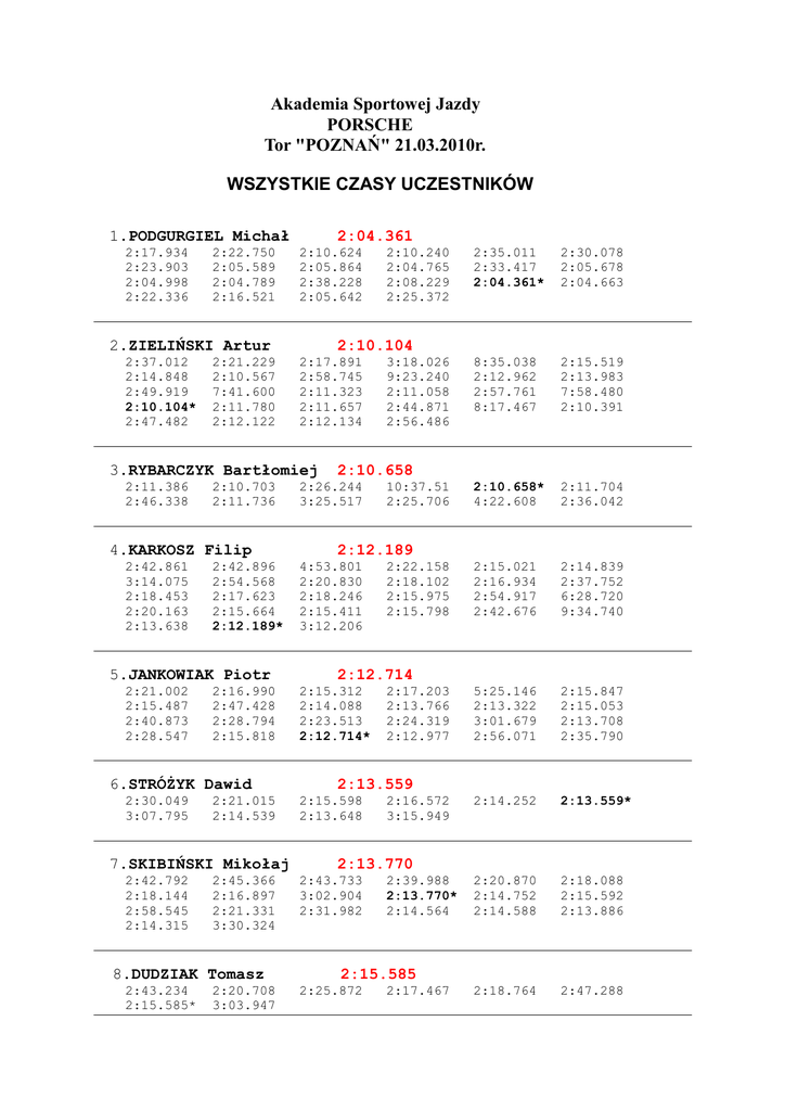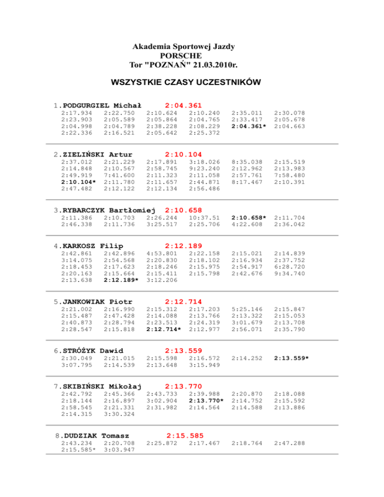 Akademia Sportowej Jazdy PORSCHE Tor "POZNAŃ" 21.03.2010r. WSZYSTKIE CZASY UCZESTNIKÓW 1.PODGURGIEL Michał 2:17.934 2:23.903 2:04.998 2:22.336 2:22.750 2:05.589 2:04.789 2:16.521 2:04.361 2:10.624 2:05.864 2:38.228 2:05.642 2.ZIELIŃSKI Artur 2:37.012 2:14.848 2:49.919 2:10.104* 2:47.482 2:21.229 2:10.567 7:41.600 2:11.780 2:12.122 2:10.240 2:04.765 2:08.229 2:25.372 3:18.026 9:23.240 2:11.058 2:44.871 2:56.486 2:10.658 4.KARKOSZ Filip 2:12.189 2:42.861 3:14.075 2:18.453 2:20.163 2:13.638 2:10.703 2:11.736 2:42.896 2:54.568 2:17.623 2:15.664 2:12.189* 5.JANKOWIAK Piotr 2:21.002 2:15.487 2:40.873 2:28.547 2:16.990 2:47.428 2:28.794 2:15.818 6.STRÓŻYK Dawid 2:30.049 3:07.795 2:21.015 2:14.539 7.SKIBIŃSKI Mikołaj 2:42.792 2:18.144 2:58.545 2:14.315 2:45.366 2:16.897 2:21.331 3:30.324 8.DUDZIAK Tomasz 2:43.234 2:15.585* 2:20.708 3:03.947 2:30.078 2:05.678 2:04.663 8:35.038 2:12.962 2:57.761 8:17.467 2:15.519 2:13.983 7:58.480 2:10.391 2:10.658* 4:22.608 2:11.704 2:36.042 2:15.021 2:16.934 2:54.917 2:42.676 2:14.839 2:37.752 6:28.720 9:34.740 5:25.146 2:13.322 3:01.679 2:56.071 2:15.847 2:15.053 2:13.708 2:35.790 2:14.252 2:13.559* 2:20.870 2:14.752 2:14.588 2:18.088 2:15.592 2:13.886 2:18.764 2:47.288 2:10.104 2:17.891 2:58.745 2:11.323 2:11.657 2:12.134 3.RYBARCZYK Bartłomiej 2:11.386 2:46.338 2:35.011 2:33.417 2:04.361* 2:26.244 3:25.517 4:53.801 2:20.830 2:18.246 2:15.411 3:12.206 10:37.51 2:25.706 2:22.158 2:18.102 2:15.975 2:15.798 2:12.714 2:15.312 2:14.088 2:23.513 2:12.714* 2:17.203 2:13.766 2:24.319 2:12.977 2:13.559 2:15.598 2:13.648 2:16.572 3:15.949 2:13.770 2:43.733 3:02.904 2:31.982 2:39.988 2:13.770* 2:14.564 2:15.585 2:25.872 2:17.467 9.FULNECZEK Adam 2:24.227 2:29.547 4:27.242 2:16.949* 2:17.980 2:22.640 2:22.591 2:25.560 2:18.425 2:18.973 10.SZLOŃSKI Dominik 2:39.424 2:28.556 4:37.574 2:24.954* 2:36.508 2:33.590 7:02.014 3:08.264 2:16.949 2:28.248 2:19.681 5:43.093 2:28.429 2:19.138 2:23.336 2:36.073 2:20.128 2:22.549 3:14.735 2:24.954 2:32.756 2:38.264 2:31.393 2:24.954* 2:35.137 29:51.01 2:28.876 3:08.264 Ostatnia modyfikacja: 2010-03-21 22:47:02 Wykonanie : Chrono Poznań TOMEX 2:32.922 2:23.269 2:19.086 2:18.911 2:20.639 2:27.861 2:18.234 2:17.252 8:25.195 2:32.820 2:29.642 2:37.464