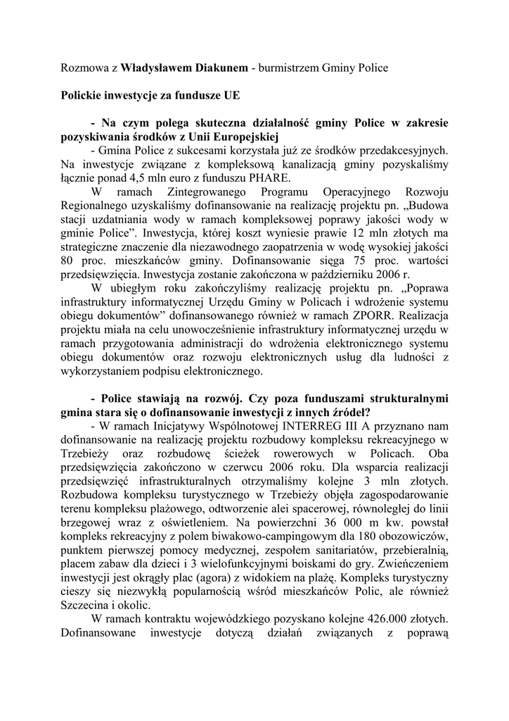Rozmowa z Władysławem Diakunem - burmistrzem Gminy Police Polickie inwestycje za fundusze UE - Na czym polega skuteczna działalność gminy Police w zakresie pozyskiwania środków z Unii Europejskiej - Gmina Police z sukcesami korzystała juŜ ze środków przedakcesyjnych. Na inwestycje związane z kompleksową kanalizacją gminy pozyskaliśmy łącznie ponad 4,5 mln euro z funduszu PHARE. W ramach Zintegrowanego Programu Operacyjnego Rozwoju Regionalnego uzyskaliśmy dofinansowanie na realizację projektu pn. „Budowa stacji uzdatniania wody w ramach kompleksowej poprawy jakości wody w gminie Police”. Inwestycja, której koszt wyniesie prawie 12 mln złotych ma strategiczne znaczenie dla niezawodnego zaopatrzenia w wodę wysokiej jakości 80 proc. mieszkańców gminy. Dofinansowanie sięga 75 proc. wartości przedsięwzięcia. Inwestycja zostanie zakończona w październiku 2006 r. W ubiegłym roku zakończyliśmy realizację projektu pn. „Poprawa infrastruktury informatycznej Urzędu Gminy w Policach i wdroŜenie systemu obiegu dokumentów” dofinansowanego równieŜ w ramach ZPORR. Realizacja projektu miała na celu unowocześnienie infrastruktury informatycznej urzędu w ramach przygotowania administracji do wdroŜenia elektronicznego systemu obiegu dokumentów oraz rozwoju elektronicznych usług dla ludności z wykorzystaniem podpisu elektronicznego. - Police stawiają na rozwój. Czy poza funduszami strukturalnymi gmina stara się o dofinansowanie inwestycji z innych źródeł? - W ramach Inicjatywy Wspólnotowej INTERREG III A przyznano nam dofinansowanie na realizację projektu rozbudowy kompleksu rekreacyjnego w TrzebieŜy oraz rozbudowę ścieŜek rowerowych w Policach. Oba przedsięwzięcia zakończono w czerwcu 2006 roku. Dla wsparcia realizacji przedsięwzięć infrastrukturalnych otrzymaliśmy kolejne 3 mln złotych. Rozbudowa kompleksu turystycznego w TrzebieŜy objęła zagospodarowanie terenu kompleksu plaŜowego, odtworzenie alei spacerowej, równoległej do linii brzegowej wraz z oświetleniem. Na powierzchni 36 000 m kw. powstał kompleks rekreacyjny z polem biwakowo-campingowym dla 180 obozowiczów, punktem pierwszej pomocy medycznej, zespołem sanitariatów, przebieralnią, placem zabaw dla dzieci i 3 wielofunkcyjnymi boiskami do gry. Zwieńczeniem inwestycji jest okrągły plac (agora) z widokiem na plaŜę. Kompleks turystyczny cieszy się niezwykłą popularnością wśród mieszkańców Polic, ale równieŜ Szczecina i okolic. W ramach kontraktu wojewódzkiego pozyskano kolejne 426.000 złotych. Dofinansowane inwestycje dotyczą działań związanych z poprawą infrastruktury obiektu sportowego przy filii SP 8 w Policach oraz dalszym rozwojem turystyki i zostaną zrealizowane jeszcze w bieŜącym roku. - Jak gmina Police przygotowuje się do nowego okresu programowania środków Unii Europejskiej? - W celu efektywnego aplikowania o fundusze europejskie zaplanowane na lata 2007-2013 przygotowywane są projekty techniczne i aktualizowane dokumenty o charakterze strategicznym. Fundusze strukturalne i środki wspólnotowe dają okazję do dynamicznego rozwoju gospodarczego i podnoszenia jakości Ŝycia mieszkańców. Plany rozwoju gminy Police zakładają szereg inwestycji, na które będziemy ubiegać się o dofinansowanie ze środków europejskich właśnie w przyszłym okresie programowania. Do najwaŜniejszych zamierzeń inwestycyjnych zaliczana jest dalsza kanalizacja gminy, rewitalizacja terenów poprzemysłowych w Policach przy ul. Bankowej, rozbudowa i modernizacja dróg, modernizacja boisk sportowych przy szkołach podstawowych, kontynuacja inwestycji proekologicznych oraz realizacja przedsięwzięć o charakterze społeczno-gospodarczym. - Pozytywne efekty działań na rzecz rozwoju turystyki zapewne przyczyniają się do planowania kolejnych działań w tym zakresie. - Rozwój turystyki w TrzebieŜy związany jest z dalszą rozbudową infrastruktury terenów połoŜonych wzdłuŜ brzegu Zalewu Szczecińskiego, które naleŜą do gminy Police i Polskiego Związku śeglarskiego. Dlatego wspólnie stworzono koncepcję „Budowy infrastruktury dla ekologicznego rozwoju turystyki, rekreacji i sportów wodnych w TrzebieŜy”, której celem jest kompleksowe zagospodarowanie i przygotowanie do zainwestowania terenu o powierzchni około 110 ha. Konieczne jest etapowanie inwestycji, której koszt szacuje się na ok. 84 mln złotych. Podejmowane obecnie działania słuŜą przygotowaniu projektów technicznych, studium wykonalności i niezbędnych pozwoleń. W ramach przedsięwzięcia przewiduje się m.in. modernizację istniejącego portu jachtowego, budowę nowego basenu jachtowego wraz z zapleczem technicznym i zagospodarowanie terenów.