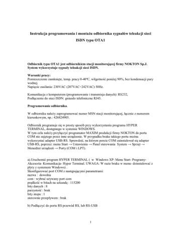 Instrukcja programowania i montażu odbiornika sygnałów teleakcji sieci ISDN typu OTA1 Odbiornik typu OTA1 jest odbiornikiem stacji monitorującej firmy NOKTON Sp.J. System wykorzystuje sygnały teleakcji sieci ISDN. Warunki pracy: Pomieszczenie zamknięte, temp. pracy 0-40ºC, wilgotność poniżej 90%, bez kondensacji pary wodnej. Napięcie zasilania: 230VAC (207VAC÷242VAC) 50Hz. Komunikacja z komputerem (programowanie i transmisja danych): RS232, Podłączenie do sieci ISDN: gniazdo telefoniczne RJ45. Programowanie odbiornika. W odbiorniku należy zaprogramować numer MSN stacji monitorującej, łącznie z numerem kierunkowym, np.: 426824905. Odbiornik programuje się w prosty sposób przy wykorzystaniu programu HYPER TERMINAL, dostępnego w systemie WINDOWS. W tym celu należy przyłączyć programator MAXIM produkcji firmy NOKTON do portu COM nie zajętego przez inne urządzenie. W przypadku braku takiego portu można wykorzystać adapter USB-RS. Sprawdzić, na którym porcie COM zainstalował się adapter USB-RS, poprzez: menu Start → Ustawienia → Panel sterowania System → Sprzęt → Menedżer urządzeń → Porty (COM i LPT). a).Uruchomić program HYPER TERMINAL ( w Windows XP: Menu Start- ProgramyAkcesoria- Komunikacja- Hyper Terminal. UWAGA: W razie braku w menu- doinstalować z płyty z systemem Windows) . Skonfigurować port COM z następującymi parametrami: nazwa : dowolna com : wybrać używany port com prędkość w bitach na sekundę : 115200 bity danych : 8 parzystość : brak bity stopu : 1 sterownie przepływem : brak b) Podłączyć do portu RS przewód RS, lub RS-USB 1 c) Wyłączyć zasilanie odbiornika, następnie, przy aktywnym oknie HYPER TERMINALA, trzymając wciśnięty klawisz spacji na klawiaturze komputera,- włączyć zasilanie odbiornika. Wyświetli się okno konfiguracyjne programu: Należy wpisać numer stacji wraz z numerem kierunkowym (bez „zera”) i zaakceptować przyciskiem: „Enter”, co spowoduje zapisanie numeru i opuszczenie programu konfiguracyjnego. Następnie należy przyłączyć przewód RS odbiornika do wolnego portu RS komputera stacji monitorującej i skonfigurować program Stacji do odbioru sygnałów z odbiornika na tym porcie. W tym celu należy: 1) ustalić do którego portu odbiornik został podłączony. W tym celu można skorzystać z informacji o portach dostępnych w „Panelu sterowania” systemu WINDOWS (StartUstawienia- Panel sterowania- System- Sprzęt- Menedżer urządzeń- Porty (Comm i LPT)). 2) W programie stacji monitorującej ( Konfiguracja- Porty COM- Urządzenie) ustawić następujące parametry portu: ISDN Nokton, prędkość transmisji: 115200, bity danych: 8, parzystość: NONE, bity stopu: 1. Następnie ustawienia należy zatwierdzić przyciskiem: „OK”. 2 Poniższy rysunek przedstawia okno konfiguracji portu COM z portem COM4 skonfigurowanym do odbioru sygnałów z nadajnika typu NTA1: W powyższym oknie proces konfigurowania odbiornika ISDN jest zakończony, a system jest przygotowany do obsługi toru ISDN. W przypadku jakichkolwiek problemów technicznych prosimy o kontakt: 42/ 250 62 51 w.16. Krzysztof Doczkal 3