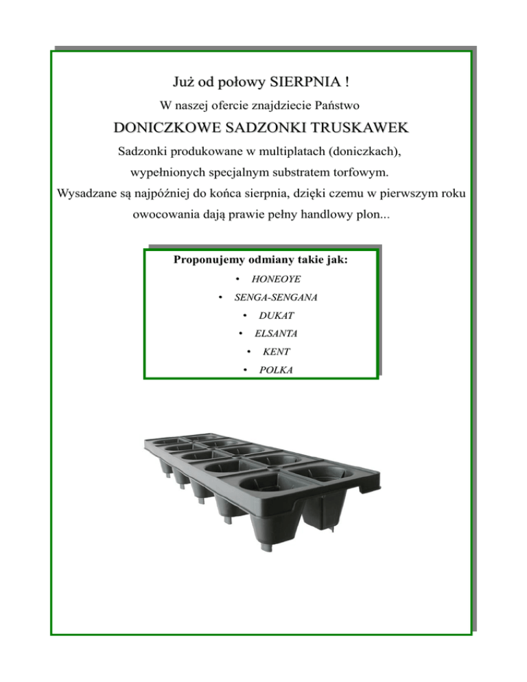 Już od połowy SIERPNIA ! W naszej ofercie znajdziecie Państwo DONICZKOWE SADZONKI TRUSKAWEK Sadzonki produkowane w multiplatach (doniczkach), wypełnionych specjalnym substratem torfowym. Wysadzane są najpóźniej do końca sierpnia, dzięki czemu w pierwszym roku owocowania dają prawie pełny handlowy plon... Proponujemy odmiany takie jak: HONEOYE • • SENGA-SENGANA • DUKAT ELSANTA • • • KENT POLKA