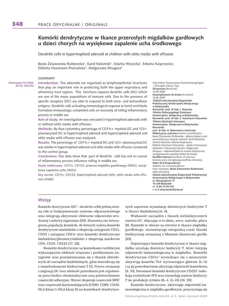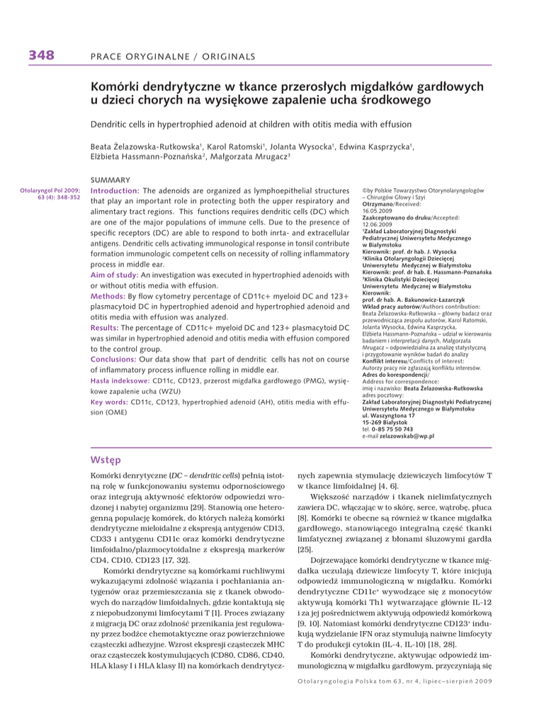 348 PRACE ORYGINALNE / ORIGINALS Komórki dendrytyczne w tkance przerosłych migdałków gardłowych u dzieci chorych na wysiękowe zapalenie ucha środkowego Dendritic cells in hypertrophied adenoid at children with otitis media with effusion Beata Żelazowska-Rutkowska1, Karol Ratomski1, Jolanta Wysocka1, Edwina Kasprzycka1, Elżbieta Hassmann-Poznańska 2, Małgorzata Mrugacz3 Otolaryngol Pol 2009; 63 (4): 348-352 SUMMARY Introduction: The adenoids are organized as lymphoepithelial structures that play an important role in protecting both the upper respiratory and alimentary tract regions. This functions requires dendritic cells (DC) which are one of the major populations of immune cells. Due to the presence of specific receptors (DC) are able to respond to both inrta- and extracellular antigens. Dendritic cells activating immunological response in tonsil contribute formation immunologic competent cells on necessity of rolling infl ammatory process in middle ear. Aim of study: An investigation was executed in hypertrophied adenoids with or without otitis media with effusion. Methods: By flow cytometry percentage of CD11c+ myeloid DC and 123+ plasmacytoid DC in hypertrophied adenoid and hypertrophied adenoid and otitis media with effusion was analyzed. Results: The percentage of CD11c+ myeloid DC and 123+ plasmacytoid DC was similar in hypertrophied adenoid and otitis media with effusion compored to the control group. Conclusions: Our data show that part of dendritic cells has not on course of inflammatory process influence rolling in middle ear. Hasła indeksowe: CD11c, CD123, przerost migdałka gardłowego (PMG), wysiękowe zapalenie ucha (WZU) Key words: CD11c, CD123, hypertrophied adenoid (AH), otitis media with effusion (OME) ©by Polskie Towarzystwo Otorynolaryngologów – Chirurgów Głowy i Szyi Otrzymano/Received: 16.05.2009 Zaakceptowano do druku/Accepted: 12.06.2009 1 Zakład Laboratoryjnej Diagnostyki Pediatrycznej Uniwersytetu Medycznego w Białymstoku Kierownik: prof. dr hab. J. Wysocka 2 Klinika Otolaryngologii Dziecięcej Uniwersytetu Medycznej w Białymstoku Kierownik: prof. dr hab. E. Hassmann-Poznańska 3 Klinika Okulistyki Dziecięcej Uniwersytetu Medycznej w Białymstoku Kierownik: prof. dr hab. A. Bakunowicz-Łazarczyk Wkład pracy autorów/Authors contribution: Beata Żelazowska-Rutkowska – główny badacz oraz przewodnicząca zespołu autorów, Karol Ratomski, Jolanta Wysocka, Edwina Kasprzycka, Elżbieta Hassmann-Poznańska – udział w kierowaniu badaniem i interpretacji danych, Małgorzata Mrugacz – odpowiedzialna za analizę statystyczną i przygotowanie wyników badań do analizy Konflikt interesu/Conflicts of interest: Autorzy pracy nie zgłaszają konfliktu interesów. Adres do korespondencji/ Address for correspondence: imię i nazwisko: Beata Żelazowska-Rutkowska adres pocztowy: Zakład Laboratoryjnej Diagnostyki Pediatrycznej Uniwersytetu Medycznego w Białymstoku ul. Waszyngtona 17 15-269 Białystok tel. 0-85 75 50 743 e-mail [email protected] Wstęp Komórki denrytyczne (DC – dendritic cells) pełnią istotną rolę w funkcjonowaniu systemu odpornościowego oraz integrują aktywność efektorów odpowiedzi wrodzonej i nabytej organizmu [29]. Stanowią one heterogenną populację komórek, do których należą komórki dendrytyczne mieloidalne z ekspresją antygenów CD13, CD33 i antygenu CD11c oraz komórki dendrytyczne limfoidalno/plazmocytoidalne z ekspresją markerów CD4, CD10, CD123 [17, 32]. Komórki dendrytyczne są komórkami ruchliwymi wykazującymi zdolność wiązania i pochłaniania antygenów oraz przemieszczania się z tkanek obwodowych do narządów limfoidalnych, gdzie kontaktują się z niepobudzonymi limfocytami T [1]. Proces związany z migracją DC oraz zdolność przenikania jest regulowany przez bodźce chemotaktyczne oraz powierzchniowe cząsteczki adhezyjne. Wzrost ekspresji cząsteczek MHC oraz cząsteczek kostymulujących (CD80, CD86, CD40, HLA klasy I i HLA klasy II) na komórkach dendrytycz- nych zapewnia stymulację dziewiczych limfocytów T w tkance limfoidalnej [4, 6]. Większość narządów i tkanek nielimfatycznych zawiera DC, włączając w to skórę, serce, wątrobę, płuca [8]. Komórki te obecne są również w tkance migdałka gardłowego, stanowiącego integralną część tkanki limfatycznej związanej z błonami śluzowymi gardła [25]. Dojrzewające komórki dendrytyczne w tkance migdałka uczulają dziewicze limfocyty T, które inicjują odpowiedź immunologiczną w migdałku. Komórki dendrytyczne CD11c+ wywodzące się z monocytów aktywują komórki Th1 wytwarzające głównie IL-12 i za jej pośrednictwem aktywują odpowiedź komórkową [9, 10]. Natomiast komórki dendrytyczne CD123+ indukują wydzielanie IFN oraz stymulują naiwne limfocyty T do produkcji cytokin (IL-4, IL-10) [18, 28]. Komórki dendrytyczne, aktywując odpowiedź immunologiczną w migdałku gardłowym, przyczyniają się Otolar yngologia Polska tom 63, nr 4, lipiec– sierpień 20 0 9 349 PRACE ORYGINALNE / ORIGINALS powstawania komórek immunologicznie kompetentnych na potrzeby toczącego się procesu zapalnego w uchu środkowym. Celem badań było określenie odsetka komórek dendrytycznych mieloidalnych (CD11c+) i plazmocytoidalnych (CD123+) w tkance przerosłych migdałków gardłowych u dzieci z wysiękowym zapaleniem ucha środkowego. Tabela I. Odsetek komórek dendrytycznych z ekspresją CD11c+ i CD123+ w tkance przerosłych migdałków gardłowych u dzieci chorych na wysiekowe zapalenie ucha środkowego (WZU) i w grupie porównawczej bez stanu zapalnego ucha środkowego (PMG) Komórki dendrytyczne (% ± SD) Grupa porównawcza PMG N = 20 Grupa badana WZU N = 21 CD11c+ (%) 0,22 ± 0,19 0,18 ± 0,14 CD123+ (%) 0,22 ± 0,19 0,23 ± 0,15 Materiał i metody Grupę badaną (WZU) stanowiło 21 dzieci obojga płci w wieku od 2 do 15 roku życia poddanych adenoidektomii z powodu przerostu migdałka gardłowego i towarzysząc