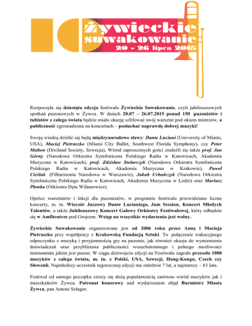 Rozpoczęła się dziesiąta edycja festiwalu Żywieckie Suwakowanie, czyli jubileuszowych spotkań puzonowych w Żywcu. W dniach 20.07 – 26.07.2015 ponad 150 puzonistów i tubistów z całego świata będzie miało okazję szlifować swój warsztat pod okiem mistrzów, a publiczność zgromadzona na koncertach – posłuchać naprawdę dobrej muzyki! Swoją wiedzą dzielić się będą międzynarodowe sławy: Dante Luciani (University of Miami, USA), Maciej Pietraszko (Miami City Ballet, Southwest Florida Symphony), czy Peter Malton (Dixiland Society, Szwecja), Wśród zaproszonych gości znaleźli się także prof. Jan Górny (Narodowa Orkiestra Symfoniczna Polskiego Radia w Katowicach, Akademia Muzyczna w Katowicach), prof. Zdzisław Stolarczyk (Narodowa Orkiestra Symfoniczna Polskiego Radia w Katowicach, Akademia Muzyczna w Krakowie), Paweł Cieślak (Filharmonia Narodowa w Warszawie), Jakub Urbańczyk (Narodowa Orkiestra Symfoniczna Polskiego Radia w Katowicach, Akademia Muzyczna w Łodzi) oraz Mariusz Płonka (Orkiestra Dęta Wilamowice). Oprócz warsztatów i lekcji dla puzonistów, w programie festiwalu przewidziano liczne koncerty, m. in. Wieczór Jazzowy Dante Lucianiego, Jam Session, Koncert Młodych Talentów, a także Jubileuszowy Koncert Galowy Orkiestry Festiwalowej, który odbędzie się w Amfiteatrze pod Grojcem. Wstęp na wszystkie wydarzenia jest wolny. Żywieckie Suwakowanie organizowane jest od 2006 roku przez Annę i Macieja Pietraszko przy współpracy z Krakowską Fundacją Sztuki. To połączenie wakacyjnego odpoczynku z muzyką i przyjemnością gry na puzonie, jak również okazja do wymienienia doświadczeń oraz przybliżenia publiczności wszechstronnego i pełnego możliwości instrumentu jakim jest puzon. W ciągu dziewięciu edycji na Festiwalu zagrało przeszło 1000 muzyków z całego świata, m. in. z Polski, USA, Szwecji, Hong-Kongu, Czech czy Słowenii. Najmłodszy uczestnik tegorocznej edycji ma zaledwie 7 lat, a najstarszy – 63 lata. Festiwal od samego początku cieszy się dużą popularnością zarówno wśród muzyków jak i mieszkańców Żywca. Patronat honorowy nad wydarzeniem objął Burmistrz Miasta Żywca, pan Antoni Szlagor.