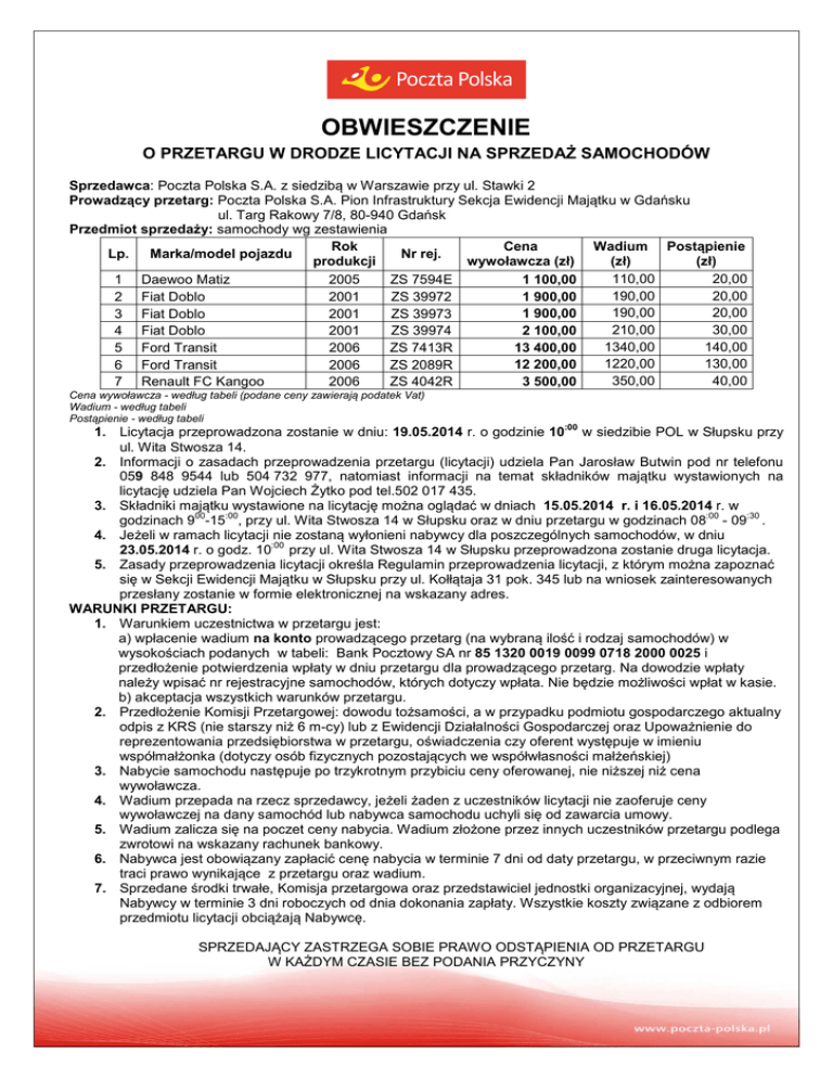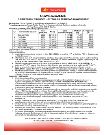 OBWIESZCZENIE O PRZETARGU W DRODZE LICYTACJI NA SPRZEDAŻ SAMOCHODÓW Sprzedawca: Poczta Polska S.A. z siedzibą w Warszawie przy ul. Stawki 2 Prowadzący przetarg: Poczta Polska S.A. Pion Infrastruktury Sekcja Ewidencji Majątku w Gdańsku ul. Targ Rakowy 7/8, 80-940 Gdańsk Przedmiot sprzedaży: samochody wg zestawienia Rok Cena Wadium Postąpienie Lp. Marka/model pojazdu Nr rej. produkcji wywoławcza (zł) (zł) (zł) 110,00 20,00 1 100,00 1 Daewoo Matiz 2005 ZS 7594E 190,00 20,00 1 900,00 2 Fiat Doblo 2001 ZS 39972 190,00 20,00 1 900,00 3 Fiat Doblo 2001 ZS 39973 210,00 30,00 2 100,00 4 Fiat Doblo 2001 ZS 39974 1340,00 140,00 13 400,00 5 Ford Transit 2006 ZS 7413R 1220,00 130,00 12 200,00 6 Ford Transit 2006 ZS 2089R 350,00 40,00 3 500,00 7 Renault FC Kangoo 2006 ZS 4042R Cena wywoławcza - według tabeli (podane ceny zawierają podatek Vat) Wadium - według tabeli Postąpienie - według tabeli :00 1. Licytacja przeprowadzona zostanie w dniu: 19.05.2014 r. o godzinie 10 w siedzibie POL w Słupsku przy ul. Wita Stwosza 14. 2. Informacji o zasadach przeprowadzenia przetargu (licytacji) udziela Pan Jarosław Butwin pod nr telefonu 059 848 9544 lub 504 732 977, natomiast informacji na temat składników majątku wystawionych na licytację udziela Pan Wojciech Żytko pod tel.502 017 435. 3. Składniki majątku wystawione na licytację można oglądać w dniach 15.05.2014 r. i 16.05.2014 r. w 00 :00 :00 :30 godzinach 9 -15 , przy ul. Wita Stwosza 14 w Słupsku oraz w dniu przetargu w godzinach 08 - 09 . 4. Jeżeli w ramach licytacji nie zostaną wyłonieni nabywcy dla poszczególnych samochodów, w dniu :00 23.05.2014 r. o godz. 10 przy ul. Wita Stwosza 14 w Słupsku przeprowadzona zostanie druga licytacja. 5. Zasady przeprowadzenia licytacji określa Regulamin przeprowadzenia licytacji, z którym można zapoznać się w Sekcji Ewidencji Majątku w Słupsku przy ul. Kołłątaja 31 pok. 345 lub na wniosek zainteresowanych przesłany zostanie w formie elektronicznej na wskazany adres. WARUNKI PRZETARGU: 1. Warunkiem uczestnictwa w przetargu jest: a) wpłacenie wadium na konto prowadzącego przetarg (na wybraną ilość i rodzaj samochodów) w wysokościach podanych w tabeli: Bank Pocztowy SA nr 85 1320 0019 0099 0718 2000 0025 i przedłożenie potwierdzenia wpłaty w dniu przetargu dla prowadzącego przetarg. Na dowodzie wpłaty należy wpisać nr rejestracyjne samochodów, których dotyczy wpłata. Nie będzie możliwości wpłat w kasie. b) akceptacja wszystkich warunków przetargu. 2. Przedłożenie Komisji Przetargowej: dowodu tożsamości, a w przypadku podmiotu gospodarczego aktualny odpis z KRS (nie starszy niż 6 m-cy) lub z Ewidencji Działalności Gospodarczej oraz Upoważnienie do reprezentowania przedsiębiorstwa w przetargu, oświadczenia czy oferent występuje w imieniu współmałżonka (dotyczy osób fizycznych pozostających we współwłasności małżeńskiej) 3. Nabycie samochodu następuje po trzykrotnym przybiciu ceny oferowanej, nie niższej niż cena wywoławcza. 4. Wadium przepada na rzecz sprzedawcy, jeżeli żaden z uczestników licytacji nie zaoferuje ceny wywoławczej na dany samochód lub nabywca samochodu uchyli się od zawarcia umowy. 5. Wadium zalicza się na poczet ceny nabycia. Wadium złożone przez innych uczestników przetargu podlega zwrotowi na wskazany rachunek bankowy. 6. Nabywca jest obowiązany zapłacić cenę nabycia w terminie 7 dni od daty przetargu, w przeciwnym razie traci prawo wynikające z przetargu oraz wadium. 7. Sprzedane środki trwałe, Komisja przetargowa oraz przedstawiciel jednostki organizacyjnej, wydają Nabywcy w terminie 3 dni roboczych od dnia dokonania zapłaty. Wszystkie koszty związane z odbiorem przedmiotu licytacji obciążają Nabywcę. SPRZEDAJĄCY ZASTRZEGA SOBIE PRAWO ODSTĄPIENIA OD PRZETARGU W KAŻDYM CZASIE BEZ PODANIA PRZYCZYNY