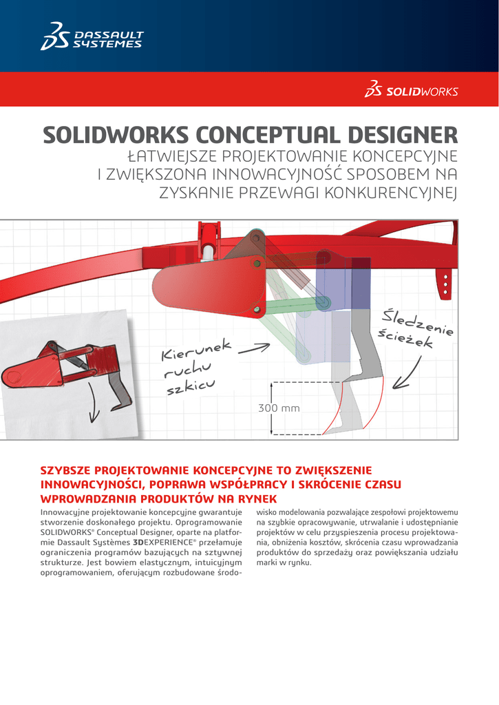 SOLIDWORKS CONCEPTUAL DESIGNER ŁATWIEJSZE PROJEKTOWANIE KONCEPCYJNE I ZWIĘKSZONA INNOWACYJNOŚĆ SPOSOBEM NA ZYSKANIE PRZEWAGI KONKURENCYJNEJ n ek u r e i K u r uc h u szkic Śled z ś ci e ż e n i e ek 300 mm SZYBSZE PROJEKTOWANIE KONCEPCYJNE TO ZWIĘKSZENIE INNOWACYJNOŚCI, POPRAWA WSPÓŁPRACY I SKRÓCENIE CZASU WPROWADZANIA PRODUKTÓW NA RYNEK Innowacyjne projektowanie koncepcyjne gwarantuje stworzenie doskonałego projektu. Oprogramowanie SOLIDWORKS® Conceptual Designer, oparte na platfor mie Dassault Systèmes 3DEXPERIENCE® przełamuje ograniczenia programów bazujących na sztywnej strukturze. Jest bowiem elastycznym, intuicyjnym oprogramowaniem, oferującym rozbudowane środo wisko modelowania pozwalające zespołowi projektowemu na szybkie opracowywanie, utrwalanie i udostępnianie projektów w celu przyspieszenia procesu projektowa nia, obniżenia kosztów, skrócenia czasu wprowadzania produktów do sprzedaży oraz powiększania udziału marki w rynku. Łatwiejsze i bardziej wydajne projektowanie koncepcyjne SOLIDWORKS Conceptual Designer upraszcza proces projektowania koncepcyjnego i umożliwia osiągnięcie przewagi konkurencyjnej. Zazwyczaj przygotowanie koncepcyjnego projektu mechanicznego pochłania prawie jedną trzecią całego czasu projektowania i wymaga średnio sześciu iteracji. Aż 98 procent firm wykorzystuje projektowanie koncepcyjne, dlatego też ogromnie ważna jest możliwość przyspieszenia czasu wejścia produktu na rynek i obniżenia kosztów oraz przejrzyste zarządzanie danymi i skuteczna komunikacja. Co jest potrzebne do zwiększenia wydajności projektowania koncepcyjnego? • Intuicyjne, łatwe w obsłudze narzędzie do projektowania. • Platforma umożliwiająca zebranie w jedno koncepcji kreatywnych zespołu projektowego oraz doświadczeń klientów i partnerów w celu wypracowania nowych pomysłów, wykorzystywania istniejących projektów, zapewnienia skutecznej współpracy i szybkiego uzyskiwania informacji zwrotnych. • Bezpieczne, chronione i inteligentne dane, do których dostęp można uzyskać zawsze i wszędzie. Program SOLIDWORKS Conceptual Designer zapewnia elastyczne, innowacyjne środowisko projektowania koncepcyjnego. Uzupełnia oprogramowanie SOLIDWORKS 3D CAD i pozwala skupić się na szybkim rozwiązywaniu problemów projektowych. Umożliwia opracowywanie, weryfikację i prezentację koncepcji oraz łatwe przejście do tworzenia części i złożeń. Dzięki funkcji ciągłego zapisywania plików dane są zawsze aktualne i bezpieczne. Dostęp do danych za pośrednictwem chmury umożliwia zespołom projektowym komunikację zawsze i wszędzie, wspomagając współpracę i tworzenie innowacyjnych projektów. Szybka droga od koncepcji do projektu SOLIDWORKS Conceptual Designer niezwykle przyspiesza proces projektowania dzięki możliwości opracowywania wielu koncepcji równocześnie. Koncepcje i iteracje projektowe można łatwo i z niezwykłą elastycznością przenosić na ekran komputera — dokonując zmian bezpośrednio w modelu cyfrowym, bez wcześniejszego planowania struktury produktu. Praca z SOLIDWORKS Conceptual Designer umożliwia korzystanie z dobrze znanych narzędzi i procedur, dzięki czemu można skupić się na tworzeniu projektów, a nie na obsłudze oprogramowania. • Zintegrowane środowisko modelowania łączy cechy historii projektowania, parametryzacji i bezpośredniego edytowania, dzięki czemu użytkownik może pracować tak, jak lubi — metodą projektowania od ogółu do szczegółu lub odwrotnie, tworząc szkic układu albo według modelu głównego — aby szybko realizować koncepcje i zdobywać nowych klientów. • Bezpośrednie edytowanie umożliwia łatwe i nieograniczone przekształcanie zarówno geometrii macierzystej, jak i importowanej, co skraca czas ponownego modelowania i pozwala skupić się na tworzeniu innowacyjnych projektów. • Przewidywanie rzeczywistego zachowania produktu jest pomocne w weryfikowaniu jego sprawności mechanicznej i sprawdzaniu skuteczności w prawdziwych warunkach pracy, dzięki czemu problemy można identyfikować i rozwiązywać jeszcze w trakcie projektowania. • Znalezienie optymalnych rozwiązań dla opracowywanych mechanizmów jest możliwe dzięki wykorzystaniu narzędzia syntezy mechanizmu (Mechanism Synthesis), które pozwala ustalać nieznane wartości wymiarowe. • Projekty można rozwijać od szkiców układów i geometrii 3D do poszczególnych części i złożeń bez ograniczeń wynikających z konstrukcji produktów, ale z zachowaniem określonej intencji projektu. SOLIDWORKS Conceptual Designer w niepowtarzalny sposób łączy zalety modelowania opartego na operacjach i pozbawionego historii, co skutkuje wyjątkowo elastycznym, interaktywnym tokiem pracy. Pozwala oszczędzić czas, ponieważ nie ma konieczności zaczynania od początku ani daleko idącego przerabiania projektów w celu wprowadzenia zasadniczej zmiany. Tworzenie sprężyn, które rozciągają się i kurczą w realistyczny sposób Łatwe modyfikowanie projektu za pomocą innowacyjnych narzędzi Platforma 3DEXPERIENCE stanowiąca fundament oprogramowania SOLIDWORKS Conceptual Designer zapewnia innowacyjne funkcje wspomagające komunikację i współpracę nad projektem. • Dostęp do koncepcji kreatywnych całego zespołu, umożliwiający wybór najlepszego rozwiązania projektowego. • Współpraca wewnętrzna i zewnętrzna z dostawcami oraz klientami w otwartym procesie rozwoju innowacji. • Angażowanie interesariuszy w dowolnym momencie poprzez udostępnianie projektów w ich indywidualnych systemach komunikacji. • Zbieranie opinii oraz informacji zwrotnych na temat projektu od interesariuszy przy użyciu prostych i znanych narzędzi sieciowych. Sprawdzanie działania produktu w 2D przed przejściem do 3D Projektowanie mechanizmów i analiza ruchu w trakcie projektowania SOLIDWORKS Conceptual Designer pomaga w sprawdzaniu poprawności działania mechanicznego produkt