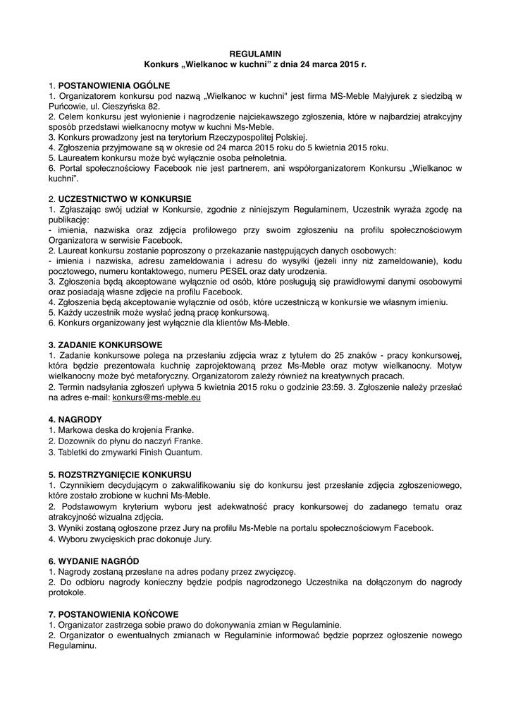 REGULAMIN Konkurs „Wielkanoc w kuchni” z dnia 24 marca 2015 r. 1. POSTANOWIENIA OGÓLNE 1. Organizatorem konkursu pod nazwą „Wielkanoc w kuchni" jest firma MS-Meble Małyjurek z siedzibą w Puńcowie, ul. Cieszyńska 82. 2. Celem konkursu jest wyłonienie i nagrodzenie najciekawszego zgłoszenia, które w najbardziej atrakcyjny sposób przedstawi wielkanocny motyw w kuchni Ms-Meble. 3. Konkurs prowadzony jest na terytorium Rzeczypospolitej Polskiej. 4. Zgłoszenia przyjmowane są w okresie od 24 marca 2015 roku do 5 kwietnia 2015 roku. 5. Laureatem konkursu może być wyłącznie osoba pełnoletnia. 6. Portal społecznościowy Facebook nie jest partnerem, ani współorganizatorem Konkursu „Wielkanoc w kuchni”. 2. UCZESTNICTWO W KONKURSIE 1. Zgłaszając swój udział w Konkursie, zgodnie z niniejszym Regulaminem, Uczestnik wyraża zgodę na publikację: - imienia, nazwiska oraz zdjęcia profilowego przy swoim zgłoszeniu na profilu społecznościowym Organizatora w serwisie Facebook. 2. Laureat konkursu zostanie poproszony o przekazanie następujących danych osobowych: - imienia i nazwiska, adresu zameldowania i adresu do wysyłki (jeżeli inny niż zameldowanie), kodu pocztowego, numeru kontaktowego, numeru PESEL oraz daty urodzenia. 3. Zgłoszenia będą akceptowane wyłącznie od osób, które posługują się prawidłowymi danymi osobowymi oraz posiadają własne zdjęcie na profilu Facebook. 4. Zgłoszenia będą akceptowanie wyłącznie od osób, które uczestniczą w konkursie we własnym imieniu. 5. Każdy uczestnik może wysłać jedną pracę konkursową. 6. Konkurs organizowany jest wyłącznie dla klientów Ms-Meble. 3. ZADANIE KONKURSOWE 1. Zadanie konkursowe polega na przesłaniu zdjęcia wraz z tytułem do 25 znaków - pracy konkursowej, która będzie prezentowała kuchnię zaprojektowaną przez Ms-Meble oraz motyw wielkanocny. Motyw wielkanocny może być metaforyczny. Organizatorom zależy również na kreatywnych pracach. 2. Termin nadsyłania zgłoszeń upływa 5 kwietnia 2015 roku o godzinie 23:59. 3. Zgłoszenie należy przesłać na adres e-mail: [email protected] 4. NAGRODY 1. Markowa deska do krojenia Franke. 2. Dozownik do płynu do naczyń Franke. 3. Tabletki do zmywarki Finish Quantum. 5. ROZSTRZYGNIĘCIE KONKURSU 1. Czynnikiem decydującym o zakwalifikowaniu się do konkursu jest przesłanie zdjęcia zgłoszeniowego, które zostało zrobione w kuchni Ms-Meble. 2. Podstawowym kryterium wyboru jest adekwatność pracy konkursowej do zadanego tematu oraz atrakcyjność wizualna zdjęcia. 3. Wyniki zostaną ogłoszone przez Jury na profilu Ms-Meble na portalu społecznościowym Facebook. 4. Wyboru zwycięskich prac dokonuje Jury. 6. WYDANIE NAGRÓD 1. Nagrody zostaną przesłane na adres podany przez zwycięzcę. 2. Do odbioru nagrody konieczny będzie podpis nagrodzonego Uczestnika na dołączonym do nagrody protokole. 7. POSTANOWIENIA KOŃCOWE 1. Organizator zastrzega sobie prawo do dokonywania zmian w Regulaminie. 2. Organizator o ewentualnych zmianach w Regulaminie informować będzie poprzez ogłoszenie nowego Regulaminu.