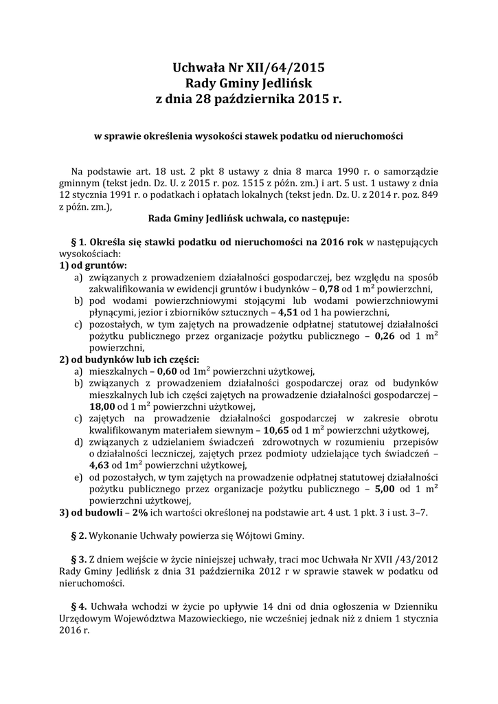 Uchwała Nr XII/64/2015 Rady Gminy Jedlińsk z dnia 28 października 2015 r. w sprawie określenia wysokości stawek podatku od nieruchomości Na podstawie art. 18 ust. 2 pkt 8 ustawy z dnia 8 marca 1990 r. o samorządzie gminnym (tekst jedn. Dz. U. z 2015 r. poz. 1515 z późn. zm.) i art. 5 ust. 1 ustawy z dnia 12 stycznia 1991 r. o podatkach i opłatach lokalnych (tekst jedn. Dz. U. z 2014 r. poz. 849 z późn. zm.), Rada Gminy Jedlińsk uchwala, co następuje: § 1. Określa się stawki podatku od nieruchomości na 2016 rok w następujących wysokościach: 1) od gruntów: a) związanych z prowadzeniem działalności gospodarczej, bez względu na sposób zakwalifikowania w ewidencji gruntów i budynków – 0,78 od 1 m² powierzchni, b) pod wodami powierzchniowymi stojącymi lub wodami powierzchniowymi płynącymi, jezior i zbiorników sztucznych – 4,51 od 1 ha powierzchni, c) pozostałych, w tym zajętych na prowadzenie odpłatnej statutowej działalności pożytku publicznego przez organizacje pożytku publicznego – 0,26 od 1 m² powierzchni, 2) od budynków lub ich części: a) mieszkalnych – 0,60 od 1m² powierzchni użytkowej, b) związanych z prowadzeniem działalności gospodarczej oraz od budynków mieszkalnych lub ich części zajętych na prowadzenie działalności gospodarczej – 18,00 od 1 m² powierzchni użytkowej, c) zajętych na prowadzenie działalności gospodarczej w zakresie obrotu kwalifikowanym materiałem siewnym – 10,65 od 1 m² powierzchni użytkowej, d) związanych z udzielaniem świadczeń zdrowotnych w rozumieniu przepisów o działalności leczniczej, zajętych przez podmioty udzielające tych świadczeń – 4,63 od 1m² powierzchni użytkowej, e) od pozostałych, w tym zajętych na prowadzenie odpłatnej statutowej działalności pożytku publicznego przez organizacje pożytku publicznego – 5,00 od 1 m² powierzchni użytkowej, 3) od budowli – 2% ich wartości określonej na podstawie art. 4 ust. 1 pkt. 3 i ust. 3–7. § 2. Wykonanie Uchwały powierza się Wójtowi Gminy. § 3. Z dniem wejście w życie niniejszej uchwały, traci moc Uchwała Nr XVII /43/2012 Rady Gminy Jedlińsk z dnia 31 października 2012 r w sprawie stawek w podatku od nieruchomości. § 4. Uchwała wchodzi w życie po upływie 14 dni od dnia ogłoszenia w Dzienniku Urzędowym Województwa Mazowieckiego, nie wcześniej jednak niż z dniem 1 stycznia 2016 r.