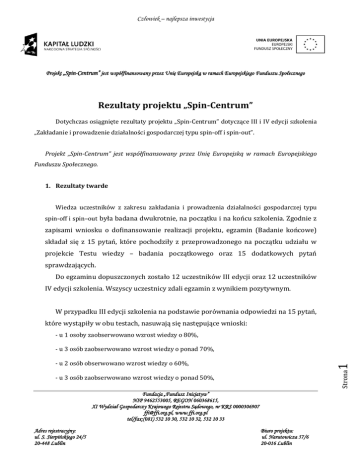 Człowiek – najlepsza inwestycja Projekt „Spin-Centrum” jest współfinansowany przez Unię Europejską w ramach Europejskiego Funduszu Społecznego Rezultaty projektu „Spin-Centrum” Dotychczas osiągnięte rezultaty projektu „Spin-Centrum” dotyczące III i IV edycji szkolenia „Zakładanie i prowadzenie działalności gospodarczej typu spin-off i spin-out”. Projekt „Spin-Centrum” jest współfinansowany przez Unię Europejską w ramach Europejskiego Funduszu Społecznego. 1. Rezultaty twarde Wiedza uczestników z zakresu zakładania i prowadzenia działalności gospodarczej typu spin-off i spin–out była badana dwukrotnie, na początku i na końcu szkolenia. Zgodnie z zapisami wniosku o dofinansowanie realizacji projektu, egzamin (Badanie końcowe) składał się z 15 pytań, które pochodziły z przeprowadzonego na początku udziału w projekcie Testu wiedzy – badania początkowego oraz 15 dodatkowych pytań sprawdzających. Do egzaminu dopuszczonych zostało 12 uczestników III edycji oraz 12 uczestników IV edycji szkolenia. Wszyscy uczestnicy zdali egzamin z wynikiem pozytywnym. W przypadku III edycji szkolenia na podstawie porównania odpowiedzi na 15 pytań, które wystąpiły w obu testach, nasuwają się następujące wnioski: - u 1 osoby zaobserwowano wzrost wiedzy o 80%, - u 3 osób zaobserwowano wzrost wiedzy o ponad 70%, Strona 1 - u 2 osób obserwowano wzrost wiedzy o 60%, - u 3 osób zaobserwowano wzrost wiedzy o ponad 50%, Fundacja „Fundusz Inicjatyw” NIP 9462553005, REGON 060368615, XI Wydział Gospodarczy Krajowego Rejestru Sądowego, nr KRS 0000306907 [email protected], www.ffi.org.pl tel/fax:(081) 532 10 30, 532 10 32, 532 10 33 Adres rejestracyjny: ul. S. Sierpińskiego 24/5 20-448 Lublin Biuro projektu: ul. Narutowicza 57/6 20-016 Lublin Człowiek – najlepsza inwestycja Projekt „Spin-Centrum” jest współfinansowany przez Unię Europejską w ramach Europejskiego Funduszu Społecznego - u 3 osób zaobserwowano wzrost wiedzy o ponad 40%. Wyniki IV edycji szkolenia przedstawiają się w następujący sposób: - u 1 osoby zaobserwowano wzrost wiedzy o ponad 70%, - u 2 osób zaobserwowano wzrost wiedzy o ponad 50%, - u 3 osób zaobserwowano wzrost wiedzy o 40%, - u 2 osób zaobserwowano wzrost wiedzy o ponad 30%, - u 2 osób zaobserwowano wzrost wiedzy o ponad 20%, - u 1 osoby zaobserwowano wzrost wiedzy o 20%, - u 1 osoby zaobserwowano wzrost wiedzy o ponad 10%. 2. Rezultaty miękkie Uczestnicy III i IV edycji szkolenia dwukrotnie wypełniali ankiety badające ich umiejętności interpersonalne. Badano: wzrost wiary w siebie przez poznanie możliwości rozwoju zawodowego, wzrost świadomości na temat korzyści płynących z prowadzenia działalności gospodarczej, wzrost motywacji do założenia działalności gospodarczej. Dla III edycji szkolenia wyniki przedstawiają się następująco: 12 z 12 badanych osób zadeklarowało wzrost umiejętności we wszystkich trzech badanych obszarach. Wzrost wiary w siebie przez poznanie możliwości rozwoju zawodowego 2 zadeklarowało 12 osób, co stanowi 100%, w tym „wysoki wzrost” 10 osób, co Strona stanowi 83,33%. Fundacja „Fundusz Inicjatyw” NIP 9462553005, REGON 060368615, XI Wydział Gospodarczy Krajowego Rejestru Sądowego, nr KRS 0000306907 [email protected], www.ffi.org.pl tel/fax:(081) 532 10 30, 532 10 32, 532 10 33 Adres rejestracyjny: ul. S. Sierpińskiego 24/5 20-448 Lublin Biuro projektu: ul. Narutowicza 57/6 20-016 Lublin Człowiek – najlepsza inwestycja Projekt „Spin-Centrum” jest współfinansowany przez Unię Europejską w ramach Europejskiego Funduszu Społecznego Wzrost świadomości na temat korzyści płynących z prowadzenia własnej działalności gospodarczej zadeklarowało 12 osób, co stanowi 100%, w tym „wysoki wzrost” 11 osób, co stanowi 91,67%. Wzrost motywacji do założenia działalności gospodarczej zadeklarowało 12 osób, co stanowi 100%, w tym „wysoki wzrost” 11 osób, co stanowi 91,67% Dla IV edycji szkolenia wyniki przedstawiają się następująco: 12 z 12 badanych osób zadeklarowało wzrost umiejętności we wszystkich trzech badanych obszarach. Wzrost wiary w siebie przez poznanie możliwości rozwoju zawodowego zadeklarowało 12 osób, co stanowi 100%, w tym „wysoki wzrost” 5 osób, co stanowi 41,67%. Wzrost świadomości na temat korzyści płynących z prowadzenia własnej działalności gospodarczej zadeklarowało 12 osób, co stanowi 100%, w tym „wysoki wzrost” 5 osób, co stanowi 41,67%. Wzrost motywacji do założenia działalności gospodarczej zadeklarowało 12 osób, co stanowi 100%, w tym „wysoki wzrost” 11 osób, co stanowi 41,67%. 3. Ocena szkolenia „Zakładanie i prowadzenie działalności gospodarczej typu spin-off i spin-out”. Wśród uczestników III i IV edycji szkolenia przeprowadzona została również Ankieta Strona od 1 do 6, gdzie 1 oznaczało „bardzo źle”, a 6 „bardzo dobrze”. Wykładowcy byli oceniani w kilku kategoriach. Fundacja „Fundusz Inicjatyw” NIP 9462553005, REGON 060368615, XI Wydział Gospodarczy Krajowego Rejestru Sądowego, nr KRS 0000306907 [email protected], www.ffi.org.pl tel/fax:(081) 532 10 30, 532 10 32, 532 10 33 Adres rejestracyjny: ul. S. Sierpińskiego 24/5 20-448 Lublin 3 ewaluacyjna szkolenia. Celem badania była m.in. ocena wykładowców. Skala ocen wynosiła Biuro projektu: ul. Narutowicza 57/6 20-016 Lublin Człowiek – najlepsza inwestycja Projekt „Spin-Centrum” jest współfinansowany przez Unię Europejską w ramach Europejskiego Funduszu Społecznego Wyniki dla III edycji szkolenia przedstawiają się następująco: Wiedza wykładowców oceniona była średnio na: 5,69; najwyższa ocena: 5,92. Komunikatywność oceniona była średnio na: 5,56; najwyższa ocena: 5,8. Metody prowadzenia zajęć oceniono średnio na: 5,49; najwyższa ocena: 5,75. Wyniki dla IV edycji szkolenia przedstawiają się następująco: Wiedza wykładowców oceniona by