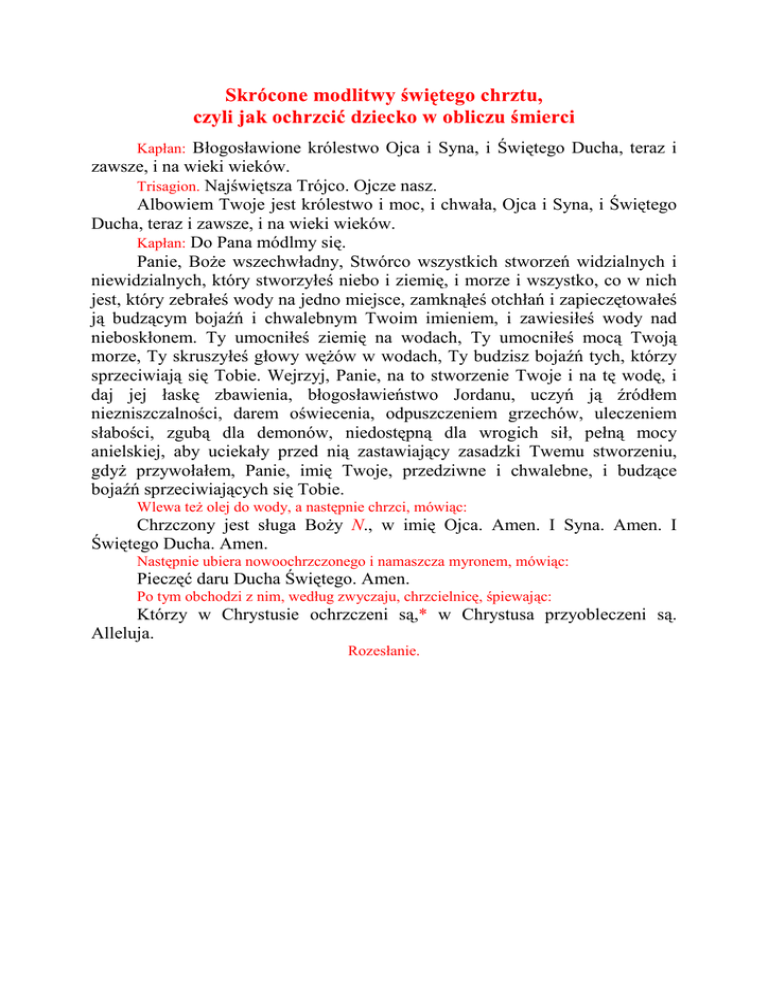 Kapłan: Błogosławione królestwo Ojca i Syna, i Świętego Ducha, teraz i zawsze, i na wieki wieków. Trisagion. Najświętsza Trójco. Ojcze nasz. Albowiem Twoje jest królestwo i moc, i chwała, Ojca i Syna, i Świętego Ducha, teraz i zawsze, i na wieki wieków. Kapłan: Do Pana módlmy się. Panie, Boże wszechwładny, Stwórco wszystkich stworzeń widzialnych i niewidzialnych, który stworzyłeś niebo i ziemię, i morze i wszystko, co w nich jest, który zebrałeś wody na jedno miejsce, zamknąłeś otchłań i zapieczętowałeś ją budzącym bojaźń i chwalebnym Twoim imieniem, i zawiesiłeś wody nad nieboskłonem. Ty umocniłeś ziemię na wodach, Ty umocniłeś mocą Twoją morze, Ty skruszyłeś głowy wężów w wodach, Ty budzisz bojaźń tych, którzy sprzeciwiają się Tobie. Wejrzyj, Panie, na to stworzenie Twoje i na tę wodę, i daj jej łaskę zbawienia, błogosławieństwo Jordanu, uczyń ją źródłem niezniszczalności, darem oświecenia, odpuszczeniem grzechów, uleczeniem słabości, zgubą dla demonów, niedostępną dla wrogich sił, pełną mocy anielskiej, aby uciekały przed nią zastawiający zasadzki Twemu stworzeniu, gdyż przywołałem, Panie, imię Twoje, przedziwne i chwalebne, i budzące bojaźń sprzeciwiających się Tobie. Wlewa też olej do wody, a następnie chrzci, mówiąc: Chrzczony jest sługa Boży N., w imię Ojca. Amen. I Syna. Amen. I Świętego Ducha. Amen. Następnie ubiera nowoochrzczonego i namaszcza myronem, mówiąc: Pieczęć daru Ducha Świętego. Amen. Po tym obchodzi z nim, według zwyczaju, chrzcielnicę, śpiewając: Którzy w Chrystusie ochrzczeni są,* w Chrystusa przyobleczeni są. Alleluja. Rozesłanie.