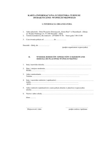 KARTA INFORMACYJNA UCZESTNIKA TURNUSU DYDAKTYCZNO- WYPOCZYNKOWEGO I. INFORMACJA ORGANIZATORA 1. 2. Adres placówki : Dom Wczasów Dziecięcych „Green Rest” w Dusznikach - Zdroju ul. Wojska Polskiego 33, 57-340 Duszniki - Zdrój Telefon kontaktowy dla rodziców : (074)866 93 56 / biuro godz.7.00-15.00/ 3. Czas trwania pobytu od ……………. do ……………. Duszniki - Zdrój, dn ……………… II. ………………………….. (podpis organizatora wypoczynku) WNIOSEK RODZICÓW /OPIEKUNÓW O SKIEROWANIE DZIECKA DO PLACÓWKI WYPOCZYNKOWEJ 1. Imię i nazwisko dziecka…………………………………………………………………… 2. Data i miejsce urodzenia…………………………………………………………………. PESEL ………………… 3. Adres zamieszkania…………………………………………………………………… Telefon…………………………………………………………………… 4. Imię i nazwisko rodziców ( opiekunów): …………………………………………………… matka…………………………………………………………………… ojciec…………………………………………………………………… 5. Adres rodziców (opiekunów)w czasie pobytu dziecka w placówce wypoczynku: telefon………………………………………………………………………………………… 6. Nazwa i adres szkoły…………………………………………………………………………. klasa ……… .…………………….. Miejscowość i data ………………………………. podpis rodzica /opiekuna III. INFROMACJA RODZICÓW ( OPIEKUNÓW) O STANIE ZDROWIA DZIECKA (prosimy wypełnić czytelnie).Drogi Rodzicu wypełniając dokładnie tę część karty, umożliwiasz nam podjęcie właściwych działań, gdy Twoje dziecko zachoruje. 1. Proszę podkreślić dolegliwości i objawy które występują u dziecka: omdlenia, drgawki i utrata przytomności, bóle głowy, zaburzenia równowagi, częste wymioty, krwotoki z nosa, ataki duszności, przewlekły katar, szybkie męczenie, bóle brzucha, bóle stawów, lęki nocne, moczenie nocne, inne ……………………………………………………………………………………….. 2. Przebyte choroby zakaźne: żółtaczka, różyczka, ospa, odra………………………………………………………………………………. 3. Proszę podkreślić choroby, które wystąpiły u dziecka: Zapalenie nerek, zapalenie wyrostka robaczkowego, zapalenie uszu, zapalenie płuc, zapalenie oskrzeli, cukrzyca, epilepsja, świnka, angina………………٭., grypa…………………٭ Alergia ( rodzaj alergii, przyjmowane dawki leków……………………………………………………… …………………………………………………………………………………………………………….. ٭podaj częstotliwość wystąpienia 4. Czy dziecko w ostatnim roku przebywało w szpitalu (podać powód) ……………………………………………………………………………………………………………… 5. Na jakie pokarmy, leki dziecko jest uczulone……………………………………………………… ……………………………………………………………………………………………………………… 6. Jazdę samochodem znosi: dobrze , źle 7. Nosi : okulary, aparat ortodontyczny 8. Inne informacje………………………………………………………………………………………. IV. INFORMACJA PIELĘGNIARKI O SZCZEPIENIACH lub przedstawienie książeczki zdrowia z aktualnym wpisem szczepień Szczepienia ochronne ( podać rok): tężec…………….., błonica………………, dur……………………, inne ………………………………………………………………………………………………………… …………………………….. (data) ………………………………… (podpis) 1. V. WARUNKI UCZESTNICTWA W WYPOCZYNKU Uczestnik zobowiązany jest stosować się do regulaminu Domu Wczasów Dziecięcych, w szczególności dotyczy t zakazu palenie tytoniu, picia napojów zawierających alkohol, zażywania środków odurzających. W przypadku poważnego naruszenia regulaminu uczestnika zostaje wydalony z placówki wypoczynku na koszt rodziców ( opiekunów). 2. Uczestnik zobowiązany jest uczestniczyć we wszystkich imprezach, wycieczkach organizowanych przez wychowawców i stosować się do ich poleceń. 3. Dom Wczasów Dziecięcych nie ponosi odpowiedzialności za sprzęt elektroniczny, rzeczy wartościowe oraz rzeczy pozostawione przez uczestników pobytu. 4. W przypadku stałych schorzeń wymagających systematycznego zażywania lekówuczestnik obowiązany jest do posiadania własnych. 5. Uczestnik za pośrednictwem rodziców ( opiekunów) ponosi odpowiedzialność materialną za wyrządzone szkody w placówce pobytu. Oświadczam, że zapoznałam/em moje dziecko z w/w warunkami uczestnictwa. Swoim podpisem akceptuję zasady obowiązujące w Domu Wczasów Dziecięcych Podałam/Em wszystkie istotne informacje o stanie zdrowia mojego dziecka. W razie zagrożenia życia lub zdrowia dziecka zgadzam się/ nie zgadzam się ٭na jego leczenie szpitalne, zabiegi diagnostyczne, operacyjne. ٭niepotrzebne skreślić …………………………….. (podpis rodzica/opiekuna) VI. POZOSTAŁE INFORMACJE 1. Nazwa i adres Przychodni Zdrowia, z której korzysta dziecko ……………………………………………………………………………………………………… ……………………………………………………………………………………………………… 2. NIP Przychodni ……………………………………………………………………………….. 3. Imię i nazwisko lekarza prowadząc