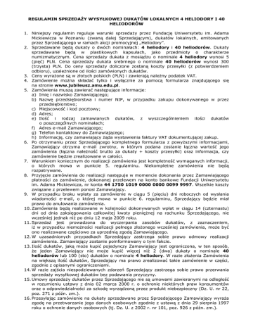 REGULAMIN SPRZEDAśY WYSYŁKOWEJ DUKATÓW LOKALNYCH 4 HELIODORY I 40 HELIODORÓW 1. Niniejszy regulamin reguluje warunki sprzedaŜy przez Fundację Uniwersytetu im. Adama Mickiewicza w Poznaniu (zwaną dalej Sprzedającym), dukatów lokalnych, emitowanych przez Sprzedającego w ramach akcji promocyjnej „Heliodory”. 2. Sprzedawane będą dukaty o dwóch nominałach: 4 heliodory i 40 heliodorów. Dukaty sprzedawane będą w plastikowych kapsułach, jako przedmioty o charakterze numizmatycznym. Cena sprzedaŜy dukata z mosiądzu o nominale 4 heliodory wynosi 5 (pięć) PLN. Cena sprzedaŜy dukata srebrnego o nominale 40 heliodorów wynosi 300 (trzysta) PLN. Do ceny sprzedaŜy doliczone zostaną koszty przesyłki (z potwierdzeniem odbioru), uzaleŜnione od ilości zamówionych dukatów. 3. Ceny wyraŜone są w złotych polskich (PLN) i zawierają naleŜny podatek VAT. 4. Zamówienie moŜna składać tylko i wyłącznie za pomocą formularza znajdującego się na stronie www.jubileusz.amu.edu.pl. 5. Zamówienia muszą zawierać następujące informacje: a) Imię i nazwisko Zamawiającego; b) Nazwę przedsiębiorstwa i numer NIP, w przypadku zakupu dokonywanego w przez przedsiębiorstwo; c) Miejscowość i kod pocztowy; d) Adres; e) Ilość i rodzaj zamawianych dukatów, z wyszczególnieniem ilości dukatów o poszczególnych nominałach; f) Adres e-mail Zamawiającego; g) Telefon kontaktowy do Zamawiającego; h) Informację, czy zamawiający Ŝąda wystawienia faktury VAT dokumentującej zakup. 6. Po otrzymaniu przez Sprzedającego kompletnego formularza z powyŜszymi informacjami, Zamawiający otrzyma e-mail zwrotny, w którym podana zostanie łączna wartość jego zamówienia (łączna naleŜność brutto za dukaty + koszty przesyłki) oraz informacja, czy zamówienie będzie zrealizowane w całości. 7. Warunkiem koniecznym do realizacji zamówienia jest kompletność wymaganych informacji, o których mowa w punkcie 5. regulaminu. Niekompletne zamówienia nie będą rozpatrywane. 8. Przyjęcie zamówienia do realizacji następuje w momencie dokonania przez Zamawiającego płatności za zamówienie, dokonanej przelewem na konto bankowe Fundacji Uniwersytetu im. Adama Mickiewicza, nr konta 44 1750 1019 0000 0000 0099 9997. Wszelkie koszty związane z przelewem ponosi Zamawiający. 9. W przypadku braku wpłaty za zamówienie w ciągu 5 (pięciu) dni roboczych od wysłania wiadomości e-mail, o której mowa w punkcie 6. regulaminu, Sprzedający będzie miał prawo do anulowania zamówienia. 10. Zamówienia będą realizowane w kolejności dokonywanych wpłat w ciągu 14 (czternastu) dni od dnia zaksięgowania całkowitej kwoty pienięŜnej na rachunku Sprzedającego, nie wcześniej jednak niŜ po dniu 12 maja 2009 roku. 11. SprzedaŜ jest prowadzona do wyczerpania zasobów dukatów, z zaznaczeniem, iŜ w przypadku niemoŜności realizacji pełnego złoŜonego wcześniej zamówienia, moŜe być ono realizowane częściowo za uprzednią zgodą Zamawiającego. 12. W uzasadnionych przypadkach Sprzedający zastrzega sobie prawo odmowy realizacji zamówienia. Zamawiający zostanie poinformowany o tym fakcie. 13. Ilość dukatów, jaką moŜe kupić pojedynczy Zamawiający jest ograniczona, w ten sposób, Ŝe jeden Zamawiający nie moŜe kupić więcej niŜ 2 (dwa) dukaty o nominale 40 heliodorów lub 100 (sto) dukatów o nominale 4 heliodory. W razie złoŜenia Zamówienia na większą ilość dukatów, Sprzedający ma prawo zrealizować takie zamówienie w części, zgodnie z opisanymi ograniczeniami. 14. W razie zajścia niespodziewanych zdarzeń Sprzedający zastrzega sobie prawo przerwania sprzedaŜy wysyłkowej dukatów bez podawania przyczyny. 15. Umowy sprzedaŜy dukatów przez Sprzedającego nie są umowami zawieranymi na odległość w rozumieniu ustawy z dnia 02 marca 2000 r. o ochronie niektórych praw konsumentów oraz o odpowiedzialności za szkodę wyrządzoną przez produkt niebezpieczny (Dz. U. nr 22, poz. 271 z późn. zm.). 16. Przesyłając zamówienie na dukaty sprzedawane przez Sprzedającego Zamawiający wyraŜa zgodę na przetwarzanie jego danych osobowych zgodnie z ustawą z dnia 29 sierpnia 1997 roku o ochronie danych osobowych (tj. Dz. U. z 2002 r. nr 101, poz. 926 z późn. zm.).