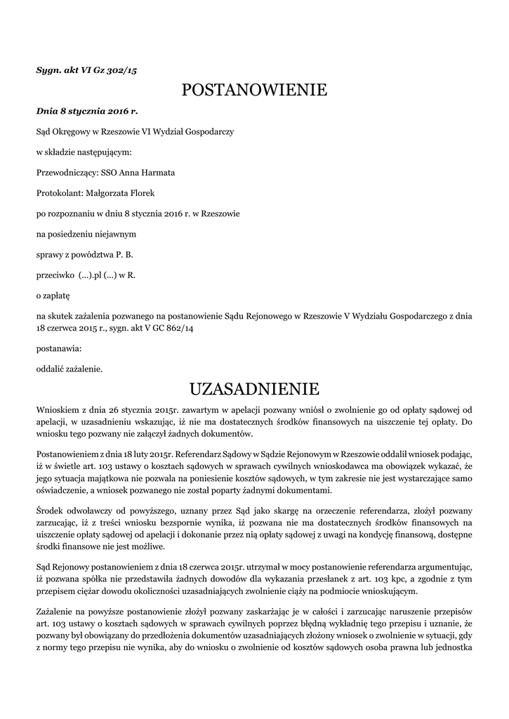 Sygn. akt VI Gz 302/15 POSTANOWIENIE Dnia 8 stycznia 2016 r. Sąd Okręgowy w Rzeszowie VI Wydział Gospodarczy w składzie następującym: Przewodniczący: SSO Anna Harmata Protokolant: Małgorzata Florek po rozpoznaniu w dniu 8 stycznia 2016 r. w Rzeszowie na posiedzeniu niejawnym sprawy z powództwa P. B. przeciwko (...).pl (...) w R. o zapłatę na skutek zażalenia pozwanego na postanowienie Sądu Rejonowego w Rzeszowie V Wydziału Gospodarczego z dnia 18 czerwca 2015 r., sygn. akt V GC 862/14 postanawia: oddalić zażalenie. UZASADNIENIE Wnioskiem z dnia 26 stycznia 2015r. zawartym w apelacji pozwany wniósł o zwolnienie go od opłaty sądowej od apelacji, w uzasadnieniu wskazując, iż nie ma dostatecznych środków finansowych na uiszczenie tej opłaty. Do wniosku tego pozwany nie załączył żadnych dokumentów. Postanowieniem z dnia 18 luty 2015r. Referendarz Sądowy w Sądzie Rejonowym w Rzeszowie oddalił wniosek podając, iż w świetle art. 103 ustawy o kosztach sądowych w sprawach cywilnych wnioskodawca ma obowiązek wykazać, że jego sytuacja majątkowa nie pozwala na poniesienie kosztów sądowych, w tym zakresie nie jest wystarczające samo oświadczenie, a wniosek pozwanego nie został poparty żadnymi dokumentami. Środek odwoławczy od powyższego, uznany przez Sąd jako skargę na orzeczenie referendarza, złożył pozwany zarzucając, iż z treści wniosku bezspornie wynika, iż pozwana nie ma dostatecznych środków finansowych na uiszczenie opłaty sądowej od apelacji i dokonanie przez nią opłaty sądowej z uwagi na kondycję finansową, dostępne środki finansowe nie jest możliwe. Sąd Rejonowy postanowieniem z dnia 18 czerwca 2015r. utrzymał w mocy postanowienie referendarza argumentując, iż pozwana spółka nie przedstawiła żadnych dowodów dla wykazania przesłanek z art. 103 kpc, a zgodnie z tym przepisem ciężar dowodu okoliczności uzasadniających zwolnienie ciąży na podmiocie wnioskującym. Zażalenie na powyższe postanowienie złożył pozwany zaskarżając je w całości i zarzucając naruszenie przepisów art. 103 ustawy o kosztach sądowych w sprawach cywilnych poprzez błędną wykładnię tego przepisu i uznanie, że pozwany był obowiązany do przedłożenia dokumentów uzasadniających złożony wniosek o zwolnienie w sytuacji, gdy z normy tego przepisu nie wynika, aby do wniosku o zwolnienie od kosztów sądowych osoba prawna lub jednostka organizacyjna nie posiadająca osobowości prawnej, miała obowiązek przedkładania jakichkolwiek dokumentów. Żalący wniósł o zmianę zaskarżonego postanowienia poprzez zwolnienie go od obowiązku ponoszenia opłaty sądowej od apelacji. Sąd Okręgowy zważył co następuje: Na mocy art. 103 ustawy o kosztach sądowych w sprawach cywilnych (Dz. U. z 2005 r., nr 167, poz. 1398, z późn. zm.) Sąd może przyznać zwolnienie od kosztów sądowych osobie prawnej, jeżeli wykazała, że nie ma dostatecznych środków na ich uiszczenie. W ocenie Sądu Okręgowego brak jest podstaw do zwolnienia pozwanego od uiszczenia opłaty sądowej od pozwu. Pozwany nie przedstawił Sądowi na potwierdzenie zasadności swego wniosku żadnych dokumentów obrazujących sytuację finansową spółki ( bilanse, sprawozdania dla celów podatkowych itd). ograniczając się jedynie do twierdzeń w zakresie swej sytuacji finansowej. Instytucja zwolnienia strony od obowiązku ponoszenia kosztów sądowych w polskim systemie wymiaru sprawiedliwości nie jest regułą, stosowana jest w sytuacjach wyjątkowych. Opłaty uiszczane w związku z toczącymi się sprawami sądowymi są dochodem Skarbu Państwa. Zwolnienie z obowiązku ponoszenia opłat jest więc w rzeczywistości kredytowaniem - w tym przypadku - przedsiębiorcy prowadzącego działalność gospodarczą. Należy podkreślić, iż w myśl art. 103 w/w ustawy podstawą zwolnienia od kosztów sądowych jest wykazanie braku dostatecznych środków na ich uiszczenie, czego, wnioskodawca w niniejszym postępowaniu nie uczynił. Korzyść ze zwolnienia od kosztów ma odnieść strona i to ona powinna w sposób sprawny i wszechstronny przedstawić argumenty na rzecz uwzględnienia wniosku. Do uwzględnienia wniosku podmiotów wymienionych w art. 103 ustawy o kosztach sądowych nie jest wystarczające powołanie się na okoliczności faktyczne mające wpływ na ocenę, czy strona ma dostateczne środki na pokrycie kosztów sądowych, ale niezbędne jest wykazanie tych okoliczności odpowiednimi dowodami. To na osobie prawnej lub jednostce organizacyjnej mającej zdolność sądową spoczywać ciężar przeprowadzenia dowodu w tym zakresie (Koszty postępowania cywilnego, Komentarz Andrzej Daczyński Wydawnictwo C.H. Beck Warszawa 2010, strona 170). Nieudokumentowania wniosku o zwolnienie od kosztów sądowych przez osobę prawną nie można, w świetle art. 103 w/w ustawy, uznać za brak formalny podlegający rygorowi z art. 130 k.p.c. Wniosek o zwolnienie od kosztów sądowych jest pismem procesowym, powinien więc zawierać przedstawienie opisu kondycji finansowej wnioskodawcy wraz z dowodami na poparcie przytoczonych okoliczności (art. 126 § 1 pkt 3 k.p.c.). Brak wskazania w art. 103 w/w ustawy sposobu wykazania przez osobą prawną jednostkę organizacyjną podstaw na których opiera ona swój wniosek o zwolnienie od kosztów sądowych nie nakłada na sąd obowiązku żądania od osoby prawnej odpowiednich dowodów. Jeżeli zatem podmioty określone w tym przepisie domagają się zwolnienia od kosztów sądowych, to brak jest normatywnych podstaw do wywiedzenia obowiązku sądu działania urzędu, polegającego na żądaniu od strony dodatkowych dowodów świadczących o braku swojej stronie środków na pokrycie kosztów sądowych. ((Koszty postępowania cywilnego, Komentarz Andrzej Daczyński Wydawnictwo C.H. Beck Warszawa 2010, strona 170). Stąd skutkiem zaniechania wnioskodawcy w tym zakresie jest oddalenie wniosku, a nie wezwanie do uzupełnienia. Wo