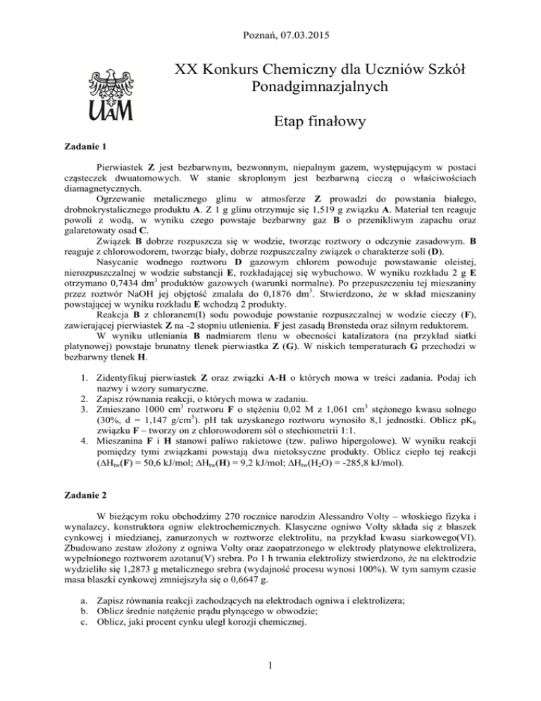 Poznań, 07.03.2015 XX Konkurs Chemiczny dla Uczniów Szkół Ponadgimnazjalnych Etap finałowy Zadanie 1 Pierwiastek Z jest bezbarwnym, bezwonnym, niepalnym gazem, występującym w postaci cząsteczek dwuatomowych. W stanie skroplonym jest bezbarwną cieczą o właściwościach diamagnetycznych. Ogrzewanie metalicznego glinu w atmosferze Z prowadzi do powstania białego, drobnokrystalicznego produktu A. Z 1 g glinu otrzymuje się 1,519 g związku A. Materiał ten reaguje powoli z wodą, w wyniku czego powstaje bezbarwny gaz B o przenikliwym zapachu oraz galaretowaty osad C. Związek B dobrze rozpuszcza się w wodzie, tworząc roztwory o odczynie zasadowym. B reaguje z chlorowodorem, tworząc biały, dobrze rozpuszczalny związek o charakterze soli (D). Nasycanie wodnego roztworu D gazowym chlorem powoduje powstawanie oleistej, nierozpuszczalnej w wodzie substancji E, rozkładającej się wybuchowo. W wyniku rozkładu 2 g E otrzymano 0,7434 dm3 produktów gazowych (warunki normalne). Po przepuszczeniu tej mieszaniny przez roztwór NaOH jej objętość zmalała do 0,1876 dm3. Stwierdzono, że w skład mieszaniny powstającej w wyniku rozkładu E wchodzą 2 produkty. Reakcja B z chloranem(I) sodu powoduje powstanie rozpuszczalnej w wodzie cieczy (F), zawierającej pierwiastek Z na -2 stopniu utlenienia. F jest zasadą Brønsteda oraz silnym reduktorem. W wyniku utleniania B nadmiarem tlenu w obecności katalizatora (na przykład siatki platynowej) powstaje brunatny tlenek pierwiastka Z (G). W niskich temperaturach G przechodzi w bezbarwny tlenek H. 1. Zidentyfikuj pierwiastek Z oraz związki A-H o których mowa w treści zadania. Podaj ich nazwy i wzory sumaryczne. 2. Zapisz równania reakcji, o których mowa w zadaniu. 3. Zmieszano 1000 cm3 roztworu F o stężeniu 0,02 M z 1,061 cm3 stężonego kwasu solnego (30%, d = 1,147 g/cm3). pH tak uzyskanego roztworu wynosiło 8,1 jednostki. Oblicz pKb związku F – tworzy on z chlorowodorem sól o stechiometrii 1:1. 4. Mieszanina F i H stanowi paliwo rakietowe (tzw. paliwo hipergolowe). W wyniku reakcji pomiędzy tymi związkami powstają dwa nietoksyczne produkty. Oblicz ciepło tej reakcji (Htw(F) = 50,6 kJ/mol; Htw(H) = 9,2 kJ/mol; Htw(H2O) = -285,8 kJ/mol). Zadanie 2 W bieżącym roku obchodzimy 270 rocznice narodzin Alessandro Volty – włoskiego fizyka i wynalazcy, konstruktora ogniw elektrochemicznych. Klasyczne ogniwo Volty składa się z blaszek cynkowej i miedzianej, zanurzonych w roztworze elektrolitu, na przykład kwasu siarkowego(VI). Zbudowano zestaw złożony z ogniwa Volty oraz zaopatrzonego w elektrody platynowe elektrolizera, wypełnionego roztworem azotanu(V) srebra. Po 1 h trwania elektrolizy stwierdzono, że na elektrodzie wydzieliło się 1,2873 g metalicznego srebra (wydajność procesu wynosi 100%). W tym samym czasie masa blaszki cynkowej zmniejszyła się o 0,6647 g. a. Zapisz równania reakcji zachodzących na elektrodach ogniwa i elektrolizera; b. Oblicz średnie natężenie prądu płynącego w obwodzie; c. Oblicz, jaki procent cynku uległ korozji chemicznej. 1 Poznań, 07.03.2015 Zadanie 3 Chloran(I) wapnia jest wykorzystywany m.in. do sporządzania roztworów dezynfekcyjnych do basenów i do wybielania tkanin. Techniczny produkt jest mieszaniną chloranu(I) wapnia i chlorku wapnia, zawierającą kilka procent wody. a. Zaproponuj dowolną metodę otrzymywania chloranu(I) wapnia wykorzystując chlorek sodu jako źródło atomów chloru. b. W celu ustalenia składu technicznego chloranu(I) wapnia 1,0000 g produktu rozpuszczono w wodzie, uzyskując 100 cm3 roztworu. 10 cm3 tak przygotowanego roztworu przeniesiono do kolby, a następnie dodano nadmiar jodku potasu. Wydzielony jod odmiareczkowano za pomocą roztworu arsenianu(III) sodu o stężeniu 0,02 M, zużywając 44,6 cm3 titranta. Do kolejnych 10 cm3 roztworu dodano nadmiar roztworu kwasu szczawiowego (kwasu etanodiowego). Wytrącony osad odsączono, przemyto małą ilością wody i wysuszono, otrzymując 93,0 mg monowodnego szczawianu wapnia. Podaj procentowy skład technicznego chloranu(I) wapnia. c. Stężenie chloranu(I) wapnia w roztworze wybielającym musi wynosić 0,3%. Ile technicznego produktu (o składzie obliczonym w punkcie b) należy użyć, aby otrzymać 3 m3 roztworu (d = 1 g/cm3). Zadanie 4 Właściwości chemiczne substancji stosowanych w laboratorium wymuszają często na prowadzącym doświadczenia określone postępowanie. Wyjaśnij dlaczego (swoje rozumowanie poprzyj równaniami reakcji): a. b. c. d. e. f. g. h. Stapianie ze stałym NaOH prowadzi się w naczyniach srebrnych lub niklowych nie zaś w porcelanowych? Roztwory fluorowodoru przechowuje się w butelkach z polietylenu lub polipropylenu a nie w szklanych? Benzaldehyd (aldehyd benzoesowy) destyluje się każdorazowo przed użyciem? Roztwory azotanu(V) srebra przechowuje się w naczyniach z ciemnego szkła? Czerwony fosfor przed użyciem przemywa się wodą destylowaną (a następnie suszy)? Miano (stężenie) roztworów manganianu(VII) potasu ustala się przed każdym ich użyciem do celów analitycznych? Przy sporządzaniu wodnych roztworów azotanu(V) rtęci(II) do mieszaniny dodaje się niewielką ilość kwasu azotowego(V)? Cyjanku potasu nie dodaje się do roztworów kwaśnych? 2 Poznań, 07.03.2015 Zadanie 5 α-Pinen jest głównym składnikiem terpentyny – uzyskiwanego na drodze ekstrakcji bądź destylacji z parą wodną olejku eterycznego różnych gatunków sosen i innych drzew iglastych. Jest przedstawicielem dużej grupy związków pochodzenia naturalnego – terpenów. a. Ile chiralnych atomów posiada α-pinen? Ile istnieje stereoizomerów α-pinenu – narysuj ich wzory. b. Chlorowodór ulega addycji do α-pinenu, tworząc ciekły produkt A, zawierający 33,9% chloru. Gęstość par tego związku wynosi 6,217 g/dm3 (T = 410 K, p = 101,3 kPa). Ten sam produkt powstaje w wyniku reakcji chlorowodoru z innym węglowodorem z grupy terpenów – limonenem (1-metylo-4-(1-mety