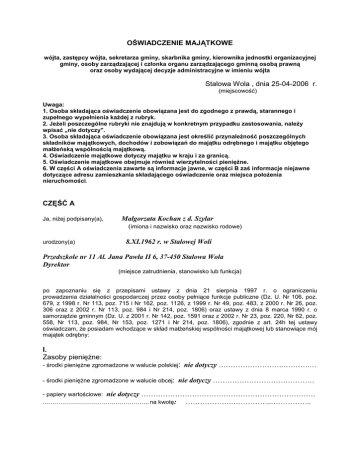 OŚWIADCZENIE MAJĄTKOWE wójta, zastępcy wójta, sekretarza gminy, skarbnika gminy, kierownika jednostki organizacyjnej gminy, osoby zarządzającej i członka organu zarządzającego gminną osobą prawną oraz osoby wydającej decyzje administracyjne w imieniu wójta Stalowa Wola , dnia 25-04-2006 r. (miejscowość) Uwaga: 1. Osoba składająca oświadczenie obowiązana jest do zgodnego z prawdą, starannego i zupełnego wypełnienia kaŜdej z rubryk. 2. JeŜeli poszczególne rubryki nie znajdują w konkretnym przypadku zastosowania, naleŜy wpisać „nie dotyczy". 3. Osoba składająca oświadczenie obowiązana jest określić przynaleŜność poszczególnych składników majątkowych, dochodów i zobowiązań do majątku odrębnego i majątku objętego małŜeńską wspólnością majątkową. 4. Oświadczenie majątkowe dotyczy majątku w kraju i za granicą. 5. Oświadczenie majątkowe obejmuje równieŜ wierzytelności pienięŜne. 6. W części A oświadczenia zawarte są informacje jawne, w części B zaś informacje niejawne dotyczące adresu zamieszkania składającego oświadczenie oraz miejsca połoŜenia nieruchomości. CZĘŚĆ A Ja, niŜej podpisany(a), urodzony(a) Małgorzata Kochan z d. Szylar (imiona i nazwisko oraz nazwisko rodowe) 8.XI.1962 r. w Stalowej Woli Przedszkole nr 11 Al. Jana Pawła II 6, 37-450 Stalowa Wola Dyrektor (miejsce zatrudnienia, stanowisko lub funkcja) po zapoznaniu się z przepisami ustawy z dnia 21 sierpnia 1997 r. o ograniczeniu prowadzenia działalności gospodarczej przez osoby pełniące funkcje publiczne (Dz. U. Nr 106, poz. 679, z 1998 r. Nr 113, poz. 715 i Nr 162, poz. 1126, z 1999 r. Nr 49, poz. 483, z 2000 r. Nr 26, poz. 306 oraz z 2002 r. Nr 113, poz. 984 i Nr 214, poz. 1806) oraz ustawy z dnia 8 marca 1990 r. o samorządzie gminnym (Dz. U. z 2001 r. Nr 142, poz. 1591 oraz z 2002 r. Nr 23, poz. 220, Nr 62, poz. 558, Nr 113, poz. 984, Nr 153, poz. 1271 i Nr 214, poz. 1806), zgodnie z art. 24h tej ustawy oświadczam, Ŝe posiadam wchodzące w skład małŜeńskiej wspólności majątkowej lub stanowiące mój majątek odrębny: I. Zasoby pienięŜne: - środki pienięŜne zgromadzone w walucie polskiej: - środki pienięŜne zgromadzone w walucie obcej: nie dotyczy ……………………….……….… nie dotyczy …………………………………… - papiery wartościowe: nie dotyczy ……………………………………………………………… …………………………………………….. na kwotę: ……………….……………..…………….. II. 1. Dom o powierzchni: tytuł prawny: ………………….m2 , o wartości: …………………………….. …… ………………………………………..……………………………….. 2. Mieszkanie o powierzchni: tytuł prawny: …… 54 m2 , o wartości: ………………..……………..…. ………spółdzielcze….…………………….………………………………. 3. Gospodarstwo rolne: rodzaj gospodarstwa: o wartości: ……… … nie dotyczy ………… , powierzchnia: …………….……….. ……………………………..…………………………………………….……….. rodzaj zabudowy: ……………………………………..…………………………………………………. tytuł prawny: ……………………………………………………………………………………………… Z tego tytułu osiągnąłem(ęłam) w roku ubiegłym przychód i dochód w wysokości: ………………… ……………….……………………………………………………….. 4. Inne nieruchomości: powierzchnia: o wartości: nie dotyczy ………………………………………….………………….…. … nie dotyczy ………………………………………………………………… tytuł prawny: … nie dotyczy……………………………………………………….…………………… III. 1. Posiadam udziały w spółkach handlowych — naleŜy podać liczbę i emitenta udziałów: nie dotyczy ………………………..……………………………………………………. …………………. ………………………………………………..……………………………………… udziały te stanowią pakiet większy niŜ 10% udziałów w spółce: … nie dotyczy ….…………… ……………………………………………………………………………………………………………. Z tego tytułu osiągnąłem(ęłam) w roku ubiegłym dochód w wysokości: … nie dotyczy ….… ……………………………………………………………………………………………………………. IV. 1. Posiadam akcje w spółkach handlowych — naleŜy podać liczbę i emitenta akcji: nie dotyczy ………………………….………………..…………………………………………….. …………………………………………………………………………………………………………. akcje te stanowią pakiet większy niŜ 10% akcji w spółce: … ……………………………………. …………………………………………………………………………………………………………. Z tego tytułu osiągnąłem(ęłam) w roku ubiegłym dochód w wysokości: … nie dotyczy..…. ………………………………………………………………………………………………………….. V. Nabyłem(am) (nabył mój małŜonek, z wyłączeniem mienia przynaleŜnego do jego majątku odrębnego) od Skarbu Państwa, innej państwowej osoby prawnej, jednostek samorządu terytorialnego, ich związków lub od komunalnej osoby prawnej następujące mienie, które podlegało zbyciu w drodze przetargu — naleŜy podać opis mienia i datę nabycia, od kogo: nie dotyczy ………………………