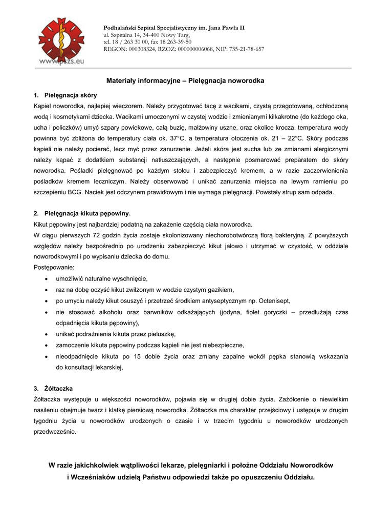 Podhalański Szpital Specjalistyczny im. Jana Pawła II ul. Szpitalna 14, 34-400 Nowy Targ, tel. 18 / 263 30 00, fax 18 263-39-50 REGON: 000308324, RZOZ: 000000006068, NIP: 735-21-78-657 Materiały informacyjne – Pielęgnacja noworodka 1. Pielęgnacja skóry Kąpiel noworodka, najlepiej wieczorem. Należy przygotować tacę z wacikami, czystą przegotowaną, ochłodzoną wodą i kosmetykami dziecka. Wacikami umoczonymi w czystej wodzie i zmienianymi kilkakrotne (do każdego oka, ucha i policzków) umyć szpary powiekowe, całą buzię, małżowiny uszne, oraz okolice krocza. temperatura wody powinna być zbliżona do temperatury ciała ok. 37°C, a temperatura otoczenia ok. 21 – 22°C. Skóry podczas kąpieli nie należy pocierać, lecz myć przez zanurzenie. Jeżeli skóra jest sucha lub ze zmianami alergicznymi należy kąpać z dodatkiem substancji natłuszczających, a następnie posmarować preparatem do skóry noworodka. Pośladki pielęgnować po każdym stolcu i zabezpieczyć kremem, a w razie zaczerwienienia pośladków kremem leczniczym. Należy obserwować i unikać zanurzenia miejsca na lewym ramieniu po szczepieniu BCG. Naciek jest odczynem prawidłowym i nie wymaga pielęgnacji. Powstały strup sam odpada. 2. Pielęgnacja kikuta pępowiny. Kikut pępowiny jest najbardziej podatną na zakażenie częścią ciała noworodka. W ciągu pierwszych 72 godzin życia zostaje skolonizowany niechorobotwórczą florą bakteryjną. Z powyższych względów należy bezpośrednio po urodzeniu zabezpieczyć kikut jałowo i utrzymać w czystość, w oddziale noworodkowymi i po wypisaniu dziecka do domu. Postępowanie: umożliwić naturalne wyschnięcie, raz na dobę oczyść kikut zwilżonym w wodzie czystym gazikiem, po umyciu należy kikut osuszyć i przetrzeć środkiem antyseptycznym np. Octenisept, nie stosować alkoholu oraz barwników odkażających (jodyna, fiolet goryczki – przedłużają czas odpadnięcia kikuta pępowiny), unikać podrażnienia kikuta przez pieluszkę, zamoczenie kikuta pępowiny podczas kąpieli nie jest niebezpieczne, nieodpadnięcie kikuta po 15 dobie życia oraz zmiany zapalne wokół pępka stanowią wskazania do konsultacji lekarskiej, 3. Żółtaczka Żółtaczka występuje u większości noworodków, pojawia się w drugiej dobie życia. Zażółcenie o niewielkim nasileniu obejmuje twarz i klatkę piersiową noworodka. Żółtaczka ma charakter przejściowy i ustępuje w drugim tygodniu życia u noworodków urodzonych o czasie i w trzecim tygodniu u noworodków urodzonych przedwcześnie. W razie jakichkolwiek wątpliwości lekarze, pielęgniarki i położne Oddziału Noworodków i Wcześniaków udzielą Państwu odpowiedzi także po opuszczeniu Oddziału.