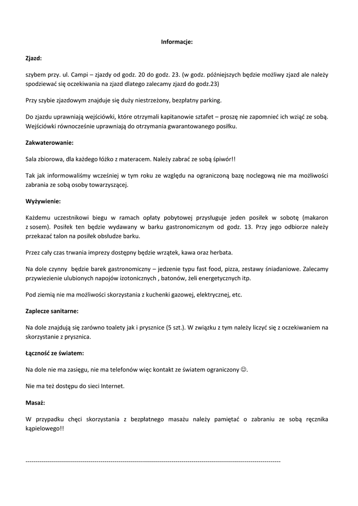 Informacje: Zjazd: szybem przy. ul. Campi – zjazdy od godz. 20 do godz. 23. (w godz. późniejszych będzie możliwy zjazd ale należy spodziewać się oczekiwania na zjazd dlatego zalecamy zjazd do godz.23) Przy szybie zjazdowym znajduje się duży niestrzeżony, bezpłatny parking. Do zjazdu uprawniają wejściówki, które otrzymali kapitanowie sztafet – proszę nie zapomnieć ich wziąć ze sobą. Wejściówki równocześnie uprawniają do otrzymania gwarantowanego posiłku. Zakwaterowanie: Sala zbiorowa, dla każdego łóżko z materacem. Należy zabrać ze sobą śpiwór!! Tak jak informowaliśmy wcześniej w tym roku ze względu na ograniczoną bazę noclegową nie ma możliwości zabrania ze sobą osoby towarzyszącej. Wyżywienie: Każdemu uczestnikowi biegu w ramach opłaty pobytowej przysługuje jeden posiłek w sobotę (makaron z sosem). Posiłek ten będzie wydawany w barku gastronomicznym od godz. 13. Przy jego odbiorze należy przekazać talon na posiłek obsłudze barku. Przez cały czas trwania imprezy dostępny będzie wrzątek, kawa oraz herbata. Na dole czynny będzie barek gastronomiczny – jedzenie typu fast food, pizza, zestawy śniadaniowe. Zalecamy przywiezienie ulubionych napojów izotonicznych , batonów, żeli energetycznych itp. Pod ziemią nie ma możliwości skorzystania z kuchenki gazowej, elektrycznej, etc. Zaplecze sanitarne: Na dole znajdują się zarówno toalety jak i prysznice (5 szt.). W związku z tym należy liczyć się z oczekiwaniem na skorzystanie z prysznica. Łączność ze światem: Na dole nie ma zasięgu, nie ma telefonów więc kontakt ze światem ograniczony ☺. Nie ma też dostępu do sieci Internet. Masaż: W przypadku chęci skorzystania z bezpłatnego masażu należy pamiętać o zabraniu ze sobą ręcznika kąpielowego!! ------------------------------------------------------------------------------------------------------------------------------ Weryfikacja: Należy zabrać ze sobą dowód osobisty lub inny dokument tożsamości ze zdjęciem. Do weryfikacji potrzebny jest cały skład sztafety. Start/meta: Na start wychodzimy wspólnie o godz. 9.30 z boiska sportowego znajdującego się w okolicach biura zawodów. Na start idzie tylko jedna osoba ze sztafety, która rozpoczynać będzie rywalizację (nie musi to być kapitan). Reszta zawodników oczekuje w strefie zmian bądź na poziomie gdzie znajduje się biuro zawodów, zaplecze gastronomiczne itp. Każdy zawodnik ma obowiązek mieć zamontowany na bucie chip (otrzymacie go podczas weryfikacji), który służy do pomiaru czasu i ilości pokonywanych okrążeń. Brak chipa skutkuje niezaliczaniem pokonywanych okrążeń. Zawodnicy startują z 5 stref startowych, każdy numer startowy przypisany jest do konkretnej strefy i z niej należy wystartować. W każdej strefie będzie sędzia, który dokona weryfikacji zawodników. Start następuje na sygnał syreny alarmowej o godz. 10.00. Trasa biegu prowadzi wąskimi korytarzami, obowiązuje ruch prawostronny, należy zachować szczególną uwagę przy wyprzedzaniu, przebieganiu przez torowiska itp. Po 12 godzinach na dźwięk syreny alarmowej zawodnicy znajdujący się na trasie biegu mają obowiązek się zatrzymać i oczekiwać na przybycie sędziów. Sędziowie zdejmą numery startowe i oznaczą miejsce w którym się zatrzymaliście tak abyśmy mogli dokładnie zmierzyć pokonany dystans przez każdą sztafetę. A później przyjdzie czas na zasłużony odpoczynek i integrację ☺. Do zobaczenia w podziemiach bocheńskiej kopalni! ----------------------------------------------------------------------------------------------------------------------------------------------------Imprezę wspierają: Igloo Parker Hannifin Sales Poland Kler Powerade Plastbud Feelgood Kopalnia Soli Bochnia Miasto Bochnia -------------------------------------------------------------------------------------------------------------------------Potwierdzenie wpłaty: Za wniesioną opłatę pobytową można otrzymać rachunek – dane na rachunek należy zostawić w biurze zawodów – w czasie biegu wystawimy odpowiedni dokument i będzie można go odebrać.