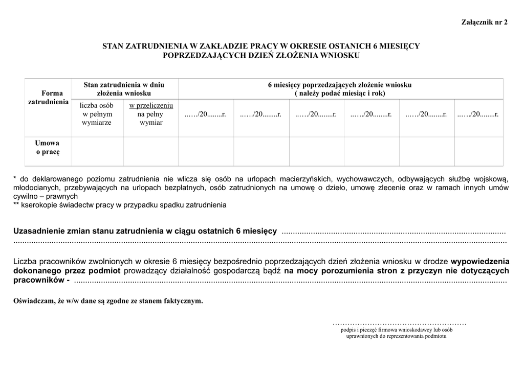 Załącznik nr 2 STAN ZATRUDNIENIA W ZAKŁADZIE PRACY W OKRESIE OSTANICH 6 MIESIĘCY POPRZEDZAJĄCYCH DZIEŃ ZŁOŻENIA WNIOSKU Forma zatrudnienia Stan zatrudnienia w dniu złożenia wniosku liczba osób w pełnym wymiarze w przeliczeniu na pełny wymiar 6 miesięcy poprzedzających złożenie wniosku ( należy podać miesiąc i rok) ..…./20........r. ..…./20........r. ..…./20........r. ..…./20........r. ..…./20........r. ..…./20........r. Umowa o pracę * do deklarowanego poziomu zatrudnienia nie wlicza się osób na urlopach macierzyńskich, wychowawczych, odbywających służbę wojskową, młodocianych, przebywających na urlopach bezpłatnych, osób zatrudnionych na umowę o dzieło, umowę zlecenie oraz w ramach innych umów cywilno – prawnych ** kserokopie świadectw pracy w przypadku spadku zatrudnienia Uzasadnienie zmian stanu zatrudnienia w ciągu ostatnich 6 miesięcy .................................................................................................... ............................................................................................................................................................................................................................ Liczba pracowników zwolnionych w okresie 6 miesięcy bezpośrednio poprzedzających dzień złożenia wniosku w drodze wypowiedzenia dokonanego przez podmiot prowadzący działalność gospodarczą bądź na mocy porozumienia stron z przyczyn nie dotyczących pracowników - ................................................................................................................................................................................................. Oświadczam, że w/w dane są zgodne ze stanem faktycznym. ……………………………………………… podpis i pieczęć firmowa wnioskodawcy lub osób uprawnionych do reprezentowania podmiotu