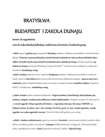 BRATYSŁWA BUDAPESZT I ZAKOLA DUNAJU termin: do uzgodnienia cena do indywidualnej kalkulacji, uzależniona od terminu i liczebności grupy 1 dzień: wyjazd o godzinie 05.00 , przejazd do Bratysławy, spotkanie z lokalnym przewodnikiem, zwiedzanie stolicy Słowacji: Parlament z panoramą Bratysławy, Zamek Królewski, Konkatedra św. Marcina, Brama Michalska, Pałace Palfich i de Pauliho, Rynek, ratusz, kościół Franciszkański, Opera, deptak przy Dunaju . Na koniec godzinny rejs statkiem po Dunaju pod mostami Bratysławy. Przyjazd do hotelu***, zakwaterowanie w pokojach 2-3 osobowych z łazienkami, obiadokolacja, nocleg. 2 dzień: śniadanie, wykwaterowanie i wyjazd do Budapesztu, spotkanie z lokalnym przewodnikiem, zwiedzanie miasta: wjazd na Górę Gellerta, skąd możemy podziwiać panoramę, Budapesztu,następnie spacer po ulicy Vaci w śródmieściu ( główny deptak handlowy miasta, czas wolny na zakupy) zwiedzanie bazyliki św .Stefana, Przyjazd do hotelu*** w Budapeszcie, obiadokolacja, nocleg. 3 dzień: :śniadanie, dalsze zwiedzanie Budapesztu : Wzgórze Zamkowe ( kościół Macieja, Baszta Rybacka, plac zamkowy , następnie zwiedzanie placu Millenium i zamku Vajdehunyadivar. Następnie przejazd do restauracji na na wieczór węgierski: kolacja regionalna all inclusive - w regionalnej restauracji, tak zwanej CSARDZIE 30 lokalnych potraw do wyboru, piwo, wino i szampan bez limitu, grana na żywo muzyka regionalna, muzyka cygańska oraz pokaz węgierskich tancerzy . Powrót do hotelu okolo godziny 23.00, nocleg. 4 dzień: śniadanie, wykwaterowanie, wyjazd na zwiedzanie Szentendre - urocze miasto artystów( ceramika, sztuka ludowa, produkcja wyrobów z marcepana). Esztergom- kolebki katolicyzmu na Węgrzech z olbrzymią bazyliką, jedną z największych na świecie. obiad w regionalnej restauracji: „Szalma”. Wyjazd do kraju. 5 dzień: Zakończenie imprezy około godz.6.00 nad ranem. cena obejmuje: -Przejazd autokarem ( 2 kierowców ) -1 nocleg w Hotelu *** w Bratysławie -2 noclegi w Hotelu*** w Budapeszcie ( pokoje 2 osobowe z łazienkami ) -3 śniadania, 1 obiad ,1 kolacja regionalne, 2 obiadokolacje -wynajęcie miejscowych przewodników w Budapeszcie i Bratysławie -rejs statkiem -bilety wstępu do zwiedzanych obiektów -ubezpieczenie KL i NNW -opieka pilota na całej trasie POSIADAMY SYSTEM SŁUCHAWKOWY TOUR GUIDE, dzieki niemu, usłyszą państwo kazde słowo pilota i przewodnika, nawet w najbardziej zatłoczonym miejscu!