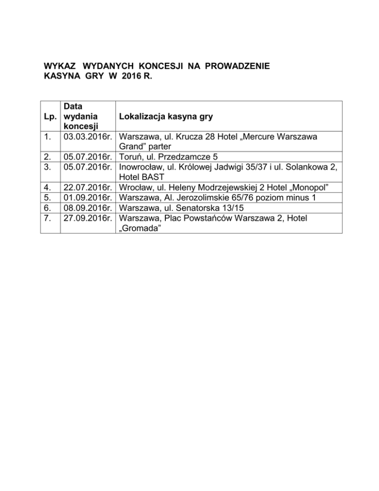 WYKAZ WYDANYCH KONCESJI NA PROWADZENIE KASYNA GRY W 2016 R. Data Lp. wydania Lokalizacja kasyna gry koncesji 1. 03.03.2016r. Warszawa, ul. Krucza 28 Hotel „Mercure Warszawa Grand” parter 2. 05.07.2016r. Toruń, ul. Przedzamcze 5 3. 05.07.2016r. Inowrocław, ul. Królowej Jadwigi 35/37 i ul. Solankowa 2, Hotel BAST 4. 22.07.2016r. Wrocław, ul. Heleny Modrzejewskiej 2 Hotel „Monopol” 5. 01.09.2016r. Warszawa, Al. Jerozolimskie 65/76 poziom minus 1 6. 08.09.2016r. Warszawa, ul. Senatorska 13/15 7. 27.09.2016r. Warszawa, Plac Powstańców Warszawa 2, Hotel „Gromada”