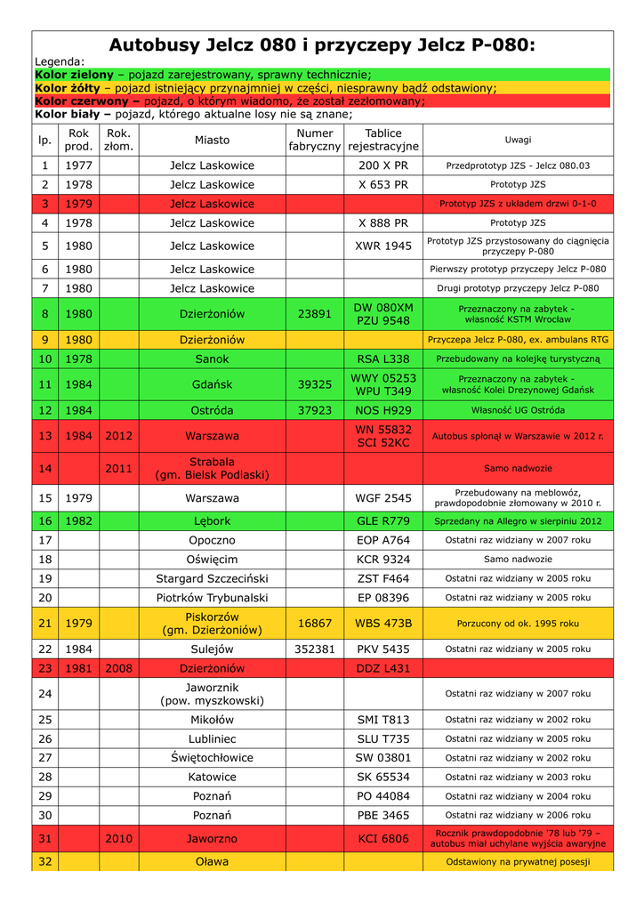 Autobusy Jelcz 080 i przyczepy Jelcz P-080: Legenda: Kolor zielony – pojazd zarejestrowany, sprawny technicznie; Kolor żółty – pojazd istniejący przynajmniej w części, niesprawny bądź odstawiony; Kolor czerwony – pojazd, o którym wiadomo, że został zezłomowany; Kolor biały – pojazd, którego aktualne losy nie są znane; lp. Rok prod. 1 1977 Jelcz Laskowice 200 X PR Przedprototyp JZS - Jelcz 080.03 2 1978 Jelcz Laskowice X 653 PR Prototyp JZS 3 1979 Jelcz Laskowice 4 1978 Jelcz Laskowice X 888 PR Prototyp JZS 5 1980 Jelcz Laskowice XWR 1945 Prototyp JZS przystosowany do ciągnięcia przyczepy P-080 6 1980 Jelcz Laskowice Pierwszy prototyp przyczepy Jelcz P-080 7 1980 Jelcz Laskowice Drugi prototyp przyczepy Jelcz P-080 8 1980 Dzierżoniów 9 1980 Dzierżoniów 10 1978 Sanok 11 1984 Gdańsk 12 1984 Ostróda 13 1984 14 Rok. złom. Miasto 2012 Warszawa 2011 Strabala (gm. Bielsk Podlaski) Numer Tablice fabryczny rejestracyjne Uwagi Prototyp JZS z układem drzwi 0-1-0 23891 DW 080XM PZU 9548 Przeznaczony na zabytek własność KSTM Wrocław Przyczepa Jelcz P-080, ex. ambulans RTG RSA L338 Przebudowany na kolejkę turystyczną 39325 WWY 05253 WPU T349 Przeznaczony na zabytek własność Kolei Drezynowej Gdańsk 37923 NOS H929 Własność UG Ostróda WN 55832 SCI 52KC Autobus spłonął w Warszawie w 2012 r. Samo nadwozie 15 1979 Warszawa WGF 2545 Przebudowany na meblowóz, prawdopodobnie złomowany w 2010 r. 16 1982 Lębork GLE R779 Sprzedany na Allegro w sierpiniu 2012 17 Opoczno EOP A764 Ostatni raz widziany w 2007 roku 18 Oświęcim KCR 9324 Samo nadwozie 19 Stargard Szczeciński ZST F464 Ostatni raz widziany w 2005 roku 20 Piotrków Trybunalski EP 08396 Ostatni raz widziany w 2005 roku 21 1979 Piskorzów (gm. Dzierżoniów) 16867 WBS 473B Porzucony od ok. 1995 roku 22 1984 Sulejów 352381 PKV 5435 Ostatni raz widziany w 2005 roku 23 1981 2008 Dzierżoniów DDZ L431 24 Jaworznik (pow. myszkowski) 25 Mikołów SMI T813 Ostatni raz widziany w 2002 roku 26 Lubliniec SLU T735 Ostatni raz widziany w 2005 roku 27 Świętochłowice SW 03801 Ostatni raz widziany w 2002 roku 28 Katowice SK 65534 Ostatni raz widziany w 2003 roku 29 Poznań PO 44084 Ostatni raz widziany w 2004 roku 30 Poznań PBE 3465 Ostatni raz widziany w 2006 roku Jaworzno KCI 6806 Rocznik prawdopodobnie '78 lub '79 – autobus miał uchylane wyjścia awaryjne 31 32 2010 Oława Ostatni raz widziany w 2007 roku Odstawiony na prywatnej posesji 33 Warszawa 34 Olsztyn OLC 703S Ostatni raz widziany w 1998 roku 35 Olkusz KOL 52AH Ostatni raz widziany w 2003 roku 36 Będzin SBE 23GM Ostatni raz widziany w 2006 roku 37 Puławy LPU 58PU WZW A715 Ostatni raz widziany w 2007 roku 38 Sława FWS R101 Ostatni raz widziany w 2006 roku Tuchola (gm. Chojnice) BYB 764K Przebudowany na pogotowie techniczne Chojnice GCH 20GV Przebudowany na pogotowie techniczne 41 Nowe Miasto WPN 24MP Ostatni raz widziany w 2007 roku 42 Wola Krzysztopolska CEK 2803 Ostatni raz widziany w 2006 roku Lublin LBD 9608 Ostatni raz widziany w 2010 roku Kraków KVX 3136 Eksponat w jednym z krakowskich muzeów Warszawa UCM 5464 Ostatni raz widziany w 2007 roku Kozienice WKZ E235 Ostatni raz widziany w 2004 roku 39 1980 40 1980 43 2007 1984 44 45 1984 46 47 2007 Ostatni raz widziany w 2005 roku Bielsko - Biała Przebudowany na towarowy 48 Gdynia 49 Gdynia Ostatni raz widziany w 2006 roku 50 Gdynia Ostatni raz widziany w 2006 roku 51 Hrubieszów 52 1984 Kock PBR 4489 LHR A770 40014 Ostatni raz widziany w 2006 roku Ostatni raz widziany w 2006 roku LLB 4X72 53 Łódź LFM 3760 54 Uszczyn (gm. Sulejów) 55 Sanok RWR 0551 Ostatni raz widziany w 2007 roku 56 Olsztyn OLC 837K Ostatni raz widziany w 2007 roku FNW R988 Ostatni raz widziany w 2007 roku Ostatni raz widziany w 2007 roku Ostatni raz widziany w 2007 roku, wrak na złomowisku 57 1980 Nowa Sól 58 1980 Nowa Ruda 23105 WBN 641B Nauka jazdy PKS Dzierżoniów, ostatnia wzmianka w 1985 roku 59 1980 Ząbkowice Śląskie 23464 WBZ 9582 WBN 640B Nauka jazdy 60 1980 Ząbkowice Śląskie 24641 WBZ 641B Ostatnia wzmianka w 1983 roku 61 1980 Ząbkowice Śląskie 24584 WBZ 642B Ostatnia wzmianka w 1984 roku 62 1980 Ząbkowice Śląskie 25582 WBZ 313H Ostatnia wzmianka w 1983 roku WBC 5481 Przebudowany na towarowy, stał na targowisku na ul. Obornickiej 2010 63 2009 Wrocław 64 2009 Wrocław Przebudowany na towarowy, stał na targowisku na ul. Obornickiej 65 Wejherowo GWE 83S7 Ostatni raz widziany w 2008 roku 66 Legionowo WL 38345 Ostatni raz widziany w 2007 roku Poznań PZS 7446 68 Warszawa WIA 7663 Ostatni raz widziany w 2010 roku 69 Pabianice EPA 32YC Ostatni raz widziany w 2011 roku 70 Mysłowice SM 22268 Ostatni raz widziany w 2008 roku 71 Sanok KUD 5312 Ostatni raz widziany w 2007 roku 72 Braniewo 67 1981 2008 Ostatni raz widziany w 2008 roku, samo nadwozie 73 Piaseczno WPI 73C5 Ostatni raz widziany w 2008 roku 74 Sandomierz NOV 7300 Ostatni raz widziany w 2009 roku Gliwice SMI 3U35 KBS 7676 Ostatni raz widziany w 2011 roku, przebudowany na towarowy z paką 75 1980 76 Lubniewice Samo nadwozie 77 Golińsk (gm. Wałbrzych) Samo nadwozie 78 Międzyrzec Podlaski LBI 33CU 79 Legionowo WL 17060 80 Nowogród Bobrzański 81 Jaworzno 82 Sępólno Krajeńskie 83 Czechowice - Dziedzice KXC 4581 Ostatni raz widziany w 2003 roku 84 Czechowice - Dziedzice KXL 2445 Ostatni raz widziany w 2010 roku 85 Czechowice - Dziedzice KCC 1159 Ostatni raz widziany w 2010 roku 86 Krosno KUL 1002 Ostatni raz widziany w 1994 roku Radom ROD 4702 88 Jaworzno KAB 650E Ostatni raz widziany w 2003 roku 89 Poznań PO 24011 Ostatni raz widziany w 2005 roku 90 Gumniska (pow. dębicki) Ostatni raz widziany w 2010 roku, samo nadwozie 91 Łęczyca Ostatni raz widziany w 2010 roku, wrak na złomowisku - samo nadwozie Dębica Samo nadwozie 93 Wieluń Ostatni raz widziany w 2010 roku, połówka nadwozia 94 Augustów 95 Szemud Ostatni raz widziany w 2010 roku, połówka nadwozia 96 Grudziądz Służy jako wieża kontroli lotów na lotnisku 87 2006 92 2011 97