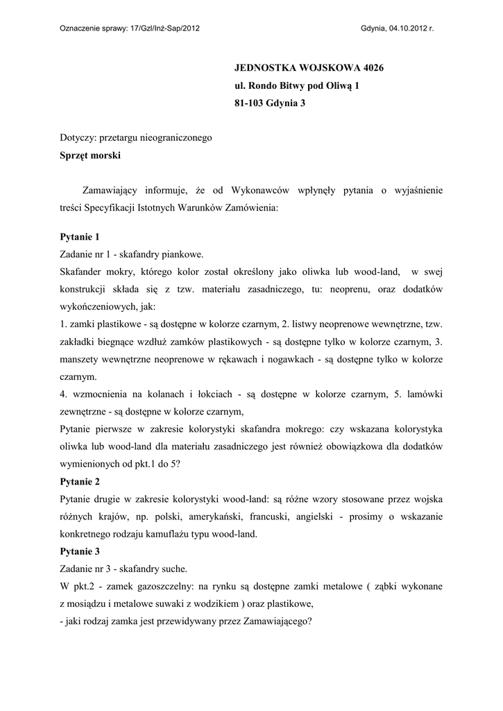 Oznaczenie sprawy: 17/Gzl/Inż-Sap/2012 Gdynia, 04.10.2012 r. JEDNOSTKA WOJSKOWA 4026 ul. Rondo Bitwy pod Oliwą 1 81-103 Gdynia 3 Dotyczy: przetargu nieograniczonego Sprzęt morski Zamawiający informuje, że od Wykonawców wpłynęły pytania o wyjaśnienie treści Specyfikacji Istotnych Warunków Zamówienia: Pytanie 1 Zadanie nr 1 - skafandry piankowe. Skafander mokry, którego kolor został określony jako oliwka lub wood-land, w swej konstrukcji składa się z tzw. materiału zasadniczego, tu: neoprenu, oraz dodatków wykończeniowych, jak: 1. zamki plastikowe - są dostępne w kolorze czarnym, 2. listwy neoprenowe wewnętrzne, tzw. zakładki biegnące wzdłuż zamków plastikowych - są dostępne tylko w kolorze czarnym, 3. manszety wewnętrzne neoprenowe w rękawach i nogawkach - są dostępne tylko w kolorze czarnym. 4. wzmocnienia na kolanach i łokciach - są dostępne w kolorze czarnym, 5. lamówki zewnętrzne - są dostępne w kolorze czarnym, Pytanie pierwsze w zakresie kolorystyki skafandra mokrego: czy wskazana kolorystyka oliwka lub wood-land dla materiału zasadniczego jest również obowiązkowa dla dodatków wymienionych od pkt.1 do 5? Pytanie 2 Pytanie drugie w zakresie kolorystyki wood-land: są różne wzory stosowane przez wojska różnych krajów, np. polski, amerykański, francuski, angielski - prosimy o wskazanie konkretnego rodzaju kamuflażu typu wood-land. Pytanie 3 Zadanie nr 3 - skafandry suche. W pkt.2 - zamek gazoszczelny: na rynku są dostępne zamki metalowe ( ząbki wykonane z mosiądzu i metalowe suwaki z wodzikiem ) oraz plastikowe, - jaki rodzaj zamka jest przewidywany przez Zamawiającego? Oznaczenie sprawy: 17/Gzl/Inż-Sap/2012 Gdynia, 04.10.2012 r. Pytanie 4 - nie ma informacji odnośnie listwy (zamykanej na zamek plastikowy) ochraniającej zamek główny gazoszczelny, pytanie: czy zamek główny ma być bez listwy ochraniającej? Pytanie 5 W pkt. 3 - zamek "miłosierdzia": na rynku jest dostępny zamek gazoszczelny w wersji metalowej ( ząbki z mosiądzu oraz suwak metalowy) oraz plastikowe: - jaki rodzaj zamka "miłosierdzia" jest przewidywany przez Zamawiającego? Pytanie 6 - nie ma informacji odnośnie patki ( zamykanej na rzep ) ochraniającej zamek miłosierdzia, pytanie: czy zamek "miłosierdzia" ma być bez patki ochraniającej? Pytanie 7 W pkt. 5 - manszety neoprenowe - brak sprecyzowania odnośnie lokalizacji, pytanie: czy manszety neoprenowe doszczelniające mają mieć umieszczone w rękawach i w szyi? Pytanie 8 W pkt.8 - kieszenie boczne: nie jest określony sposób zamykania kieszeni, pytanie: jaki jest sposób zamknięcia kieszeni bocznych? STANOWISKO ZAMAWIAJĄCEGO Na podstawie art. 38 ust 1 ustawy roku – Prawo zamówień publicznych (Dz. U. z 2010r. Nr 113, poz. 759), z dnia 29 stycznia 2004 r., Odpowiadając na pytanie 1: Zamawiający dopuszcza kolor czarny w dodatkach wykończeniowych skafandra mokrego tj: zamki, listwy wewnętrzne, manszety wewnętrzne, wzmocnienia na łokciach, kolanach. Odpowiadając na pytanie 2: Zamawiający nie wskazuje na konkretny wzór kamuflażu typu wood-land,jednakże wskazanym byłby wzór kamuflażu zastosowany w skafandrach Elite CamoWetsuit. Odpowiadając na pytanie 3: Zamawiający przewiduje zamki gazoszczelne metalowe, jednocześnie dopuszcza plastikowe. Odpowiadając na pytanie 4: Zamawiający dopuszcza zastosowanie listwy ochraniającej. Oznaczenie sprawy: 17/Gzl/Inż-Sap/2012 Gdynia, 04.10.2012 r. Odpowiadając na pytanie 5: Zamawiający przewiduje zamki gazoszczelne metalowe, jednocześnie dopuszcza plastikowe. Odpowiadając na pytanie 6: Zamawiający dopuszcza zastosowanie patki ochraniającej zamykanej na rzep. Odpowiadając na pytanie 7: Skafander powinien posiadać manszety neoprenowe doszczelniające w rękawach i na szyi. Odpowiadając na pytanie 8: Skafander powinien posiadać kieszenie boczne zamykane na rzep. Zamawiający utrzymuje termin składania ofert, godziny składania i otwarcia ofert nie ulegają zmianie. Dowódca JW 4026 kmdr Dariusz WICHNIAREK