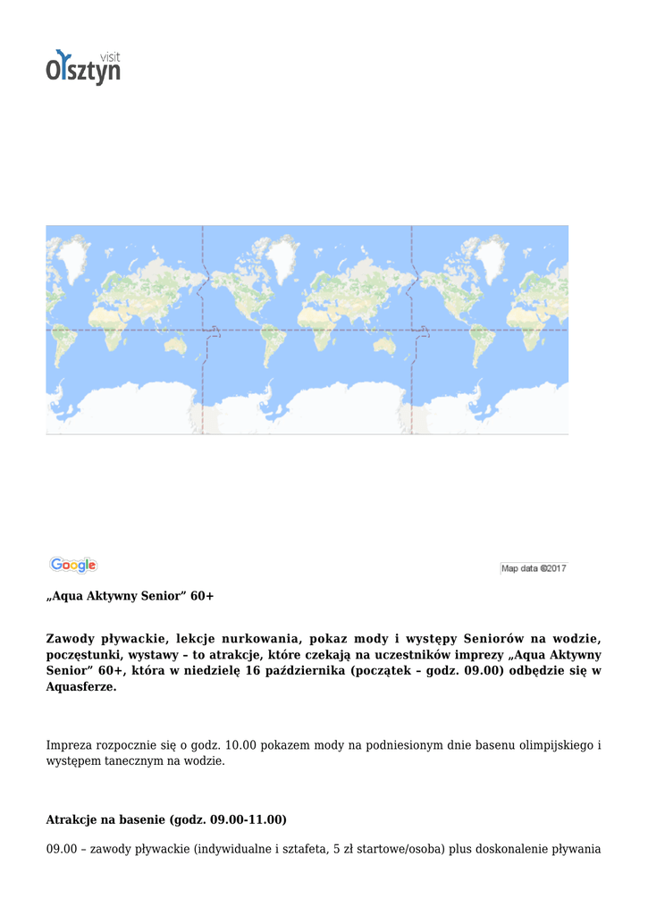 „Aqua Aktywny Senior” 60+ Zawody pływackie, lekcje nurkowania, pokaz mody i występy Seniorów na wodzie, poczęstunki, wystawy – to atrakcje, które czekają na uczestników imprezy „Aqua Aktywny Senior” 60+, która w niedzielę 16 października (początek – godz. 09.00) odbędzie się w Aquasferze. Impreza rozpocznie się o godz. 10.00 pokazem mody na podniesionym dnie basenu olimpijskiego i występem tanecznym na wodzie. Atrakcje na basenie (godz. 09.00-11.00) 09.00 – zawody pływackie (indywidualne i sztafeta, 5 zł startowe/osoba) plus doskonalenie pływania dla chętnych 10.00 – pokaz mody (własne stroje: sportowy i wieczorowy, zapisy: tel. 507-164-646), merenge – występ taneczny na wodzie 17.00-19.00 - pokazowe lekcje nurkowania na basenie Program imprezy (godz. 11.00-14.00) 11.00 – rozpoczęcie imprezy 11.05 – „Pasjonata” Uniwersytetu Trzeciego Wieku – występ chóru 11.25 – Olsztyńska Szkoła Cheerleaders Soltare 11.45 – „BHAVO” UTW – zespół teatralny 12.00 – Przedszkole Miejskie nr 29 w Olsztynie im. Akademii Uśmiechu – pokaz taneczny 12.20 – „Kantata” Jarockiej Akademii Trzeciego Wieku – występ zespołu wokalno-instrumentalnego 12.40 – Placówka edukacyjna Art School – pokaz taneczny 13.00 – „Legenda” – występ chóru ze Stawigudy 13.15 – Walc i Disco Stomp – pokazy taneczne UTW, JATW i Akademii Trzeciego Wieku 13.30 – Zumba Gold – pokaz taneczny 13.45 – „Szczęściary” – Koło Gospodyń Wiejskich Szczęsne – występ wokalno-taneczny 14.00 – zakończenie imprezy W międzyczasie: konkurs wiedzy o Aquasferze z nagrodami, wystawy rękodzieła, malarskie i fotograficzne. Ponadto: „Strefa profilaktyki zdrowia Miejskiego Szpitala Zespolonego” – mierzenie ciśnienia krwi i poziomu cukru Olsztyńskie Towarzystwo „Amazonki” – „Seniorko badając się – wybierasz życie” Szkoła Cosinus – zabiegi kosmetyczne Restauracja Laguna – poczęstunek Masters Olsztyn – zawody pływackie i doskonalenie pływania dla Seniorów Teatr Jaracza – promocje dla Seniorów Pasieka Skarby Warmii – degustacja miodów, kącik pszczelarza Zielarnia Warmińska – stoiska natury: zioła, przyprawy, kosmetyki i herbaty Akademia Nurkowania – lekcje pokazowe na basenie Miejska Biblioteka Publiczna – stanowiska biblioteczne „Olsztyn czyta” z mini wypożyczalnią, czytelnią wraz z możliwością zapisów do biblioteki, zajęcia plastyczno-literackie Light box – słodki i zdrowy poczęstunek Bilet dla Seniora: 5 złotych. 1)Wodne Centrum Rekreacyjno-Sportowe Aquasfera, (2016-10-16 09:00-2016-10-16 14:00) www.visit.olsztyn.eu