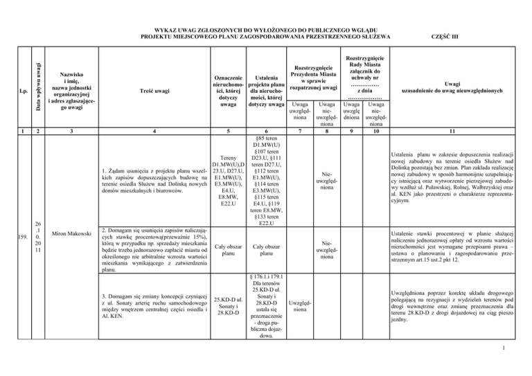 Lp. 1 159. Data wpływu uwagi WYKAZ UWAG ZGŁOSZONYCH DO WYŁOŻONEGO DO PUBLICZNEGO WGLĄDU PROJEKTU MIEJSCOWEGO PLANU ZAGOSPODAROWANIA PRZESTRZENNEGO SŁUŻEWA Nazwisko i imię, nazwa jednostki organizacyjnej i adres zgłaszającego uwagi 2 3 26 .1 0. 20 11 Miron Makowski Rozstrzygnięcie Prezydenta Miasta Oznaczenie Ustalenia w sprawie nieruchomo- projektu planu rozpatrzonej uwagi Treść uwagi ści, której dla nieruchodotyczy mości, której uwaga dotyczy uwaga Uwaga Uwaga uwzględnieniona uwzględniona 4 5 6 7 8 §85 teren D1.MW(U) §107 teren Tereny D23.U, §111 D1.MW(U),D teren D27.U, 1. Żądam usunięcia z projektu planu wszel- 23.U, D27.U, §112 teren Niekich zapisów dopuszczających budowę na E1.MW(U), E1.MW(U), uwzględterenie osiedla Służew nad Dolinką nowych E3.MW(U), §114 teren niona domów mieszkalnych i biurowców. E4.U, E3.MW(U), E8.MW, §115 teren E22.U E4.U, §119 teren E8.MW, §133 teren E22.U 2. Domagam się usunięcia zapisów naliczających stawkę procentową(przeważnie 15%), którą w przypadku np. sprzedaży mieszkania NieCały obszar Cały obszar będzie trzeba jednorazowo zapłacić miastu od uwzględplanu planu określonego nie arbitralnie wzrostu wartości niona mieszkania wynikającego z zatwierdzenia planu. § 176.1.i 179.1 Dla terenów 25.KD-D ul. 3. Domagam się zmiany koncepcji czyniącej Sonaty i 25.KD-D ul. z ul. Sonaty arterię ruchu samochodowego 28.KD-D UwzględSonaty i między wnętrzem centralnej części osiedla i ustala się niona 28.KD-D Al. KEN. przeznaczenie - droga publiczna dojazdowa. Rozstrzygnięcie Rady Miasta załącznik do uchwały nr …………… z dnia ……………… Uwaga Uwaga uwzglę niedniona uwzględniona 9 10 CZĘŚĆ III Uwagi uzasadnienie do uwag nieuwzględnionych 11 Ustalenia planu w zakresie dopuszczenia realizacji nowej zabudowy na terenie osiedla Służew nad Dolinką pozostają bez zmian. Plan zakłada realizację nowej zabudowy w sposób harmonijnie uzupełniający istniejącą oraz wytworzenie pierzejowej zabudowy wzdłuż ul. Puławskiej, Rolnej, Wałbrzyskiej oraz al. KEN jako przestrzeni o charakterze reprezentacyjnym. Ustalenie stawki procentowej w planie służącej naliczeniu jednorazowej opłaty od wzrostu wartości nieruchomości jest wymagane przepisami prawa – ustawa o planowaniu i zagospodarowaniu przestrzennym art.15 ust.2 pkt 12. Uwzględniona poprzez korektę układu drogowego polegającą na rezygnacji z wydzieleń terenów pod drogi wewnętrzne oraz zmianę przeznaczenia dla terenu 28.KD-D z drogi dojazdowej na ciąg pieszo jezdny. 1 160. 27 .1 0. 20 11 161. 27 .1 0. 20 11 162. 02 .1 1. 20 11 163. 02 .1 1. 20 01 1 164. 03 .1 1. 20 11 165. 03 .1 1. 20 11 166. 03 .1 1. 20 11 Dorota Kołątaj 4. Domagam się wprowadzenia zapisu zabraniającego zabudowania istniejącego parkingu naziemnego wzdłuż budynku Sonaty 6 (teren E3). Planowany na jego miejscu parking wielopoziomowy można z powodzeniem usytuować na przeznaczonej w planie do zabudowy mieszkaniowej działce E1, gdzie nie będzie nikomu przeszkadzał. Teren E3.MW(U) §114 teren E3.MW(U) Jak wyżej Jak wyżej Jak wyżej Nieuwzględniona Plan przewiduje uwzględnienie podstawowych parametrów zabudowy określonych w prawomocnej decyzji o warunkach zabudowy i zagospodarowaniu terenu. Ponadto plan zakłada realizację nowej zabudowy w sposób harmonijnie uzupełniający istniejącą oraz wytworzenie pierzejowej zabudowy wzdłuż ul. Puławskiej, Rolnej, Wałbrzyskiej oraz al. KEN jako przestrzeni o charakterze reprezentacyjnym. Jak wyżej Jak wyżej Jak wyżej Jak wyżej Jak wyżej Jak wyżej Jak wyżej Jak wyżej Jak wyżej Jak wyżej Jak wyżej Jak wyżej Jak wyżej Jak wyżej Jak wyżej Jak wyżej Jak wyżej Jak wyżej Jak wyżej Jak wyżej Jak wyżej Jak wyżej Jak wyżej Jak wyżej Jak wyżej Jak wyżej Jak wyżej Jak wyżej Jak wyżej Jak wyżej Jak wyżej Jak wyżej Jak wyżej Jak wyżej Jak wyżej Jak wyżej Jak wyżej Jak wyżej Jak wyżej Józef Bobek Lech Kozerski Robert Czarnecki Lucyna Witkowska Mieczysław Kamiński Michał Mietliński 2 167. 03 .1 1. 20 11 168. 03 .1 1. 20 11 169. 03 .1 1. 20 11 170. 03 .1 1. 20 11 171. 03 .1 1. 20 11 172. 03 .1 1. 20 11 173. 03 .1 1. 20 11 174. 03 .1 1. 20 11 Jak wyżej Jak wyżej Jak wyżej Jak wyżej Jak wyżej Jak wyżej Jak wyżej Jak wyżej Jak wyżej Jak wyżej Jak wyżej Jak wyżej Jak wyżej Jak wyżej Jak wyżej Jak wyżej Jak wyżej Jak wyżej Jak wyżej Jak wyżej Jak wyżej Jak wyżej Jak wyżej Jak wyżej Jak wyżej Jak wyżej Jak wyżej Jak wyżej Jak wyżej Jak wyżej Jak wyżej Jak wyżej Jak wyżej Jak wyżej Jak wyżej Jak wyżej Jak wyżej Jak wyżej Jak wyżej Jak wyżej Jak wyżej Jak wyżej Jak wyżej Jak wyżej Jak wyżej Jak wyżej Jak wyżej Jak wyżej Anna ChwedczukMietlińska Katarzyna Mietlińska Krzysztof Mietliński Izabella Kowalewska Magdalena Woronowicz Stanisław Lech Woronowicz Tadeusz Świątczak Mirosław Godlewski 3 175. 07 .1 1. 20 11 176. 07 .1 1. 20 11 177. 07 .1 1. 20 11 178. 07 .1 1. 20 11 179. 07 .1 1. 20 11 180. 07 .1 1. 20 11 181. 07 .1 1. 20 11 182. 07 .1 1. 20 11 Jak wyżej Jak wyżej Jak wyżej Jak wyżej Jak wyżej Jak wyżej Jak wyżej Jak wyżej Jak wyżej Jak wyżej Jak wyżej Jak wyżej Jak wyżej Jak wyżej Jak wyżej Jak wyżej Jak wyżej Jak wyżej Jak wyżej Jak wyżej Jak wyżej Jak wyżej Jak wyżej Jak wyżej Jak wyżej Jak wyżej Jak wyżej Jak wyżej Jak wyżej Jak wyżej Jak wyżej Jak wyżej Jak wyżej Jak wyżej Jak wyżej Jak wyżej Jak wyżej Jak wyżej Jak wyżej Jak wyżej Jak wyżej Jak wyżej Jak wyżej Jak wyżej Jak wyżej Jak wyżej Jak wyżej Jak wyżej Piotr Fatyga Zdzisław Gandera Rafał Siwiński Anna Podgorska Grzegorz Siwiński Witold Siwiński Kacper Zadura Wiesława Maziarz 4 183. 07 .1 1. 20 11 184. 07 .1 1. 20 11 185. 07 .1 1. 20 11 186. 07 .1 1. 20 11 187. 07 .1 1. 20 11 188. 07 .1 1. 20 11 189. 07 .1 1. 20 11 190. 07 .1 1. 20 11 Jak wyżej Jak wyżej Jak wyżej Jak wyżej Jak wyżej Jak wyżej Jak 