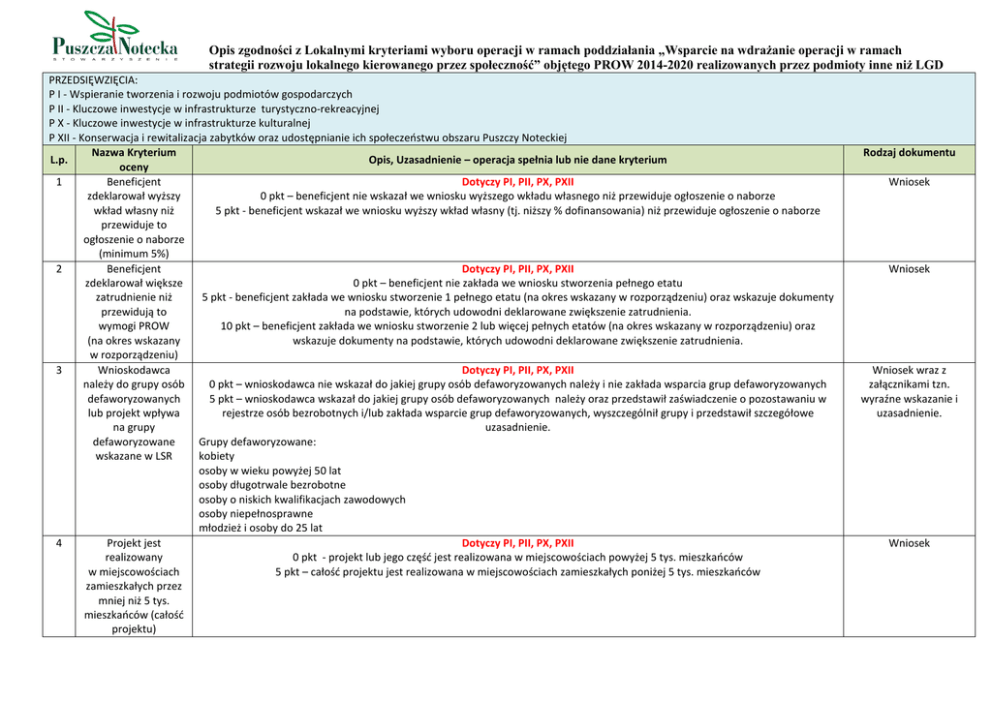 Opis zgodności z Lokalnymi kryteriami wyboru operacji w ramach poddziałania „Wsparcie na wdrażanie operacji w ramach strategii rozwoju lokalnego kierowanego przez społeczność” objętego PROW 2014-2020 realizowanych przez podmioty inne niż LGD PRZEDSIĘWZIĘCIA: P I - Wspieranie tworzenia i rozwoju podmiotów gospodarczych P II - Kluczowe inwestycje w infrastrukturze turystyczno-rekreacyjnej P X - Kluczowe inwestycje w infrastrukturze kulturalnej P XII - Konserwacja i rewitalizacja zabytków oraz udostępnianie ich społeczeństwu obszaru Puszczy Noteckiej Nazwa Kryterium L.p. Opis, Uzasadnienie – operacja spełnia lub nie dane kryterium oceny 1 Beneficjent Dotyczy PI, PII, PX, PXII zdeklarował wyższy 0 pkt – beneficjent nie wskazał we wniosku wyższego wkładu własnego niż przewiduje ogłoszenie o naborze wkład własny niż 5 pkt - beneficjent wskazał we wniosku wyższy wkład własny (tj. niższy % dofinansowania) niż przewiduje ogłoszenie o naborze przewiduje to ogłoszenie o naborze (minimum 5%) 2 Beneficjent Dotyczy PI, PII, PX, PXII 0 pkt – beneficjent nie zakłada we wniosku stworzenia pełnego etatu zdeklarował większe 5 pkt - beneficjent zakłada we wniosku stworzenie 1 pełnego etatu (na okres wskazany w rozporządzeniu) oraz wskazuje dokumenty zatrudnienie niż na podstawie, których udowodni deklarowane zwiększenie zatrudnienia. przewidują to wymogi PROW 10 pkt – beneficjent zakłada we wniosku stworzenie 2 lub więcej pełnych etatów (na okres wskazany w rozporządzeniu) oraz (na okres wskazany wskazuje dokumenty na podstawie, których udowodni deklarowane zwiększenie zatrudnienia. w rozporządzeniu) 3 Wnioskodawca Dotyczy PI, PII, PX, PXII należy do grupy osób 0 pkt – wnioskodawca nie wskazał do jakiej grupy osób defaworyzowanych należy i nie zakłada wsparcia grup defaworyzowanych defaworyzowanych 5 pkt – wnioskodawca wskazał do jakiej grupy osób defaworyzowanych należy oraz przedstawił zaświadczenie o pozostawaniu w lub projekt wpływa rejestrze osób bezrobotnych i/lub zakłada wsparcie grup defaworyzowanych, wyszczególnił grupy i przedstawił szczegółowe na grupy uzasadnienie. defaworyzowane Grupy defaworyzowane: wskazane w LSR kobiety osoby w wieku powyżej 50 lat osoby długotrwale bezrobotne osoby o niskich kwalifikacjach zawodowych osoby niepełnosprawne młodzież i osoby do 25 lat 4 Projekt jest Dotyczy PI, PII, PX, PXII realizowany 0 pkt - projekt lub jego część jest realizowana w miejscowościach powyżej 5 tys. mieszkańców w miejscowościach 5 pkt – całość projektu jest realizowana w miejscowościach zamieszkałych poniżej 5 tys. mieszkańców zamieszkałych przez mniej niż 5 tys. mieszkańców (całość projektu) Rodzaj dokumentu Wniosek Wniosek Wniosek wraz z załącznikami tzn. wyraźne wskazanie i uzasadnienie. Wniosek 5 Projekt jest innowacyjny 6 Realizacja projektów wpływających na obszary interwencji LSR Koszty projektu są adekwatne do zakładanych działań 7 8 Beneficjent będzie promował LGD 9 Okres realizacji operacji 10 Wsparcie grup nieformalnych 11. Lokalny produkt markowy 12. Potrzeba realizacji operacji 13. Wpływ na środowisko Dotyczy P I 0 pkt - wnioskodawca nie wskazał lub uzasadnił innowacyjność projektu w odniesieniu do LSR Rozdział VI.3. Innowacyjność, bądź też jego uzasadnienie jest niezgodne ze stanem faktycznym 5 pkt – wnioskodawca wskazał i uzasadnił innowacyjność projektu w odniesieniu do LSR Rozdział VI.3. Innowacyjność Dotyczy P II, P X, P XII 0 pkt – projekt nie jest innowacyjny 5 pkt – projekt innowacyjny - został partycypacyjnie przedyskutowany i zatwierdzony przez mieszkańców miejscowości, w której będzie realizowany i przedstawiono we wniosku cały proces konsultacji 5 pkt – projekt innowacyjny – zakłada włączenie w realizację projektu społeczności lokalnej (w tym grupy defaworyzowane wskazane w LSR), np. zlecanie prostych prac, prac porządkowych, itp. i przedstawiono w szczegółowy sposób proces włączenia społeczności Wniosek wraz z załącznikami Dotyczy P II, PX, P XII 0 pkt – nie realizuje projektów wpływających na obszary interwencji (z wskazanych w LSR) 10 pkt – projekt zakłada: działania wspierające rozwój zasobów turystycznych, zostało to w sposób szczegółowy uzasadnione Wniosek Dotyczy PI, PII, PX, PXII 0 pkt – koszty projektu nie są adekwatne do założonych działań, bądź ich wartość jest nieracjonalna. Zostały założone koszty nie mające związku z realizowaną operacją 5 pkt – założone koszty są adekwatne i racjonalne do zakładanych działań i zostały szczegółowo uzasadnione Dotyczy PI, PII, PX, PXII 0 pkt – beneficjent nie deklaruje, że będzie promował LGD na tablicy informacyjnej 5 pkt – beneficjent deklaruje, że będzie promował LGD poprzez zamieszczenie logotypów oraz informacji „Operacja wskazana do dofinansowania za pośrednictwem Lokalnej Grupy Działania Puszcza Notecka” na tablicy informacyjnej oraz wskazuje dokumenty, na podstawie których udowodni promocję. Dotyczy PI, PII, PX, PXII 0 pkt – beneficjent deklaruje realizację projektu do 2 lat od podpisania umowy 5 pkt – beneficjent deklaruje realizację projektu do 1 roku od podpisania umowy Dotyczy P II, PX, P XII 0 pkt – projekt nie oddziałuje na grupy nieformalne 5 pkt – działania zawarte w projekcie przyczyniają się do wsparcia grup nieformalnych, takie jak koła gospodyń wiejskich, zespoły pieśni i tańca, itp. i zostało to w sposób szczegółowy uzasadnione. Dotyczy PI, PII, PX, PXII 0 pkt – operacja nie dotyczy produktu, który ma szansę stać się markowym produktem lokalnym 5 pkt - Operacja dotyczy produktu lub usługi, który ma szanse stać się markowym produktem lokalnym ze względu na swoją wyjątkowość i powiązanie z walorami obszaru oraz równolegle wzmacniania markę „LGD Puszcza Notecka” Dotyczy PI, PII, PX, PXII 0 pkt – wnioskodawca nie uzas