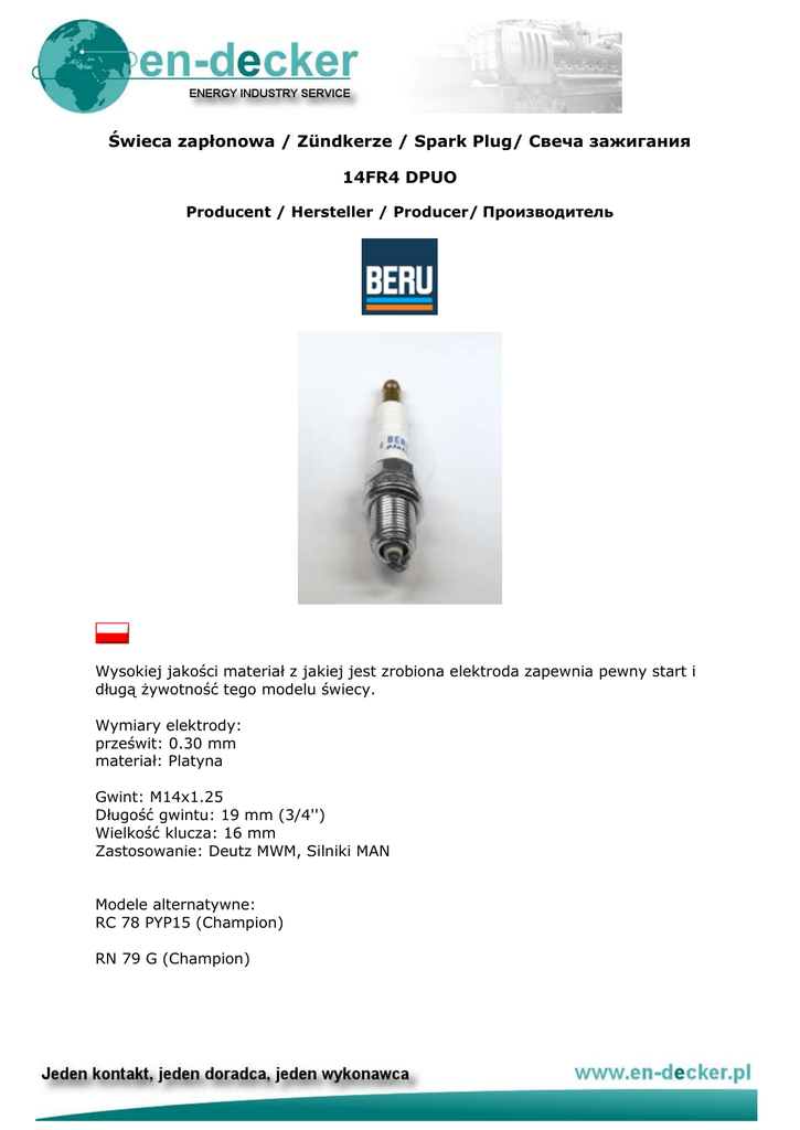 Świeca zapłonowa / Zündkerze / Spark Plug/ Свеча зажигания 14FR4 DPUO Producent / Hersteller / Producer/ Производитель Wysokiej jakości materiał z jakiej jest zrobiona elektroda zapewnia pewny start i długą żywotność tego modelu świecy. Wymiary elektrody: prześwit: 0.30 mm materiał: Platyna Gwint: M14x1.25 Długość gwintu: 19 mm (3/4'') Wielkość klucza: 16 mm Zastosowanie: Deutz MWM, Silniki MAN Modele alternatywne: RC 78 PYP15 (Champion) RN 79 G (Champion) Hochwertiges Elektrodenmaterial der Zündkerze sorgt für eine sichere Zündung und lange Standzeiten. Dachelektrode Elektrodenabstand: 0,30 mm Elektrodenmaterial: Platin Gewinde: M14x1.25 Gewindelänge: 19 mm (3/4") Schlüsselweite: 16 mm Anwendung: Valmet, Deutz MWM, MAN Motoren High-quality electrode material allows a reliable ignition and long service life. Roof electrode gap: 0,30 mm electrode material: Platinum Thread size: M14x1.25 Thread reach: 19 mm (3/4'') Hex size: 16 mm Application: Valmet, Deutz MWM, MAN engines Высокое качество материала ,из которого выполнен електрод обеспечивает безопасный старт и долгий срок службы этой модели свечи . Размер электроды: Зазор: 0,30мм Материал: Платина Резьба:М14x1.25 Длина резьбы:19мм(3/4”) Размер ключа: 16мм Применение:DEUTZ MWM, двигатели MAN Альтернативные модели: PC 78 PYP15 (Champion) PN 79 G (Champion)