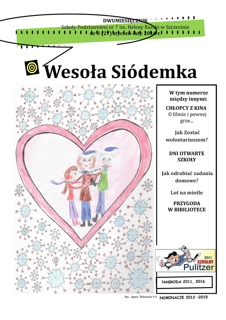 DWUMIESIĘCZNIK Szkoły Podstawowej nr 7 im. Heleny Raszki w Szczecinie nr 3 (27) styczeń-luty 2016 r. Wesoła Siódemka W tym numerze między innymi: CHŁOPCY Z KINA O filmie i pewnej grze... Jak Zostać wolontariuszem? DNI OTWARTE SZKOŁY Jak odrabiać zadania domowe? Lot na miotle PRZYGODA W BIBILIOTECE NAGRODA 2011, 2016 Rys.: Agata Żbikowska V b NOMINACJE 2012 –2015 NIETAJNE, AKTUALNE Od redakcji Wstępniak Drogie Czytelniczki! Drodzy Czytelnicy! Serdecznie witamy Was w nowym roku oraz w nowym numerze „Wesołej Siódemki”! Jesteśmy już po feriach, w nowym semestrze i wygląda na to, że na następną przerwę trochę poczekamy. Będzie to dopiero pod koniec marca na Wielkanoc. Więc, żeby czas Wam szybciej minął, najlepiej będzie coś zjeść. Ale nie jakieś zwykłe i nudne potrawy, tylko ich ciekawsze wersje. W tym celu zajrzyjcie na strony 14 i 15. Co jeszcze można robić, żeby się nie nudzić? Hmm, niech się zastanowimy… W sumie nie zaszkodziłoby obejrzeć jakiegoś filmu. A jak film, to oczywiście musi być dobry. Jeśli nie wiecie, jaki wybrać, to zapraszamy Was do działu recenzji na stronach 10 oraz 11. Ale niestety nie można cały czas tak sobie tylko odpoczywać. Trzeba też dbać o swoje oceny i odrabiać te tony zadań domowych. Jak to robić szybciej, żeby mieć więcej wolnego czasu, dowiecie się na stronie 7. No, dobra. Czas już powoli kończyć. Następnie spotkamy się dopiero pod koniec kwietnia, więc już teraz życzymy Wam Wesołych Świąt Wielkanocnych i sił, żeby jakość przeżyć ten cały miesiąc. Redaktor naczelny, Paweł Naglacki VI b O ZIMIE Wierszyk Gdy tylko biało za oknami idziemy bawić się śnieżkami. Czy na nartach, czy na lodzie daj się ponieść tej swobodzie. Bałwana ze śniegu ulepić, z marchewki nos mu doczepić. Bawić się z koleżankami i pojeździć z nimi sankami. Zawsze fajnie jest na dworze, gdy się każdy bawić może. Str. 2 Wesoła Siódemka Najlepiej bawić się, gdy grupę stworzy się. NIETAJNE, AKTUALNE DOBRE RADY Co zrobić, by nie zachorować Zima, zima i po zimie…chciałoby się powiedzieć i odetchnąć wreszcie pełna piersią. Niestety okres przedwiośnia jak żaden inny sprzyja przeziębieniom, katarom, kaszlom, zapaleniom i tym podobnym paskudztwom. Chcesz ich uniknąć - przedstawiamy kilka mniej lub bardziej oczywistych porad... 1.Ubieraj się stosownie do pogody. 2.Odżywiaj się odpowiednio . 3. Prowadź aktywny tryb życia. 4. Jedz systematycznie i ilości odpowiednie do swojego wieku. 5.Unikaj kontaktu z osobami chorymi. Jak zapobiegać chorobom? Jak najczęściej wietrz pomieszczenia, w których przebywasz. Gdy czujesz się nieswojo, skonsultuj się z lekarzem i stosuj do jego zaleceń. Jedz produkty naturalne wspomagające odporność, np. czosnek. Unikaj w miarę możliwości stosowania zbyt dużej ilości leków i suplementów diety. 5. Systematycznie kontroluj stan zdrowia. Najlepiej zastosuj się do powyższych zasad i nie zachorujesz !!! Marcel Hec Karolina Hołubasz IV b CHŁOPCY Z KINA O filmie i pewnej grze... Jak większość z was wie, 19 stycznia 2016 roku odbyła się szkolna wycieczka do kina na film „Chłopcy z Placu Broni”. Jeżeli myślicie, że było to zwykłe wyjście na zwykły seans, to jesteście w błędzie. Przed seansem była lekcja. „Ale nudy!” pomyślicie. No co wy! Nie po to przecież wychodzimy do kina, żeby się uczyć, ale dlatego, by właśnie nie mieć lekcji. Na szczęście nie była to zwyczajna lekcja, ale specjalne kinowe zajęcia o reklamie. Na tej kinowej lekcji nikt się nie nudził, bo przecież nie można nudzić się, grając w ciekawa grę. Wyobraźcie sobie: cała sala kinowa dzieciaków gra w grę, w której ekran jest planszą. Poszczególne pola to kategorie (hasła) związane z reklamą. Po tym, jak pionek przesuwał się po planszy o wyrzuconą ilość oczek na kostce i stanął na właściwym polu, wyświetlał się film reklamowy oraz historia jego powstania, a „nauczyciel reklamy” opowiadał ciekawostki związane z tą kategorią. I tak doszliśmy do mety. A co było na mecie - hmm, możecie się dowiedzieć, idąc na taką lekcję. No ale film też oglądaliśmy. Opowiadał on o przygodach chłopców z „Placu Broni” (Kto by się domyślił?), a szczególnie o najmłodszym z nich Nemeczku. Ulubionym miejscem zabaw chłopaków był plac, na którym niegdyś stał tartak. Pech chciał, że miejsce to spodobało się też ich odwiecznym wrogom, chłopcom z ogrodu botanicznego. Chłopcy prowadzili nieustanne walki ze swoimi przeciwnikami o ten plac. Ostatecznie okazało się, że nie mieli o co walczyć, bo na placu wybudowana została kamienica. Film był równie interesujący co lekcja kinowa, właściwie to nie potrafię powiedzieć, co bardziej mi się podobało. Tymoteusz Hapczyk IV b Nr 2 str. 3 Str. 3 NIETAJNE, AKTUALNE W pogoni za szczęściem innych XXIV finał Wielkiej Orkiestry Swwiątecznej Pomocy Czym jest finał WOŚP wie chyba każdy. I chyba każdy chętnie w nim uczestniczy. Jednak nie każdy jest wolontariuszem. Na początku stycznia 2016 r. odbył się XXIV finał WOŚP. My zbieraliśmy w ramach zbiórki organizowanej przez sztab WOŚP w hufcu ZHP ,,Pogodno" (to taki oddział harcerzy przyp. red.). Nasza harcerska grupka „Ogników“ (i my dwoje) zebrała chyba z 800 zł i srebro do przetopienia, które podarowała nam pewna pani na ulicy. Zbieraliśmy na ulicach w centrum Szczecina. W tym roku można powiedzieć, że było bardzo dużo wolontariuszy, czasami nawet więcej niż darczyńców. Spotykaliśmy czasem osoby ofiarnie pomagające, a czasem tylko średnio. Nasz sztab zebrał podobno 70 tys. zł, najwięcej w Szczecinie. Było nam zimno, ale odczuwaliśmy dumę, że tyle zebraliśmy. Nigdy nie zapomnimy tego zaszczytu, bo wiemy, że na pewno dzięki nam chociaż kilkoro dzieci będzie zdrowych i kilka osób dożyje spokojnej starości. … Nasz sztab zebrał (…) 70 tys. zł. ... T