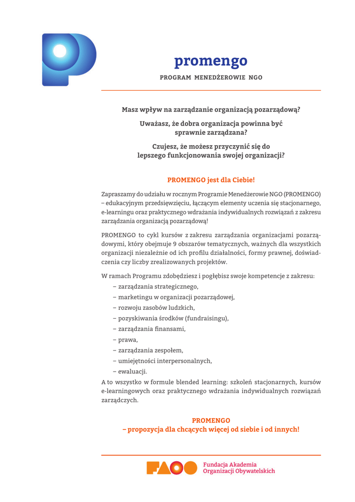 promengo PROGRAM MENEDŻEROWIE NGO Masz wpływ na zarządzanie organizacją pozarządową? Uważasz, że dobra organizacja powinna być sprawnie zarządzana? Czujesz, że możesz przyczynić się do lepszego funkcjonowania swojej organizacji? PROMENGO jest dla Ciebie! Zapraszamy do udziału w rocznym Programie Menedżerowie NGO (PROMENGO) – edukacyjnym przedsięwzięciu, łączącym elementy uczenia się stacjonarnego, e-learningu oraz praktycznego wdrażania indywidualnych rozwiązań z zakresu zarządzania organizacją pozarządową! PROMENGO to cykl kursów z zakresu zarządzania organizacjami pozarządowymi, który obejmuje 9 obszarów tematycznych, ważnych dla wszystkich organizacji niezależnie od ich profilu działalności, formy prawnej, doświadczenia czy liczby zrealizowanych projektów. W ramach Programu zdobędziesz i pogłębisz swoje kompetencje z zakresu: – zarządzania strategicznego, – marketingu w organizacji pozarządowej, – rozwoju zasobów ludzkich, – pozyskiwania środków (fundraisingu), – zarządzania finansami, – prawa, – zarządzania zespołem, – umiejętności interpersonalnych, – ewaluacji. A to wszystko w formule blended learning: szkoleń stacjonarnych, kursów e-learningowych oraz praktycznego wdrażania indywidualnych rozwiązań zarządczych. PROMENGO – propozycja dla chcących więcej od siebie i od innych! promengo PROGRAM MENEDŻEROWIE NGO Weź udział w PROMENGO, a: – poznasz zasady skutecznego i nowoczesnego zarządzania organizacjami pozarządowymi, – staniesz się uczestnikiem największego w Polsce projektu edukacyjnego dla kadry zarządzającej NGO, – przeżyjesz unikalne doświadczenie edukacyjne, łączące stacjonarną, klasyczną naukę z kursem e-learningowym, – otrzymasz wsparcie w postaci indywidualnych konsultacji od trenerów/trenerek – doświadczonych menedżerów/menedżerek NGO, – będziesz miał/miała okazję wdrożyć nowe rozwiązania i narzędzia zarządcze pod okiem ekspertów, – spotkasz się z ponad czterdziestoma menedżerami i menedżerkami organizacji pozarządowych z całej Polski, – wymienisz się doświadczeniami dotyczącymi kierowania instytucjami trzeciego sektora. PROMENGO – program dla menedżerów NGO Jeżeli: – pełnisz funkcję menedżera w organizacji pozarządowej (jesteś członkiem zarządu, dyrektorem, kierownikiem lub zajmujesz inne stanowisko, ale odpowiadasz za działanie organizacji), – masz minimum 2-letnie doświadczenie w zarządzaniu, – pracujesz w organizacji posiadającej osiągnięcia, stały zespół i własny majątek, – chcesz uczyć się po to, by lepiej zarządzać organizacją, – masz wizję zmiany, jaką chcesz wprowadzić i jesteś zdeterminowany/ zdeterminowana, by to zrealizować, – rozumiesz, że dobre zarządzanie wymaga systemowego myślenia i opiera się na takich wartościach, jak usamodzielnianie ludzi i ciągłe doskonalenie (procesów, struktur, zespołów i jednostek, samego/samej siebie), to PROMENGO jest właśnie dla Ciebie! –2– promengo PROGRAM MENEDŻEROWIE NGO Program Menedżerowie NGO realizowany jest przez Fundację Akademia Organizacji Obywatelskich, powołaną przez Polsko-Amerykańską Fundację Wolności, instytucję od kilkunastu lat wspierającą sektor pozarządowy i obywatelski w Polsce, znaną m.in. z programów: „Równać Szanse”, „Działaj Lokalnie”, „Programu Rozwoju Bibliotek”, „Liderzy PAFW”, „Lokalne Partnerstwa PAFW”. Więcej na temat Fundacji Akademia Organizacji Obywatelskich znajdziesz pod adresem: www.faoo.pl. Szkolenia stacjonarne, kursy e-learningowe oraz konsultacje indywidualne prowadzą doświadczeni trenerzy i trenerki z wieloletnim doświadczeniem menedżerskim w NGO, co wpływa nie tylko na wysoki poziom merytoryczny zajęć, ale również umożliwia przekładanie teoretycznych treści na praktyczne zastosowanie w codziennym kierowaniu organizacją pozarządową. Program Menedżerowie NGO rusza 20 czerwca 2013 r. Składa się z 9 szkoleń – zjazdów stacjonarnych (plus dodatkowo jednego na rozpoczęcie i jednego na zakończenie nauki) oraz 9 kursów e-learningowych. Każdy zjazd, i powiązany z nim kurs e-learningowy, dotyczy jednego z ważnych obszarów zarządzania organizacją pozarządową. W ramach bezpłatnego Programu Menedżerowie NGO: – weźmiesz udział w 11 zjazdach stacjonarnych w Warszawie (dwóch 1-dniowych, sześciu 2-dniowych, trzech 3-dniowych), – otrzymasz dostęp do 9 kursów e-learningowych, stanowiących wstęp do zajęć warsztatowych, – uzyskasz wsparcie trenerów/trenerek w zakresie wdrażania wybranych rozwiązań w swojej organizacji, – nawiążesz kontakt z ponad czterdziestoma menedżerami/menedżerkami organizacji pozarządowych, – otrzymasz certyfikat ukończenia Programu Menedżerowie NGO. Wejdź na stronę www.faoo.pl/rekrutacja, dowiedz się więcej i wyślij formularz zgłoszeniowy! Pośpiesz się, masz czas tylko do 22 maja! Program Menedżerowie NGO sfinansowany został ze środków Polsko-Amerykańskiej Fundacji Wolności. –3–