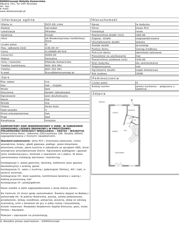 DOMOConcept Matylda Komarnicka Oboźna 101, 52-244 Wrocław tel. fax. e-mail: www.domoconcept.pl Informacje ogólne Nieruchomość Oferta nr DCP-DS-1444 Garaż w budynku Rodzaj sprzedaż Okna nowe PCV Lokalizacja Wrocław Instalacje nowe Dzielnica Krzyki Powierzchnia działki [m2] 260.00 Ulica ok.Biwakowej/nowy komfortowy dom Zagosp. działki zagospodarowana Ukształtowanie działki płaska Liczba pokoi 5 Kształt działki prostokąt Pow. całkowita [m2] 230.00 m² Rodzaj domu szereg środkowy Cena 1150000.00 PLN Pokrycie dachu dachówka betonowa Cena/m2 5000.00 Pozwolenie na użytkowanie tak Status aktualna Powierzchnia użytkowa [m2] 230,00 Imię i nazwisko Matylda Komarnicka Stan budynku do zamieszkania Telefon komórkowy 603 353 991 Podpiwniczenie tak Telefon 603 353 991 Ogrodzenie działki cegła klinkierowa E-mail [email protected] Rok budowy 2008 Opis Pomieszczenia Plac zabaw nie Liczba pokoi 5 Gaz tak - miejski Rodzaj kuchni Woda jest aneks kuchenny - połączony z jadalnią Otoczenie działki zabudowane Ogrzewanie piec dwufunkcyjny Alarm nie Winda nie Tarasy taras duży Ilość tarasów 1 Drzwi antywłamaniowe tak Prąd jest Kanalizacja miejska KOMFORTOWY DOM JEDNORODZINNY Z 2008r. W ZABUDOWIE SZEREGOWEJ (SZEREG ŚRODKOWY) W PRESTIŻOWEJ POŁUDNIOWEJ DZIELNICY WROCŁAWIA – KRZYKI - WOJSZYCE. Powierzchnia domu: całkowita 230/użytkowa 190. Działka 260m2 zagospodarowana z licznymi nasadzeniami. Standard wykończenia: okna PCV i drewniane połaciowe, rolety zewnętrzne, ściany: gładź gipsowa, podłogi: jasne drewniane, drewniane schody, jasna kuchnia w zabudowie ze sprzętem AGD, drzwi zewnętrzne antywłamaniowe Dierre. Ogrzewanie podłogowe i gazowe (piec kondensacyjny), kominek z nawiewem na I piętro. W domu zamontowana instalacja alarmowa i monitoring. kondygnacja I: pokój gościnny, łazienka, kotłownia (piec gazowy dwufunkcyjny) z pralnią, garaż. kondygnacja II: salon z kuchnią i jadalnią( ok.70mkw), WC i hall, w salonie kominek, kondygnacja III: dwie sypialnie, komfortowa łazienka z wanną i kabiną prysznicową, hall kondygnacja IV: pokój/gabinet. Nowe osiedle w pełni zagospodarowane z dużą ilością zieleni. Do Centrum 15 minut jazdy samochodem. Świetny dojazd na Bielany i autostradę A4. W pobliżu Biedronka, poczta, szkoła podstawowa, przedszkole, sklepy osiedlowe, piekarnia, pizzeria, sklep ze zdrową żywnością, orlik z boiskiem do gry w piłkę nożną i koszykówkę, ścieżki rowerowe. Niedaleko Akademicki Szpital Kliniczny, park, kluby fitness i Aquapark. Polecam i zapraszam na prezentację. © Wszelkie prawa zastrzeżone - DOMOConcept Zdjęcia