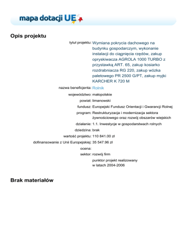 Opis projektu tytuł projektu: Wymiana pokrycia dachowego na budynku gospodarczym, wykonanie instalacji do ciągnięcia rzędów, zakup opryskiwacza AGROLA 1000 TURBO z przystawką ART. 65, zakup kosiarko rozdrabniacza RG 220, zakup wózka paletowego PR 2500 G/PT, zakup myjki KARCHER K 720 M nazwa beneficjenta: Rolnik województwo: małopolskie powiat: limanowski fundusz: Europejski Fundusz Orientacji i Gwarancji Rolnej program: Restrukturyzacja i modernizacja sektora żywnościowego oraz rozwój obszarów wiejskich działanie: 1.1. Inwestycje w gospodarstwach rolnych dziedzina: brak wartość projektu: 110 841.00 zł dofinansowanie z Unii Europejskiej: 35 547.96 zł ocena: sektor: rozwój firm punktor projekt realizowany w latach 2004-2006 Brak materiałów