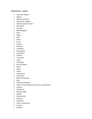 Średniowiecze – pojęcia Renovatio Imperii Digesta Kodeks Justyniana Synkretyzm religijny Państwo patrymonialne Beneficjum Arianizm Merowingowie Islam Hidżra Kalif Wezyr Koran Meczet Walhalla Feudalizm Komendacja Beneficjum Prekaria Immunitet Lenno Hołd lenny Renta feudalna Senior Wasal trybut Inwestytura Ikonoklazm Reforma kluniacka Runy Reforma karolińska Siedem sztuk wyzwolonych (trivium, quadrivium) Drużyna Dziesięcina Dagome iudex Palatyn Ekskomunika Symonia Nepotyzm Spór o inwestyturę Krucjaty Seldżucy Saraceni Interdykt Krucjata ludowa Cesarstwo Łacińskie Chan Orda Złota Orda Statut Krzywoustego Senior Junior Prynceps Wielka Karta Swobód Stany Generalne Inkwizycja Trójpolówka Lokowanie na prawie polskich i niemieckim Zasadźca Sołtys Wójt Prawo składu Hanza Gildia Cechy Złota bulla Niewola awiniońska papieży Wojna stuletnia Rekonkwista Wojna Dwóch Róż Czarna śmierć Husytyzm Wielka wojna z zakonem krzyżackim Wojna trzynastoletnia Związek Pruski Związek Jaszczurczy Inkorporacja