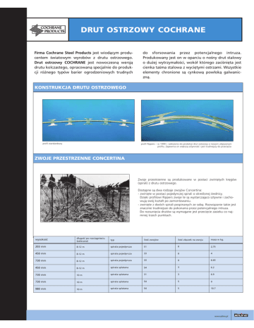 ® DRUT OSTRZOWY COCHRANE Firma Cochrane Steel Products jest wiodàcym producentem Êwiatowym wyrobów z drutu ostrzowego. Drut ostrzowy COCHRANE jest nowoczesnà wersjà drutu kolczastego, opracowanà specjalnie do produkcji ró˝nego typów barier ogrodzeniowych trudnych do sforsowania przez potencjalnego intruza. Produkowany jest on w oparciu o noÊny drut stalowy o du˝ej wytrzyma∏oÊci, wokó∏ którego zaciÊni´ta jest cienka taÊma stalowa z wyci´tymi ostrzami. Wszystkie elementy chronione sà cynkowà pow∏okà galwanicznà. KONSTRUKCJA DRUTU OSTRZOWEGO profil standardowy profil Rippers – w 1999 r. wdro˝ono do produkcji drut ostrzowy o nowym ulepszonym profilu. Zapewnia on wi´kszà sztywnoÊç i jest trudniejszy do przeci´cia ZWOJE PRZESTRZENNE CONCERTINA Zwoje przestrzenne sà produkowane w postaci zwini´tych kr´gów (spirali) z drutu ostrzowego. Dost´pne sà dwa rodzaje zwojów Concertina: - zwini´te w postaci pojedynczej spirali o okreÊlonej Êrednicy. Dzi´ki profilowi Rippers zwoje te sà wystarczajàco sztywne i zachowujà swój kszta∏t po zamontowaniu. - zwini´te z dwóch spirali pospinanych ze sobà. Rozwiàzanie takie jest znacznie trudniejsze do pokonania przez potencjalnego intruza. Do rozsuni´cia drutów sà wymagane jest przeci´cie zasieku co najmniej trzech punktach. wysokoÊç d∏ugoÊç po rozciàgni´ciu (zalecana) typ iloÊç zwojów iloÊç z∏àczek na zwoju masa w kg. 203 mm 8-12 m spirala pojedyncza 51 0 2,75 450 mm 8-12 m spirala pojedyncza 33 0 4 730 mm 8-12 m spirala pojedyncza 33 0 6.65 450 mm 8-12 m spirala splatana 54 3 6.2 730 mm 10 m spirala splatana 31 3 6.9 730 mm 10 m spirala splatana 54 5 9 980 mm 10 m spirala splatana 54 5 10.7 www.atline.pl DRUT OSTRZOWY COCHRANE ® ZWOJE P¸ASKIE zwoje p∏askie Zwoje p∏askie 900 mm zainstalowane na istniejàcym ogrodzeniu znacznie utrudniajà próby przechodzenia i rozcinania ogrodzenia. JednoczeÊnie nie stanowià zagro˝enia dla postronnych przechodniów. wysokoÊç d∏ugoÊç po rozciàgni´ciu masa w kg. 500 mm 15 m 10.5 700 mm 15 m 14.75 900 mm 15 m 16.5 ZGRZEWANA SIATKA Z DRUTU OSTRZOWEGO Zgrzewana siatka ogrodzeniowa z drutu ostrzowego stanowi bardzo dobre i trwa∏e ogrodzenie, bardzo trudne do sforsowania bez u˝ycia specjalnych narz´dzi. Nadaje si´ szczególnie do obiektów wojskowych i zak∏adów karnych. Doskona∏e medium do instalowania elektronicznych systemów wykrywajàcych próby forsowania np. czujników wibracyjnych. Siatka jest produkowana w arkuszach o wymiarach 6m x 2,1m lub 6m x 1,8m. Do transportu pakowana jest w rolki po 15 arkuszy. Ogrodzenie o wysokoÊci 2,1m wykonuje si´ z pojedynczych arkuszy o wymiarach 2100mm x 6000mm. Konstrukcj´ noÊnà stanowià s∏upy ogrodzeniowe z poziomo rozciàgni´tymi ocynkowanymi drutami stalowymi o Êrednicy 4mm. Zalecana odleg∏oÊç pomi´dzy s∏upami wynosi 3000mm. odkos z taÊmy CONCERTNA ogrodzenie z taÊmy stalowej CONCERTNA ZAPORY MOBILNE Z zasieków typu Concertina produkowane sà doskona∏e zapory mobilne, przeznaczone do szybkiego zainstalowania i ∏atwego przewo˝enia z miejsca na miejsce. Wykonane sà one z 3 po∏àczonych wzajemnie zwojów umocowanych do specjalnego stela˝u. Zapory sà przewo˝one na przyczepie transportowej. Trzech pracowników jest wstanie w ciàgu 2-3 min. zbudowaç zapor´ o d∏ugoÊci 200 m i wymiarach 2100 mm x 6000 mm. www.atline.pl