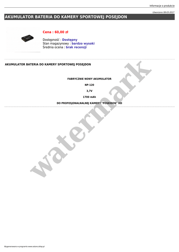Informacje o produkcie Utworzono 08-03-2017 AKUMULATOR BATERIA DO KAMERY SPORTOWEJ POSEJDON Cena : 60,00 zł Dostępność : Dostępny Stan magazynowy : bardzo wysoki Średnia ocena : brak recenzji er m ar k AKUMULATOR BATERIA DO KAMERY SPORTOWEJ POSEJDON FABRYCZNIE NOWY AKUMULATOR NP-120 3,7V 1700 mAh w at DO PROFESJONALNALNEJ KAMERY "POSEIDON" HD Wygenerowano w programie www.estore.sklep.pl