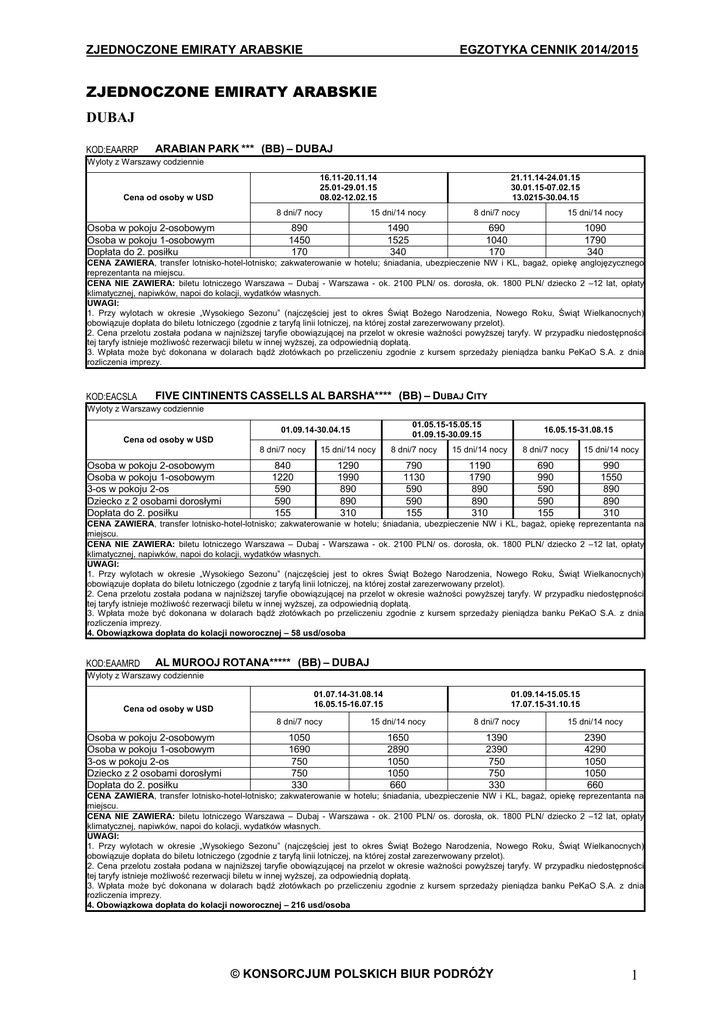 ZJEDNOCZONE EMIRATY ARABSKIE EGZOTYKA CENNIK 2014/2015 ZJEDNOCZONE EMIRATY ARABSKIE DUBAJ KOD:EAARRP ARABIAN PARK *** (BB) – DUBAJ Wyloty z Warszawy codziennie 16.11-20.11.14 25.01-29.01.15 08.02-12.02.15 Cena od osoby w USD Osoba w pokoju 2-osobowym Osoba w pokoju 1-osobowym Dopłata do 2. posiłku 21.11.14-24.01.15 30.01.15-07.02.15 13.0215-30.04.15 8 dni/7 nocy 15 dni/14 nocy 8 dni/7 nocy 15 dni/14 nocy 890 1450 170 1490 1525 340 690 1040 170 1090 1790 340 CENA ZAWIERA, transfer lotnisko-hotel-lotnisko; zakwaterowanie w hotelu; śniadania, ubezpieczenie NW i KL, bagaż, opiekę anglojęzycznego reprezentanta na miejscu. CENA NIE ZAWIERA: biletu lotniczego Warszawa – Dubaj - Warszawa - ok. 2100 PLN/ os. dorosła, ok. 1800 PLN/ dziecko 2 –12 lat, opłaty klimatycznej, napiwków, napoi do kolacji, wydatków własnych. UWAGI: 1. Przy wylotach w okresie „Wysokiego Sezonu” (najczęściej jest to okres Świąt Bożego Narodzenia, Nowego Roku, Świąt Wielkanocnych) obowiązuje dopłata do biletu lotniczego (zgodnie z taryfą linii lotniczej, na której został zarezerwowany przelot). 2. Cena przelotu została podana w najniższej taryfie obowiązującej na przelot w okresie ważności powyższej taryfy. W przypadku niedostępności tej taryfy istnieje możliwość rezerwacji biletu w innej wyższej, za odpowiednią dopłatą. 3. Wpłata może być dokonana w dolarach bądź złotówkach po przeliczeniu zgodnie z kursem sprzedaży pieniądza banku PeKaO S.A. z dnia rozliczenia imprezy. KOD:EACSLA FIVE CINTINENTS CASSELLS AL BARSHA**** (BB) – DUBAJ CITY Wyloty z Warszawy codziennie 01.05.15-15.05.15 01.09.15-30.09.15 01.09.14-30.04.15 Cena od osoby w USD Osoba w pokoju 2-osobowym Osoba w pokoju 1-osobowym 3-os w pokoju 2-os Dziecko z 2 osobami dorosłymi Dopłata do 2. posiłku 16.05.15-31.08.15 8 dni/7 nocy 15 dni/14 nocy 8 dni/7 nocy 15 dni/14 nocy 8 dni/7 nocy 15 dni/14 nocy 840 1220 590 590 155 1290 1990 890 890 310 790 1130 590 590 155 1190 1790 890 890 310 690 990 590 590 155 990 1550 890 890 310 CENA ZAWIERA, transfer lotnisko-hotel-lotnisko; zakwaterowanie w hotelu; śniadania, ubezpieczenie NW i KL, bagaż, opiekę reprezentanta na miejscu. CENA NIE ZAWIERA: biletu lotniczego Warszawa – Dubaj - Warszawa - ok. 2100 PLN/ os. dorosła, ok. 1800 PLN/ dziecko 2 –12 lat, opłaty klimatycznej, napiwków, napoi do kolacji, wydatków własnych. UWAGI: 1. Przy wylotach w okresie „Wysokiego Sezonu” (najczęściej jest to okres Świąt Bożego Narodzenia, Nowego Roku, Świąt Wielkanocnych) obowiązuje dopłata do biletu lotniczego (zgodnie z taryfą linii lotniczej, na której został zarezerwowany przelot). 2. Cena przelotu została podana w najniższej taryfie obowiązującej na przelot w okresie ważności powyższej taryfy. W przypadku niedostępności tej taryfy istnieje możliwość rezerwacji biletu w innej wyższej, za odpowiednią dopłatą. 3. Wpłata może być dokonana w dolarach bądź złotówkach po przeliczeniu zgodnie z kursem sprzedaży pieniądza banku PeKaO S.A. z dnia rozliczenia imprezy. 4. Obowiązkowa dopłata do kolacji noworocznej – 58 usd/osoba KOD:EAAMRD AL MUROOJ ROTANA***** (BB) – DUBAJ Wyloty z Warszawy codziennie 01.07.14-31.08.14 16.05.15-16.07.15 Cena od osoby w USD Osoba w pokoju 2-osobowym Osoba w pokoju 1-osobowym 3-os w pokoju 2-os Dziecko z 2 osobami dorosłymi Dopłata do 2. posiłku 01.09.14-15.05.15 17.07.15-31.10.15 8 dni/7 nocy 15 dni/14 nocy 8 dni/7 nocy 15 dni/14 nocy 1050 1690 750 750 330 1650 2890 1050 1050 660 1390 2390 750 750 330 2390 4290 1050 1050 660 CENA ZAWIERA, transfer lotnisko-hotel-lotnisko; zakwaterowanie w hotelu; śniadania, ubezpieczenie NW i KL, bagaż, opiekę reprezentanta na miejscu. CENA NIE ZAWIERA: biletu lotniczego Warszawa – Dubaj - Warszawa - ok. 2100 PLN/ os. dorosła, ok. 1800 PLN/ dziecko 2 –12 lat, opłaty klimatycznej, napiwków, napoi do kolacji, wydatków własnych. UWAGI: 1. Przy wylotach w okresie „Wysokiego Sezonu” (najczęściej jest to okres Świąt Bożego Narodzenia, Nowego Roku, Świąt Wielkanocnych) obowiązuje dopłata do biletu lotniczego (zgodnie z taryfą linii lotniczej, na której został zarezerwowany przelot). 2. Cena przelotu została podana w najniższej taryfie obowiązującej na przelot w okresie ważności powyższej taryfy. W przypadku niedostępności tej taryfy istnieje możliwość rezerwacji biletu w innej wyższej, za odpowiednią dopłatą. 3. Wpłata może być dokonana w dolarach bądź złotówkach po przeliczeniu zgodnie z kursem sprzedaży pieniądza banku PeKaO S.A. z dnia rozliczenia imprezy. 4. Obowiązkowa dopłata do kolacji noworocznej – 216 usd/osoba © KONSORCJUM POLSKICH BIUR PODRÓŻY 1 ZJEDNOCZONE EMIRATY ARABSKIE KOD:EASOF EGZOTYKA CENNIK 2014/2015 SOFITEL DUBAI JUMEIRAH BEACH ***** (BB) – DUBAJ Wyloty z Warszawy codziennie Cena od osoby w USD Osoba w pokoju 2-osobowym Osoba w pokoju 1-osobowym Dziecko z 2 osobami dorosłymi Dopłata do 2. posiłku 16.09.14-25.12.14 03.01.15-07.05.15 03.10.15-31.10.15 15 dni/14 8 dni/7 nocy nocy 1790 3190 560 245 3190 5890 690 490 01.08.14-15.09.14 16.06.15-18.07.15 22.07.15-30.08.15 15 dni/14 8 dni/7 nocy nocy 1090 1790 560 245 26.2.14-02.01.15 25.09.15-02.10.15 08.05.15-15.06.15 31.08.15-24.09.15 8 dni/7 nocy 15 dni/14 nocy 8 dni/7 nocy 15 dni/14 nocy 2450 4490 560 245 4490 8550 690 490 1350 2190 560 245 2190 3990 690 490 1790 3190 690 490 CENA ZAWIERA, transfer lotnisko-hotel-lotnisko; zakwaterowanie w hotelu; śniadania, ubezpieczenie NW i KL, bagaż, opiekę reprezentanta na miejscu. CENA NIE ZAWIERA: biletu lotniczego Warszawa – Dubaj - Warszawa - ok. 2100 PLN/ os. dorosła, ok. 1800 PLN/ dziecko 2 –12 lat, opłaty klimatycznej, napiwków, napoi do kolacji, wydatków własnych. UWAGI: 1. Przy wylotach w okresie „Wysokiego Sezonu” (najczęściej jest to okres Świąt Bożego Narodzenia, Nowego Roku, Świąt Wielkanocnych) obowiązuje dopłata do biletu lotniczego (zgodnie z taryfą linii 