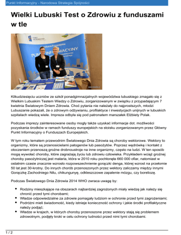 Punkt Informacyjny - Narodowa Strategia Spójności Wielki Lubuski Test o Zdrowiu z funduszami w tle Kilkudziesięciu uczniów ze szkół ponadgimnazjalnych województwa lubuskiego zmagało się z Wielkim Lubuskim Testem Wiedzy o Zdrowiu, zorganizowanym w związku z przypadającym 7 kwietnia Światowym Dniem Zdrowia. Choć pytania nie należały do najprostszych, młodzi Lubuszanie pokazali, że o zdrowym odżywianiu, profilaktyce i inwestycjach unijnych w lubuskich szpitalach wiedzą wiele. Impreza odbyła się pod patronatem marszałek Elżbiety Polak. Podczas imprezy zainteresowane osoby mogły także uzyskać informacje dot. możliwości pozyskania środków w ramach funduszy europejskich na stoisku zorganizowanym przez Główny Punkt Informacyjny o Funduszach Europejskich. W tym roku tematem przewodnim Światowego Dnia Zdrowia są choroby wektorowe. Wektory to organizmy, które są przenosicielami patogenów lub pasożytów. Poprzez wędrówkę i kontakt z otoczeniem przenoszą groźne drobnoustroje na inne organizmy, często na ludzi. W ten sposób mogą wywołać choroby, które zagrażają życiu lub zdrowiu człowieka. Przykładem wciąż groźnej choroby pasożytniczej jest malaria, która w 2010 roku pochłonęła 660 000 ofiar, natomiast w ostatnim czasie znacznie wzrosło rozpowszechnienie gorączki denga, której wzrost na przełomie 50 lat jest 30-krotny. Do innych chorób przenoszonych przez wektory zaliczamy między innymi Gorączkę Zachodniego Nilu, chikungunyę, odkleszczowe zapalenie mózgu, czy boreliozę. Podczas Światowego Dnia Zdrowia 2014 WHO zwraca uwagę by: Rodziny mieszkające na obszarach najbardziej zagrożonych miały wiedzę jak należy się chronić przed tymi chorobami; Władze odpowiedzialne za zdrowie pomagały ludziom w ochronie przed tymi zagrożeniami; Podróżni mieli świadomość, kiedy istnieje konieczność ochrony i jakie środki profilaktyczne należy podjąć; Władze w krajach, w których choroby przenoszone przez wektory stają się problemem zdrowotnym, podjęły kroki w celu ochrony ludności przed nimi tymi chorobami. 1/2 Punkt Informacyjny - Narodowa Strategia Spójności Upominki dla uczestników przygotował Główny Punkt Informacyjny o Funduszach Europejskich. Galeria 2/2