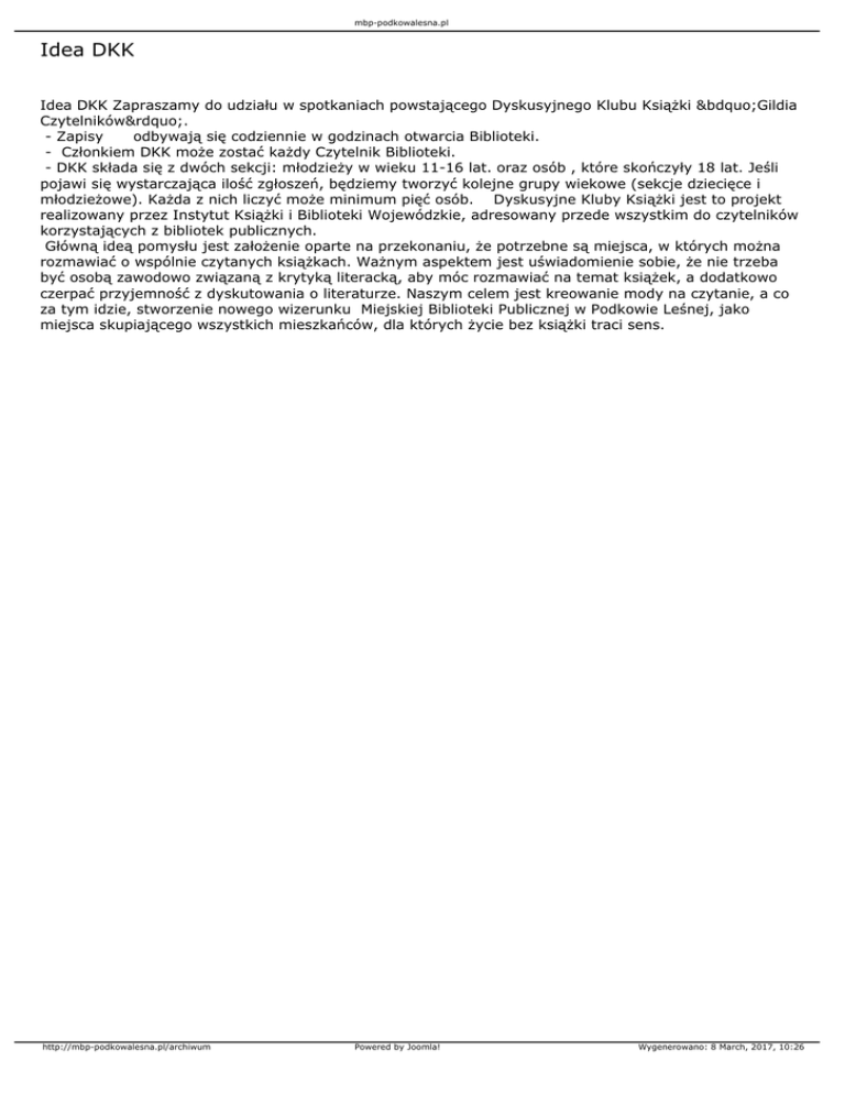mbp-podkowalesna.pl Idea DKK Idea DKK Zapraszamy do udziału w spotkaniach powstającego Dyskusyjnego Klubu Książki „Gildia Czytelników”. - Zapisy odbywają się codziennie w godzinach otwarcia Biblioteki. - Członkiem DKK może zostać każdy Czytelnik Biblioteki. - DKK składa się z dwóch sekcji: młodzieży w wieku 11-16 lat. oraz osób , które skończyły 18 lat. Jeśli pojawi się wystarczająca ilość zgłoszeń, będziemy tworzyć kolejne grupy wiekowe (sekcje dziecięce i młodzieżowe). Każda z nich liczyć może minimum pięć osób. Dyskusyjne Kluby Książki jest to projekt realizowany przez Instytut Książki i Biblioteki Wojewódzkie, adresowany przede wszystkim do czytelników korzystających z bibliotek publicznych. Główną ideą pomysłu jest założenie oparte na przekonaniu, że potrzebne są miejsca, w których można rozmawiać o wspólnie czytanych książkach. Ważnym aspektem jest uświadomienie sobie, że nie trzeba być osobą zawodowo związaną z krytyką literacką, aby móc rozmawiać na temat książek, a dodatkowo czerpać przyjemność z dyskutowania o literaturze. Naszym celem jest kreowanie mody na czytanie, a co za tym idzie, stworzenie nowego wizerunku Miejskiej Biblioteki Publicznej w Podkowie Leśnej, jako miejsca skupiającego wszystkich mieszkańców, dla których życie bez książki traci sens. http://mbp-podkowalesna.pl/archiwum Powered by Joomla! Wygenerowano: 8 March, 2017, 10:26