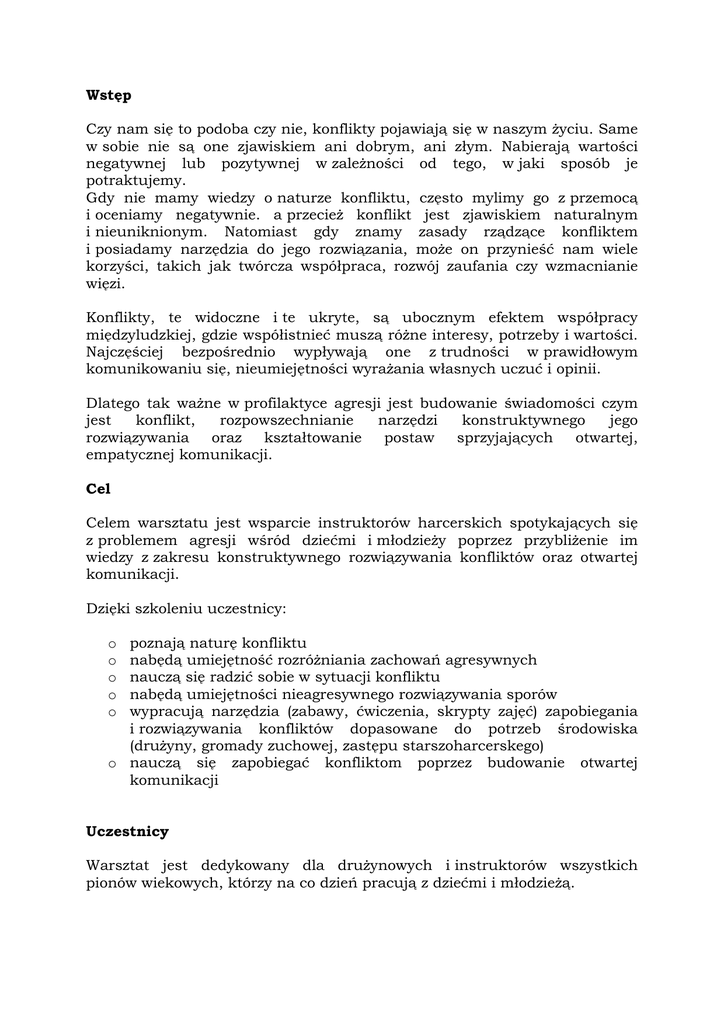 Wstęp Czy nam się to podoba czy nie, konflikty pojawiają się w naszym Ŝyciu. Same w sobie nie są one zjawiskiem ani dobrym, ani złym. Nabierają wartości negatywnej lub pozytywnej w zaleŜności od tego, w jaki sposób je potraktujemy. Gdy nie mamy wiedzy o naturze konfliktu, często mylimy go z przemocą i oceniamy negatywnie. a przecieŜ konflikt jest zjawiskiem naturalnym i nieuniknionym. Natomiast gdy znamy zasady rządzące konfliktem i posiadamy narzędzia do jego rozwiązania, moŜe on przynieść nam wiele korzyści, takich jak twórcza współpraca, rozwój zaufania czy wzmacnianie więzi. Konflikty, te widoczne i te ukryte, są ubocznym efektem współpracy międzyludzkiej, gdzie współistnieć muszą róŜne interesy, potrzeby i wartości. Najczęściej bezpośrednio wypływają one z trudności w prawidłowym komunikowaniu się, nieumiejętności wyraŜania własnych uczuć i opinii. Dlatego tak waŜne w profilaktyce agresji jest budowanie świadomości czym jest konflikt, rozpowszechnianie narzędzi konstruktywnego jego rozwiązywania oraz kształtowanie postaw sprzyjających otwartej, empatycznej komunikacji. Cel Celem warsztatu jest wsparcie instruktorów harcerskich spotykających się z problemem agresji wśród dziećmi i młodzieŜy poprzez przybliŜenie im wiedzy z zakresu konstruktywnego rozwiązywania konfliktów oraz otwartej komunikacji. Dzięki szkoleniu uczestnicy: poznają naturę konfliktu nabędą umiejętność rozróŜniania zachowań agresywnych nauczą się radzić sobie w sytuacji konfliktu nabędą umiejętności nieagresywnego rozwiązywania sporów wypracują narzędzia (zabawy, ćwiczenia, skrypty zajęć) zapobiegania i rozwiązywania konfliktów dopasowane do potrzeb środowiska (druŜyny, gromady zuchowej, zastępu starszoharcerskego) o nauczą się zapobiegać konfliktom poprzez budowanie otwartej komunikacji o o o o o Uczestnicy Warsztat jest dedykowany dla druŜynowych i instruktorów wszystkich pionów wiekowych, którzy na co dzień pracują z dziećmi i młodzieŜą. Program szkolenia Dzień I 1. Konflikt, kłótnia, spór: o definicja konfliktu o niekonstruktywne przekonania na temat konfliktu o źródła i fazy konfliktu o niekonstruktywne strategie rozwiązywania konfliktów o pozytywna siła konfliktu 2. Analiza specyfiki konfliktów w środowiskach harcerskich konflikt a wiek uczestników 3. Agresja a konflikt o charakterystyka zachowań agresywnych o asertywność – droga wspierania zachowań nieagresywnych 4. Emocje w konflikcie o trzy podstawowe emocje złości, strachu i bólu o nauka konstruktywnego wyraŜania emocji negatywnych i pozytywnych 5. Komunikacja w konflikcie: o rola aktywnego, wspierającego słuchania i informacji w konflikcie o narzędzia aktywnego słuchania: parafraza, odzwierciedlenie o budowania informacji zwrotnej o rozwój umiejętności własnych w zakresie komunikacji o narzędzia otwartej komunikacji w słuŜbie profilaktyki agresji zwrotnej 6. Konstruktywne kłótnie o 6 reguł właściwego sposobu prowadzenia kłótni o trójfazowy sposób postępowania w konflikcie: odreagowanie afektów, poszukiwanie rozwiązania, realizacja rozwiązania o rytuały prowadzenia kłótni 7. Rozpoznanie własnych mocnych i słaby stron w zakresie zapobiegania i rozwiązywania konfliktów Dzień II 1. Rola druŜynowego, instruktora w procesie rozwiązywania konfliktów druŜynowy, instruktor jako mediator – wprowadzenie pojęcia mediacji wykorzystanie narzędzi otwartej komunikacji w mediacji konfliktu 2. Dostosowanie narzędzi konstruktywnej kłótni oraz metod budowania otwartej komunikacji do potrzeb środowiska druŜyny, gromady zuchowej tworzenie scenariuszy ćwiczeń, zbiórek 3. harcerskie rytuały konstruktywnej kłótni Opis metody Warsztat będzie realizowany metodami aktywnymi, pobudzającymi zaangaŜowanie uczestników i wzmacniającymi proces uczenia się. Gry: symulowane sytuacje o wielowątkowym scenariuszu, normach, celu i strukturze, których realizacja dostarcza uczestnikom licznych pozytywnych wzmocnień motywujących ich do uczenia się i kształtowania kompetencji posiadają ogromny potencjał motywacyjny przyjmuje formę relaksującą i rekreacyjną Ćwiczenie egzystencjalne: forma eksperymentu którego uczestnicy sprawdzają na sobie prawidłowości stanowiące podłoŜe nabywanych kompetencji lub podejmują działania, których efektem jest samodzielnie wyciągnięcie wniosków z pojawiających się przesłanek efekt to wysokie zaangaŜowanie uczestników, duŜa skuteczność w przyswajaniu wiedzy Burza mózgów: opiera się na generowaniu przez uczestników jak największej liczby pomysłów, rozwiązań problemu lub skojarzeń na zadany temat wyzwala potencjał twórczy uczestników, weryfikuje ich doświadczenia i przekonania oraz tworzy swoisty mechanizm grupowej samo edukacji Analiza przypadków: jest metodą indywidualnej lub grupowej analizy i poszukiwania rozwiązań problemów przedstawionych przez trenera lub sformułowanych przez grupę rozwiązania są prezentowane na forum, analizowane i adaptowane zaletą tej techniki jest aktywizowanie grupy do wspólnej pracy Odgrywanie ról: polega na odtwarzaniu przez uczestników realistycznych sytuacji poprzez odgrywanie ról przez dobrane do nich osoby technika ta stanowi sposób uczenia się przez przeŜywanie, najskuteczniejszy ze sposobów weryfikacji doświadczeń i zdobywania nowych umiejętności Modelowanie zachowań: jest metodą kształtowania nowych sposobów zachowań, zwłaszcza dotyczących sfery kontaktów międzyludzkich trener modelując zachowania pokazuje uczestnikom właściwy sposób zachowania oraz pobudza do ich trenowania. Czas trwania Warsztat będzie trwał 12 godzin szkoleniowych (półtora dnia) w dwóch spotkaniach. Transfer wiedzy i umiejętności do środowiska Dwa bloki szkolenia, w rozłoŜone w odstępie czasu umoŜliwiają uczestnikom przeniesienie nabytej wiedzy do środowiska druŜyny, gromady zuchow