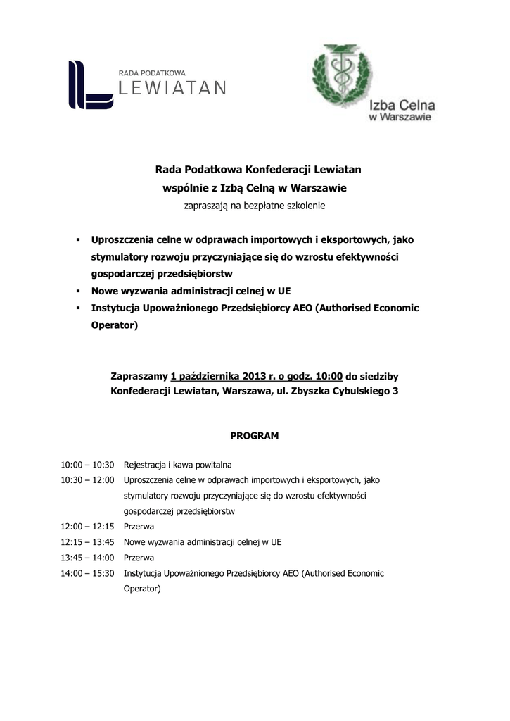 Rada Podatkowa Konfederacji Lewiatan wspólnie z Izb Celn w Warszawie zapraszaj na bezp atne szkolenie Uproszczenia celne w odprawach importowych i eksportowych, jako stymulatory rozwoju przyczyniaj ce si do wzrostu efektywno ci gospodarczej przedsi biorstw Nowe wyzwania administracji celnej w UE Instytucja Upowa nionego Przedsi biorcy AEO (Authorised Economic Operator) Zapraszamy 1 pa dziernika 2013 r. o godz. 10:00 do siedziby Konfederacji Lewiatan, Warszawa, ul. Zbyszka Cybulskiego 3 PROGRAM 10:00 – 10:30 Rejestracja i kawa powitalna 10:30 – 12:00 Uproszczenia celne w odprawach importowych i eksportowych, jako stymulatory rozwoju przyczyniaj ce si do wzrostu efektywno ci gospodarczej przedsi biorstw 12:00 – 12:15 Przerwa 12:15 – 13:45 Nowe wyzwania administracji celnej w UE 13:45 – 14:00 Przerwa 14:00 – 15:30 Instytucja Upowa nionego Przedsi biorcy AEO (Authorised Economic Operator) Proces globalizacji, wzrost aktywno ci gospodarczej oraz akty bezprawnej ingerencji spowodowa y zmian podej cia wiatowej Organizacji C a do zabezpieczenia przep ywu towarów w mi dzynarodowych jednocze nie cuchach dostaw oraz do ochrony zdrowia i wprowadzenie administracyjn i celn p ynno zdrowia i regulacji prawnych i innowacyjnych ycia ludzi. Wymusi o to rozwi za u atwiaj cych towarow z zachowaniem ochrony handlu mi dzynarodowego oraz ycia ludzi. Wprowadzenie do porz dku prawnego instytucji AEO (z ang. Authorised Economic Operator) ugruntowa o transparentne podej cie do operacji celnych, wp yn o na zwi kszenie wolumenu u atwie oferowanych dla wiarygodnych i wyp acalnych przedsi biorców oraz blisk wspó prac organów celnych z podmiotami gospodarczymi. Posiadanie certyfikatu gwarantuje atwienia w realizacji wszelkich czynno ci wymagaj cych kontaktu ze s bami celnymi oraz przyspiesza rozpatrywanie sk adanych wniosków. Dzia ania wspó czesnej administracji celnej zmierzaj do ci ego podnoszenia jako ci i usprawniania pracy na rzecz podmiotów korzystaj cych z szerokiego spektrum u atwie , które maj wyeliminowa uci liwo ci zwi zane z obs ug celn . Sukcesywnie identyfikowane i likwidowane bariery i obci enia administracyjne oraz wprowadzane innowacyjne mechanizmy i narz dzia w postaci selektywnych oraz efektywnych kontroli wp ywaj na u atwianie prowadzenia legalnej dzia alno ci biznesowej. Zapraszamy na bezp atne szkolenie organizowane przez Rad Podatkow Konfederacji Lewiatan oraz Izb Celn w Warszawie. Podczas szkolenia poznaj atwego dost pu do uproszcze Pa stwo sposoby korzystania z szybkiego i celnych m.in. procedury uproszczonej w miejscu, zwolnienia z obowi zku przesy ania powiadomienia, okre lenia indywidualnego czasu zwi zanego z przesy aniem komunikatów. Ponadto omówione zostan warunki uzyskania zgody na realizacj procedury uproszczonej poza godzinami pracy urz du celnego oraz na przesy anie powiadomienia przed przybyciem towarów. Konfederacji Lewiatan Andrzej Niko czyk Przewodnicz cy Rady Podatkowej p. o. Zast pcy Dyrektora Izby Celnej w Warszawie komisarz celny Zbigniew Kolanda Prowadzący 1. Anna Babińska ekspert Służby Celnej Zastępuje Naczelnika Wydziału Obsługi Przedsiębiorców, zajmuje się problematyką związaną z badaniem spełniania przez podmioty gospodarcze warunków i kryteriów niezbędnych do przyznania świadectwa upoważnionego przedsiębiorcy AEO oraz udzielenia pozwolenia na stosowanie procedur uproszczonych, współautorka podręcznika: Badanie systemu zarządzania ewidencjami handlowymi i transportowymi przedsiębiorcy w postępowaniu audytowym, realizując jeden z podstawowych kierunków rozwoju strategicznego Służby Celnej zawartej w strategii działania „Służba Celna 2015+” czynnie uczestniczy w konferencjach/szkoleniach dedykowanych przedsiębiorcom z branży logistycznej oraz jest autorką artykułów publikowanych w prasie branżowej tj. „EuroLogistics”, „Truck@Business”, „Transport Manager”, „Logistyka produkcji”.