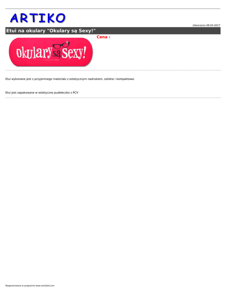 Utworzono 08-03-2017 Etui na okulary "Okulary są Sexy!" Cena : Etui wykonane jest z przyjemnego materiału z estetycznym nadrukiem, solidne i kompaktowe. Etui jest zapakowane w estetyczne pudełeczko z PCV Wygenerowano w programie www.oscGold.com