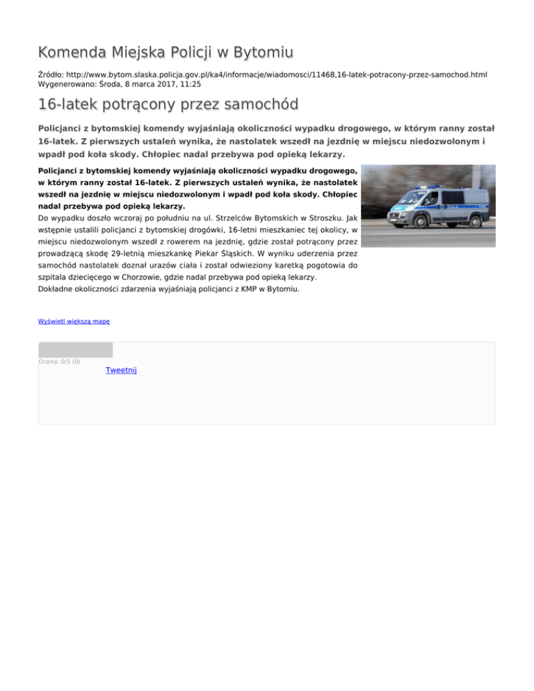 Komenda Miejska Policji w Bytomiu Źródło: http://www.bytom.slaska.policja.gov.pl/ka4/informacje/wiadomosci/11468,16-latek-potracony-przez-samochod.html Wygenerowano: Środa, 8 marca 2017, 11:25 16-latek potrącony przez samochód Policjanci z bytomskiej komendy wyjaśniają okoliczności wypadku drogowego, w którym ranny został 16-latek. Z pierwszych ustaleń wynika, że nastolatek wszedł na jezdnię w miejscu niedozwolonym i wpadł pod koła skody. Chłopiec nadal przebywa pod opieką lekarzy. Policjanci z bytomskiej komendy wyjaśniają okoliczności wypadku drogowego, w którym ranny został 16-latek. Z pierwszych ustaleń wynika, że nastolatek wszedł na jezdnię w miejscu niedozwolonym i wpadł pod koła skody. Chłopiec nadal przebywa pod opieką lekarzy. Do wypadku doszło wczoraj po południu na ul. Strzelców Bytomskich w Stroszku. Jak wstępnie ustalili policjanci z bytomskiej drogówki, 16-letni mieszkaniec tej okolicy, w miejscu niedozwolonym wszedł z rowerem na jezdnię, gdzie został potrącony przez prowadzącą skodę 29-letnią mieszkankę Piekar Śląskich. W wyniku uderzenia przez samochód nastolatek doznał urazów ciała i został odwieziony karetką pogotowia do szpitala dziecięcego w Chorzowie, gdzie nadal przebywa pod opieką lekarzy. Dokładne okoliczności zdarzenia wyjaśniają policjanci z KMP w Bytomiu. Wyświetl większą mapę Ocena: 0/5 (0) Tweetnij