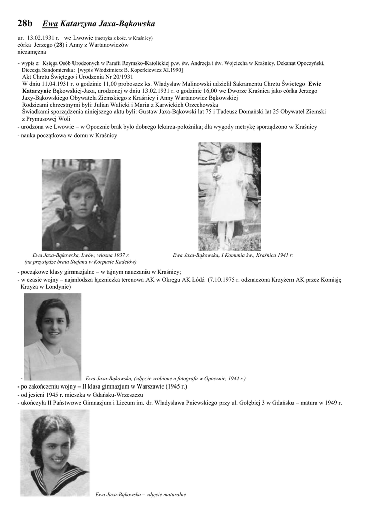 28b Ewa Katarzyna Jaxa-Bąkowska ur. 13.02.1931 r. we Lwowie (metryka z kośc. w Kraśnicy) córka Jerzego (28) i Anny z Wartanowiczów niezamężna - wypis z: Księga Osób Urodzonych w Parafii Rzymsko-Katolickiej p.w. św. Andrzeja i św. Wojciecha w Kraśnicy, Dekanat Opoczyński, Diecezja Sandomierska: [wypis Włodzimierz B. Koperkiewicz XI.1990] Akt Chrztu Świętego i Urodzenia Nr 20/1931 W dniu 11.04.1931 r. o godzinie 11,00 proboszcz ks. Władysław Malinowski udzielił Sakramentu Chrztu Świetego Ewie Katarzynie Bąkowskiej-Jaxa, urodzonej w dniu 13.02.1931 r. o godzinie 16,00 we Dworze Kraśnica jako córka Jerzego Jaxy-Bąkowskiego Obywatela Ziemskiego z Kraśnicy i Anny Wartanowicz Bąkowskiej Rodzicami chrzestnymi byli: Julian Walicki i Maria z Karwickich Orzechowska Świadkami sporządzenia niniejszego aktu byli: Gustaw Jaxa-Bąkowski lat 75 i Tadeusz Domański lat 25 Obywatel Ziemski z Prymusowej Woli - urodzona we Lwowie – w Opocznie brak było dobrego lekarza-położnika; dla wygody metrykę sporządzono w Kraśnicy - nauka początkowa w domu w Kraśnicy Ewa Jaxa-Bąkowska, Lwów, wiosna 1937 r. (na przysiędze brata Stefana w Korpusie Kadetów) Ewa Jaxa-Bąkowska, I Komunia św., Kraśnica 1941 r. - począkowe klasy gimnazjalne – w tajnym nauczaniu w Kraśnicy; - w czasie wojny – najmłodsza łączniczka terenowa AK w Okręgu AK Łódź (7.10.1975 r. odznaczona Krzyżem AK przez Komisję Krzyża w Londynie) Ewa Jaxa-Bąkowska, (zdjęcie zrobione u fotografa w Opocznie, 1944 r.) - po zakończeniu wojny – II klasa gimnazjum w Warszawie (1945 r.) - od jesieni 1945 r. mieszka w Gdańsku-Wrzeszczu - ukończyła II Państwowe Gimnazjum i Liceum im. dr. Władysława Pniewskiego przy ul. Gołębiej 3 w Gdańsku – matura w 1949 r. Ewa Jaxa-Bąkowska – zdjęcie maturalne - ukończyła technologię żywności na wydz. chemii Politechniki Gdańskiej (1953 r.) - po studiach pracowała w Gdańskim Przedsiębiorstwie Produkcji Niedrzewnej „Las” w Sopocie (do 1965 r.) jako szef działu produkcji - w 1959 r. uzyskała magisterium na SGGW w Warszawie - pracowała od 1965 r. w Przeds. „Polcargo” Rzeczoznastwo i Kontrola Ładunków w Obrocie Międzynarodowym w Gdyni – jako rzeczoznawca, potem ekspert – do emerytury w 1990 r. Ewa Jaxa-Bąkowska, zdjęcie z 2002 r. Ewa Jaxa-Bąkowska, c. Jerzego Adolfa przekazuje do Muzeum w Opocznie oryginał podziękowania mjr. Henryka Dobrzańskiego – Hubala za podarowanego mu przez Annę Jaxa-Bąkowską, matkę Ewy, konia Demona (Opoczno, 2010 r.)