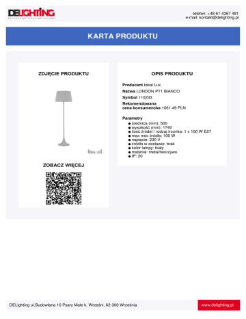 telefon: +48 61 4367 481 e-mail: [email protected] KARTA PRODUKTU ZDJĘCIE PRODUKTU OPIS PRODUKTU Producent Ideal Lux Nazwa LONDON PT1 BIANCO Symbol 110233 Rekomendowana cena konsumencka 1061.49 PLN Parametry ● średnica (mm): 500 ● wysokość (mm): 1740 ● ilość źródeł / rodzaj trzonka: 1 x 100 W E27 ● max moc źródła: 100 W ● napięcie: 230 V ● źródło w zestawie: brak ● kolor lampy: biały ● materiał: metal/tworzywo ● IP: 20 ZOBACZ WIĘCEJ DELighting ul.Budowlana 10 Psary Małe k. Wrześni, 62-300 Września www.delighting.pl