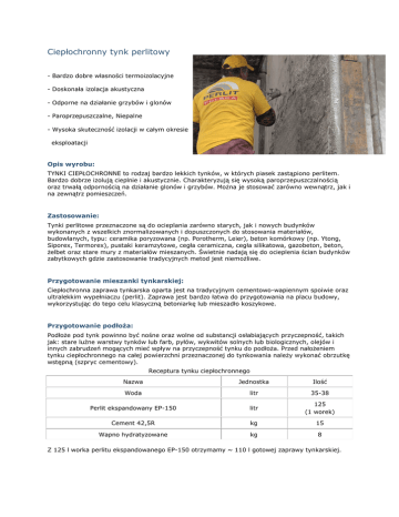 Ciepłochronny tynk perlitowy - Bardzo dobre własności termoizolacyjne - Doskonała izolacja akustyczna - Odporne na działanie grzybów i glonów - Paroprzepuszczalne, Niepalne - Wysoka skuteczność izolacji w całym okresie eksploatacji Opis wyrobu: TYNKI CIEPŁOCHRONNE to rodzaj bardzo lekkich tynków, w których piasek zastąpiono perlitem. Bardzo dobrze izolują cieplnie i akustycznie. Charakteryzują się wysoką paroprzepuszczalnością oraz trwałą odpornością na działanie glonów i grzybów. Można je stosować zarówno wewnątrz, jak i na zewnątrz pomieszczeń. Zastosowanie: Tynki perlitowe przeznaczone są do ocieplania zarówno starych, jak i nowych budynków wykonanych z wszelkich znormalizowanych i dopuszczonych do stosowania materiałów, budowlanych, typu: ceramika poryzowana (np. Porotherm, Leier), beton komórkowy (np. Ytong, Siporex, Termorex), pustaki keramzytowe, cegła ceramiczna, cegła silikatowa, gazobeton, beton, żelbet oraz stare mury z materiałów mieszanych. Świetnie nadają się do ocieplenia ścian budynków zabytkowych gdzie zastosowanie tradycyjnych metod jest niemożliwe. Przygotowanie mieszanki tynkarskiej: Ciepłochronna zaprawa tynkarska oparta jest na tradycyjnym cementowo-wapiennym spoiwie oraz ultralekkim wypełniaczu (perlit). Zaprawa jest bardzo łatwa do przygotowania na placu budowy, wykorzystując do tego celu klasyczną betoniarkę lub mieszadło koszykowe. Przygotowanie podłoża: Podłoże pod tynk powinno być nośne oraz wolne od substancji osłabiających przyczepność, takich jak: stare luźne warstwy tynków lub farb, pyłów, wykwitów solnych lub biologicznych, olejów i innych zabrudzeń mogących mieć wpływ na przyczepność tynku do podłoża. Przed nałożeniem tynku ciepłochronnego na całej powierzchni przeznaczonej do tynkowania należy wykonać obrzutkę wstępną (szpryc cementowy). Receptura tynku ciepłochronnego Nazwa Jednostka Ilość Woda litr 35-38 Perlit ekspandowany EP-150 litr 125 (1 worek) Cement 42,5R kg 15 Wapno hydratyzowane kg 8 Z 125 l worka perlitu ekspandowanego EP-150 otrzymamy ~ 110 l gotowej zaprawy tynkarskiej. Mieszanie: Poszczególne składniki należy dodawać w kolejności: woda - cement - wapno - perlit, a czas mieszania nie powinien przekraczać 2-3 minut. Po wymieszaniu należy sprawdzić konsystencję zaprawy i ewentualnie skorygować ilość dodawanej wody. W przypadku stosowania włókien polipropylenowych należy je wstępnie wymieszać na sucho z niewielką ilością perlitu (10l). Tak przygotowany premiks dodajemy do urządzenia mieszającego bezpośrednio po zadozowaniu wody. Sposób użycia: Tynk należy nanosić ręcznie (kielnia) lub maszynowo (agregat tynkarski) minimum 48 h po wykonaniu warstwy sczepnej. W zależności od grubości zaprawę tynkarską nakładamy w jednej lub kilku warstwach. Maksymalna grubość pojedynczej warstwy nie powinna przekraczać 25 mm. Nakładanie następnej warstwy możemy rozpocząć po uzyskaniu odpowiedniej nośności przez poprzednią warstwę, tj. po minimum 24 h od jej nałożenia. Świeżo nałożoną zaprawę tynkarską ściągnąć drewnianą lub metalową łatą. Nie wygładzać i nie zacierać! W okresie wstępnego wiązania zaprawy tynkarskiej (tj. około 1 tygodnia) należy ją chronić przed gwałtownym wysychaniem spowodowanym przez bezpośrednie działanie promieni słonecznych oraz wiatr (stosowanie siatek ochronnych, zwilżanie powierzchni wodą). Przerwa technologiczna - 5 dni na każdy 1 cm grubości tynku Powłoki wykończeniowe Do wykonania warstwy dekoracyjno-ochronnej należy stosować tynki paroprzepuszczalne, tj.: tynki mineralne, krzemianowe (silikatowe), polikrzemianowe lub silikonowe. Przed nałożeniem tynku dekoracyjnego zaleca się wykonać warstwę pośrednią. Warstwę pośrednią wykonujemy z zaprawy klejowo-szpachlowej z siatką. Temperatura stosowania: Temperatura podłoża i otoczenia od + 5ºC do + 30ºC.