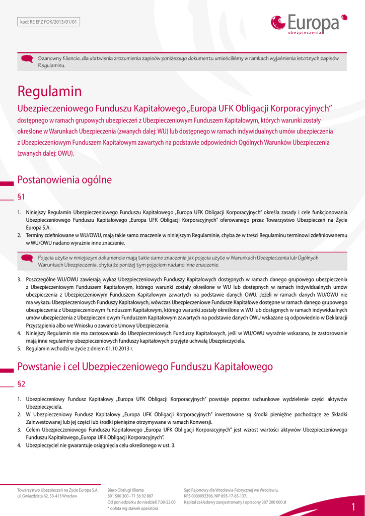 kod: RE EFZ FOK/2013/01/01 Kliencie, dla ułatwienia zrozumienia zapisów poniższego dokumentu umieściliśmy w ramkach wyjaśnienia istotnych zapisów >> Szanowny Regulaminu. Regulamin Ubezpieczeniowego Funduszu Kapitałowego „Europa UFK Obligacji Korporacyjnych” dostępnego w ramach grupowych ubezpieczeń z Ubezpieczeniowym Funduszem Kapitałowym, których warunki zostały określone w Warunkach Ubezpieczenia (zwanych dalej: WU) lub dostępnego w ramach indywidualnych umów ubezpieczenia z Ubezpieczeniowym Funduszem Kapitałowym zawartych na podstawie odpowiednich Ogólnych Warunków Ubezpieczenia (zwanych dalej: OWU). Postanowienia ogólne §1 1. Niniejszy Regulamin Ubezpieczeniowego Funduszu Kapitałowego „Europa UFK Obligacji Korporacyjnych” określa zasady i cele funkcjonowania Ubezpieczeniowego Funduszu Kapitałowego „Europa UFK Obligacji Korporacyjnych” oferowanego przez Towarzystwo Ubezpieczeń na Życie Europa S.A. 2. Terminy zdefiniowane w WU/OWU, mają takie samo znaczenie w niniejszym Regulaminie, chyba że w treści Regulaminu terminowi zdefiniowanemu w WU/OWU nadano wyraźnie inne znaczenie. użyte w niniejszym dokumencie mają takie same znaczenie jak pojęcia użyte w Warunkach Ubezpieczenia lub Ogólnych >> Pojęcia Warunkach Ubezpieczenia, chyba że poniżej tym pojęciom nadano inne znaczenie. 3. Poszczególne WU/OWU zawierają wykaz Ubezpieczeniowych Funduszy Kapitałowych dostępnych w ramach danego grupowego ubezpieczenia z Ubezpieczeniowym Funduszem Kapitałowym, którego warunki zostały określone w WU lub dostępnych w ramach indywidualnych umów ubezpieczenia z Ubezpieczeniowym Funduszem Kapitałowym zawartych na podstawie danych OWU. Jeżeli w ramach danych WU/OWU nie ma wykazu Ubezpieczeniowych Funduszy Kapitałowych, wówczas Ubezpieczeniowe Fundusze Kapitałowe dostępne w ramach danego grupowego ubezpieczenia z Ubezpieczeniowym Funduszem Kapitałowym, którego warunki zostały określone w WU lub dostępnych w ramach indywidualnych umów ubezpieczenia z Ubezpieczeniowym Funduszem Kapitałowym zawartych na podstawie danych OWU wskazane są odpowiednio w Deklaracji Przystąpienia albo we Wniosku o zawarcie Umowy Ubezpieczenia. 4. Niniejszy Regulamin nie ma zastosowania do Ubezpieczeniowych Funduszy Kapitałowych, jeśli w WU/OWU wyraźnie wskazano, że zastosowanie mają inne regulaminy ubezpieczeniowych funduszy kapitałowych przyjęte uchwałą Ubezpieczyciela. 5. Regulamin wchodzi w życie z dniem 01.10.2013 r. Powstanie i cel Ubezpieczeniowego Funduszu Kapitałowego §2 1. Ubezpieczeniowy Fundusz Kapitałowy „Europa UFK Obligacji Korporacyjnych” powstaje poprzez rachunkowe wydzielenie części aktywów Ubezpieczyciela. 2. W Ubezpieczeniowy Fundusz Kapitałowy „Europa UFK Obligacji Korporacyjnych” inwestowane są środki pieniężne pochodzące ze Składki Zainwestowanej lub jej części lub środki pieniężne otrzymywane w ramach Konwersji. 3. Celem Ubezpieczeniowego Funduszu Kapitałowego „Europa UFK Obligacji Korporacyjnych” jest wzrost wartości aktywów Ubezpieczeniowego Funduszu Kapitałowego „Europa UFK Obligacji Korporacyjnych”. 4. Ubezpieczyciel nie gwarantuje osiągnięcia celu określonego w ust. 3. Towarzystwo Ubezpieczeń na Życie Europa S.A. ul. Gwiaździsta 62, 53-413 Wrocław Biuro Obsługi Klienta 801 500 300 • 71 36 92 887 Od poniedziałku do niedzieli 7.00-22.00 * opłata wg stawek operatora Sąd Rejonowy dla Wrocławia-Fabrycznej we Wrocławiu, KRS 0000092396, NIP 895-17-65-137, Kapitał zakładowy zarejestrowany i opłacony 307 200 000 zł 1 Strategia inwestycyjna Ubezpieczeniowego Funduszu Kapitałowego §3 1. Zarządzający Ubezpieczeniowym Funduszem Kapitałowym „Europa UFK Obligacji Korporacyjnych” dobierając aktywa, w które inwestowane są środki Ubezpieczeniowego Funduszu Kapitałowego „Europa UFK Obligacji Korporacyjnych”, ocenia m.in.: 1) kondycję finansową emitenta dłużnego papieru wartościowego lub instrumentu rynku pieniężnego, 2) perspektywę wzrostu wartości danego papieru wartościowego, 3) sytuację makroekonomiczną w danym kraju, 4) płynność danego papieru wartościowego, 5) prawdopodobieństwo zmian rynkowych stóp procentowych, 6) ryzyko walutowe. >> Powyżej znajdziesz kryteria, którymi kierujemy się przy wyborze aktywów do Funduszu Ubezpieczeniowego. 2. Środki Ubezpieczeniowego Funduszu Kapitałowego „Europa UFK Obligacji Korporacyjnych” mogą być inwestowane w następujące instrumenty finansowe: 1) dłużne papiery wartościowe emitowane lub gwarantowane przez Skarb Państwa lub Narodowy Bank Polski, 2) polskie dłużne papiery wartościowe emitowane przez przedsiębiorstwa i jednostki samorządu terytorialnego, 3) zagraniczne dłużne papiery wartościowe emitowane przez przedsiębiorstwa, 4) bankowe papiery wartościowe, 5) instrumenty rynku pieniężnego, 6) krótkoterminowe depozyty bankowe (nie dłuższe niż 3 miesiące), 7) jednostki uczestnictwa i certyfikaty inwestycyjne polskich oraz zagranicznych funduszy obligacji, 8) Exchange Traded Funds (zwane dalej: ETF) pod warunkiem, że przedmiotem ich inwestycji są dłużne papiery wartościowe lub instrumenty pochodne oparte o dłużne papiery wartościowe i stopę procentową, 9) środki pieniężne. >> Powyżej wymienione zostały instrumenty finansowe, w które inwestujemy środki Funduszu Ubezpieczeniowego. 3. Strategia inwestycyjna Ubezpieczeniowego Funduszu Kapitałowego „Europa UFK Obligacji Korporacyjnych” pozwala na lokowanie minimum 70% środków w polskie dłużne papiery wartościowe emitowane przez przedsiębiorstwa i jednostki samorządu terytorialnego oraz bankowe papiery wartościowe. >> Zwróć uwagę, że docelowo minimum 70% środków Funduszu Ubezpieczeniowego będzie inwestowane w polskie instrumenty finansowe. 4. Strategia dopuszcza przejściowy brak realizacji powyższego założenia z uwagi na konieczność alokacji środków wpłacanych do Ubezpieczeniowego Fundusz