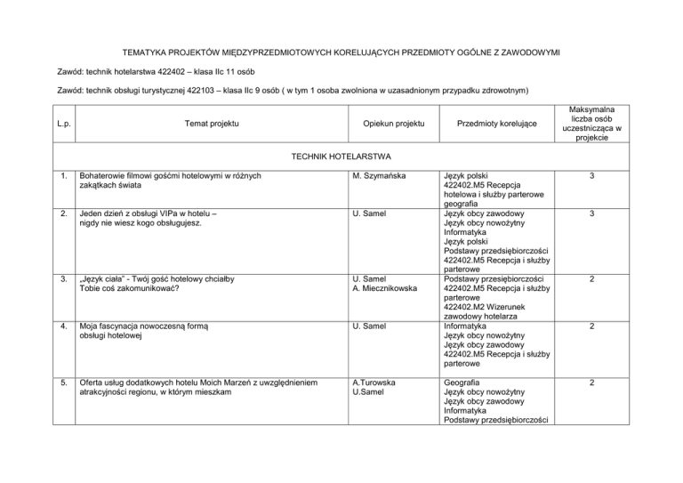 TEMATYKA PROJEKTÓW MIĘDZYPRZEDMIOTOWYCH KORELUJĄCYCH PRZEDMIOTY OGÓLNE Z ZAWODOWYMI Zawód: technik hotelarstwa 422402 – klasa IIc 11 osób Zawód: technik obsługi turystycznej 422103 – klasa IIc 9 osób ( w tym 1 osoba zwolniona w uzasadnionym przypadku zdrowotnym) L.p. Temat projektu Opiekun projektu Przedmioty korelujące Maksymalna liczba osób uczestnicząca w projekcie TECHNIK HOTELARSTWA 1. Bohaterowie filmowi gośćmi hotelowymi w różnych zakątkach świata M. Szymańska 2. Jeden dzień z obsługi VIPa w hotelu – nigdy nie wiesz kogo obsługujesz. U. Samel 3. „Język ciała” - Twój gość hotelowy chciałby Tobie coś zakomunikować? U. Samel A. Miecznikowska 4. Moja fascynacja nowoczesną formą obsługi hotelowej U. Samel 5. Oferta usług dodatkowych hotelu Moich Marzeń z uwzględnieniem atrakcyjności regionu, w którym mieszkam A.Turowska U.Samel Język polski 422402.M5 Recepcja hotelowa i służby parterowe geografia Język obcy zawodowy Język obcy nowożytny Informatyka Język polski Podstawy przedsiębiorczości 422402.M5 Recepcja i służby parterowe Podstawy przesiębiorczości 422402.M5 Recepcja i służby parterowe 422402.M2 Wizerunek zawodowy hotelarza Informatyka Język obcy nowożytny Język obcy zawodowy 422402.M5 Recepcja i służby parterowe 3 Geografia Język obcy nowożytny Język obcy zawodowy Informatyka Podstawy przedsiębiorczości 2 3 2 2 TECHNIK OBSŁUGI TURYSTYCZNEJ 1. Tanie linie lotnicze w Polsce jako element rozwoju turystyki J. Kaczan-Gumińska 2. „W 80 dni dookoła świata” – gra dydaktyczna państwa, miasta, atrakcje turystyczne, morza i oceany. A. Turowska 3. Przewodnik po miastach z punktu widzenia bohaterów literackich w odniesieniu do współczesności M. Szymańska 4. W każdej legendzie jest ziarnko prawdy – czyli wakacje z historią w miastach wojewódzkich Polski. J. Kaczan-Gumińska 5. Unikatowe skarby kultury i dziedzictwa Polski na liście zabytków UNESCO J. Kaczan-Gumińska Geografia Informatyka język obcy nowożytny Podstawy przedsiębiorczości Obsługa turystyczna Geografia Matematyka Obsługa turystyczna Język polski Język obcy nowożytny Geografia Historia Marketing w turystyce informatyka Język polski Geografia Obsługa turystyczna historia Geografia Obsługa turystyczna Historia Język obcy nowożytny 2 3 3 2 2